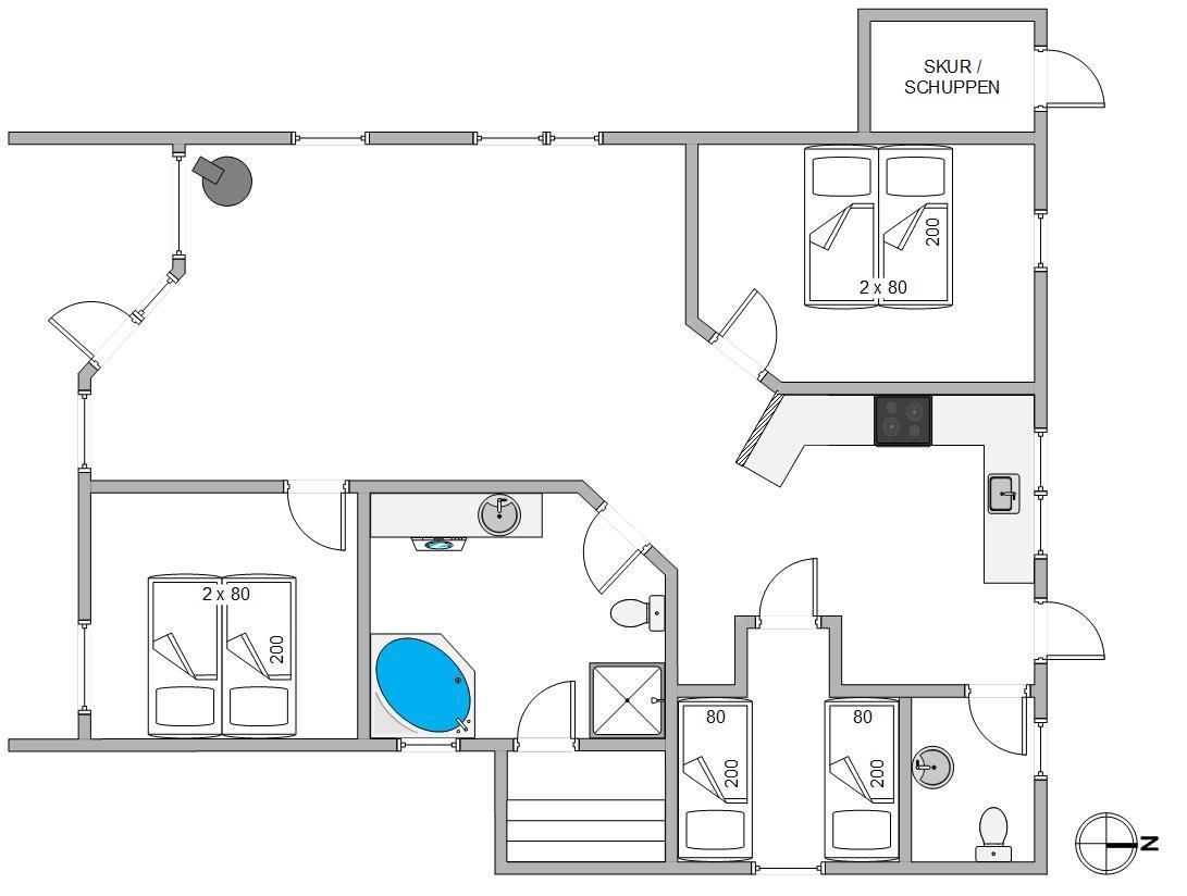 Sommerhuset byder plads til 6 feriegæster, som værdsætter kvalitetstid og den skønne beliggenhed. Planløsningen byder på 3 gode soveværelser, ét gæstetoilet samt stort badeværelse med sauna og spa. Perfekt efter lange gåture langs Vesterhavet eller på en regnvejrsdag. Her kan I for alvor komme ned i gear og mærke de varme spabobler mod kroppen.