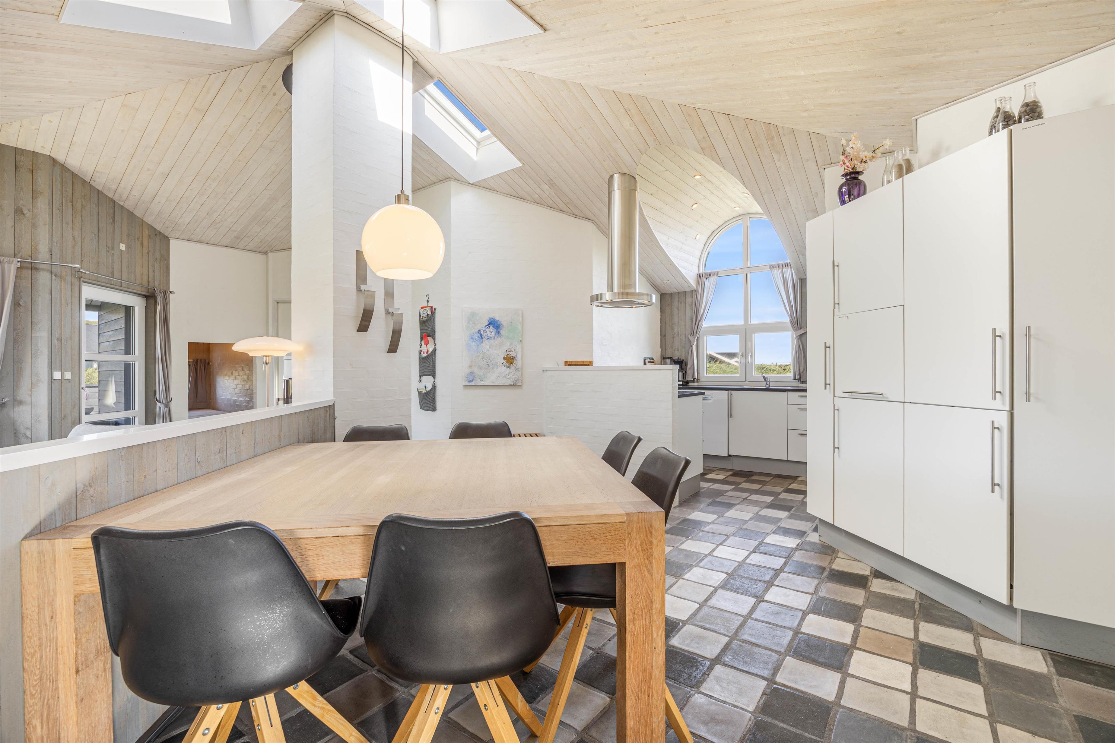 Her er ingen tvivl – feriehusets midtpunkt og hjerte er det centrale opholdsrum med køkkenafdeling, stue og spisestue. Det store, lyse opholdsrum med ovenlysvinduer og brændeovnen i centrum er delt af en halvmur midt i rummet.