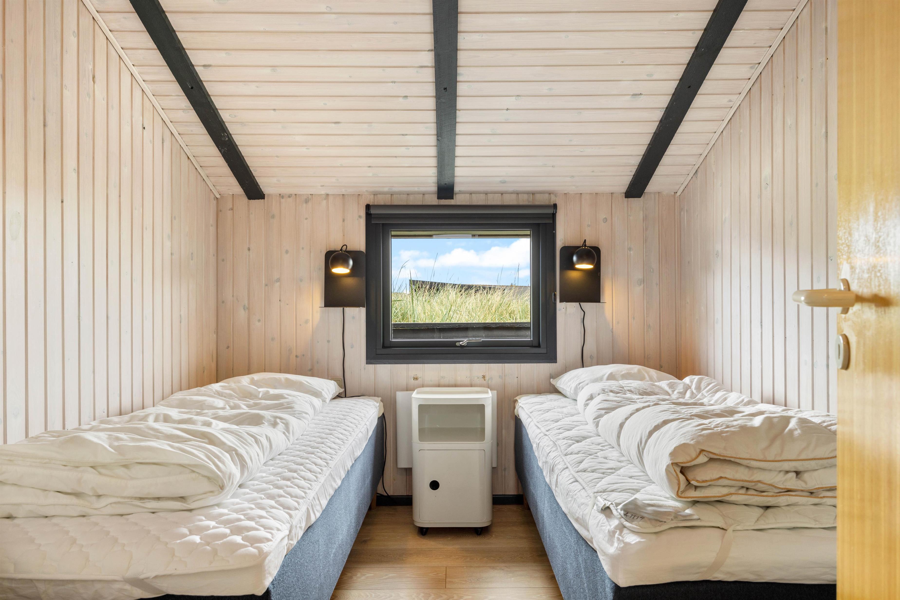 Soveafdelingen i ferieboligen består af 4 individuelle soveværelser - 2 med dobbeltsenge og 2 med enkeltsenge. Det praktisk indrettede og moderne badeværelse har gulvvarme.