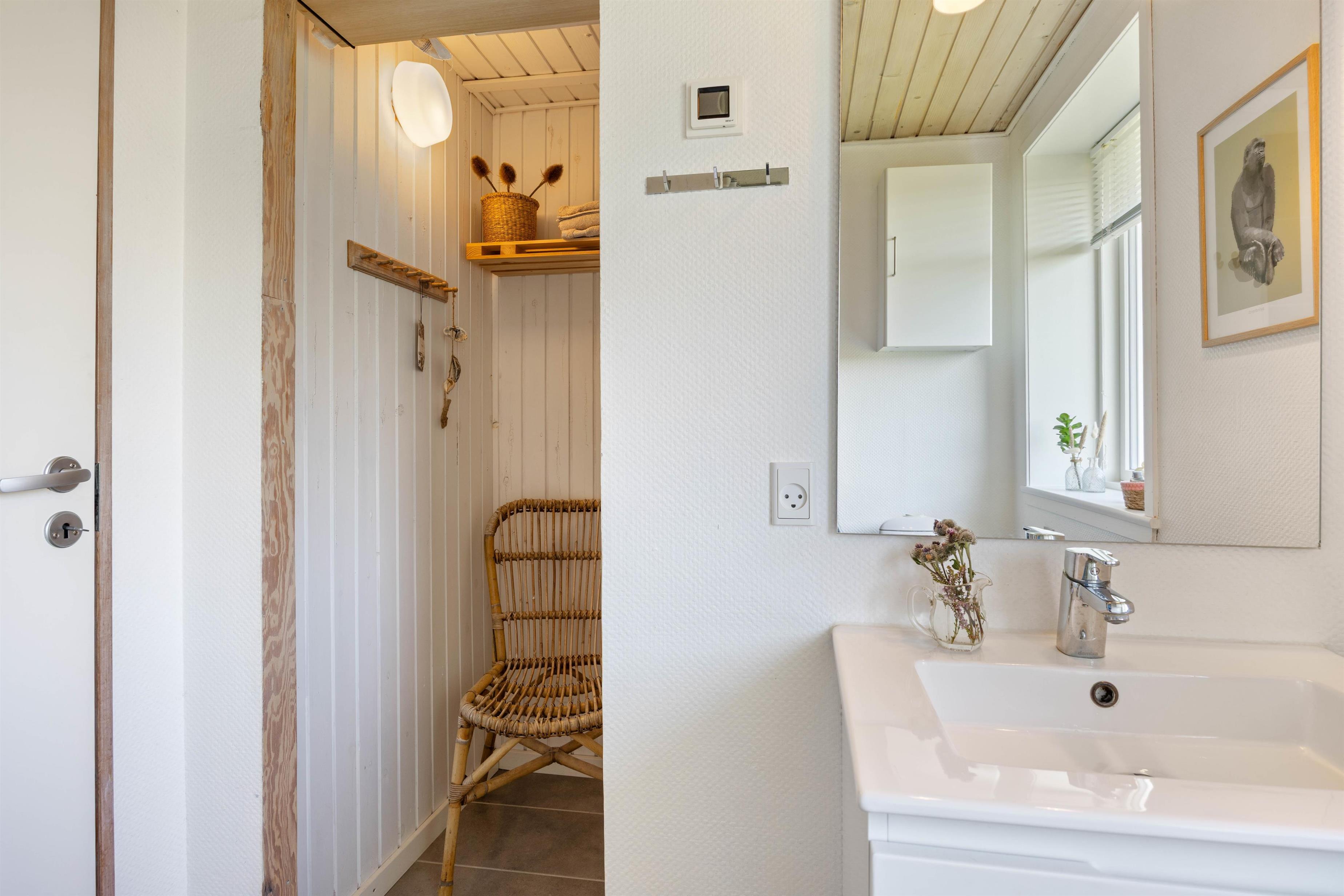 Fra opholdsrummet kan I gå direkte ud på den sydvendte terrasse, hvor I kan nyde de varme sommerdage. Terrassen fortsætter til østsiden af sommerhuset, så I kan drikke en kop kaffe til den skønne udsigt af solopgangen.