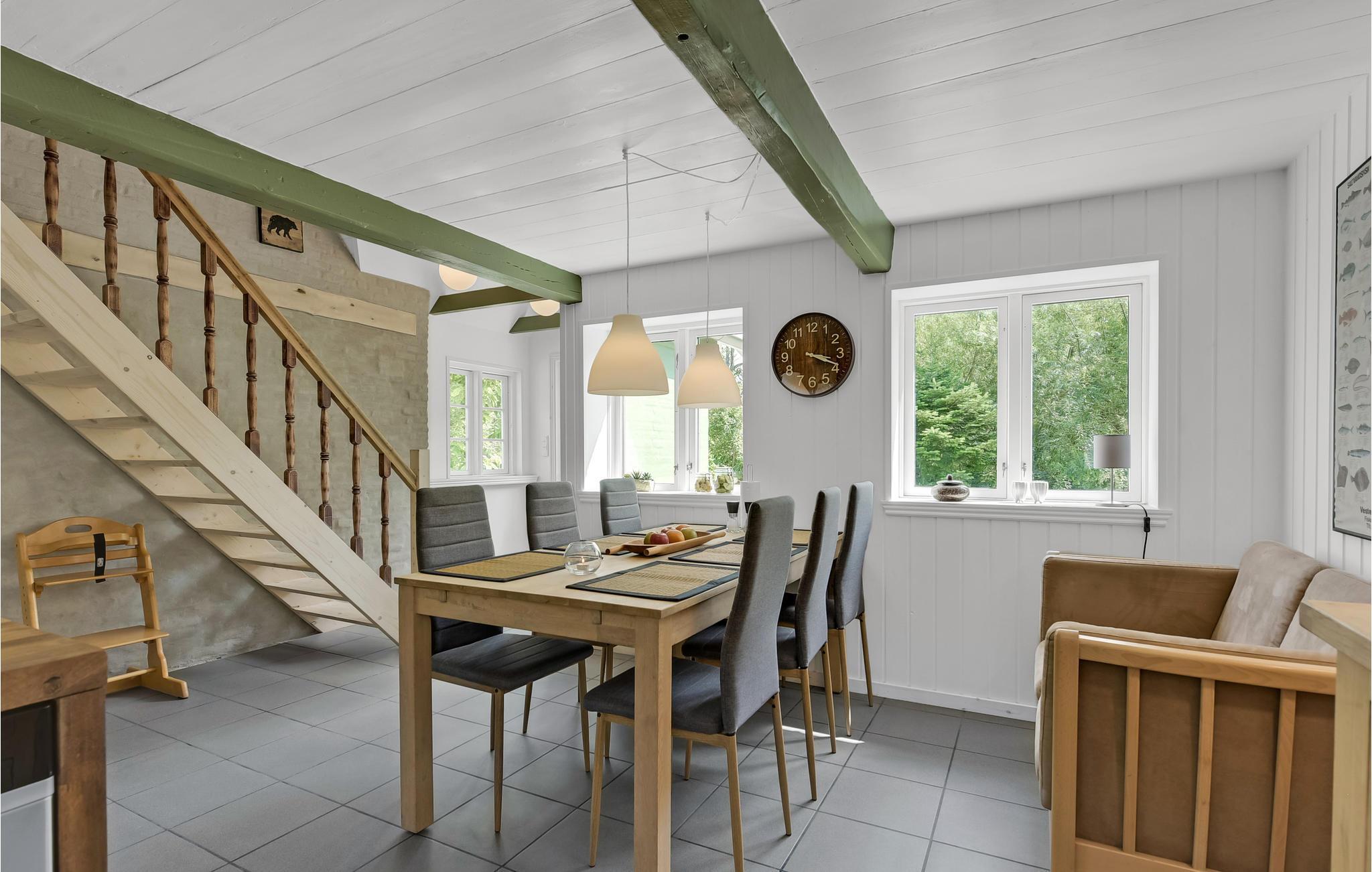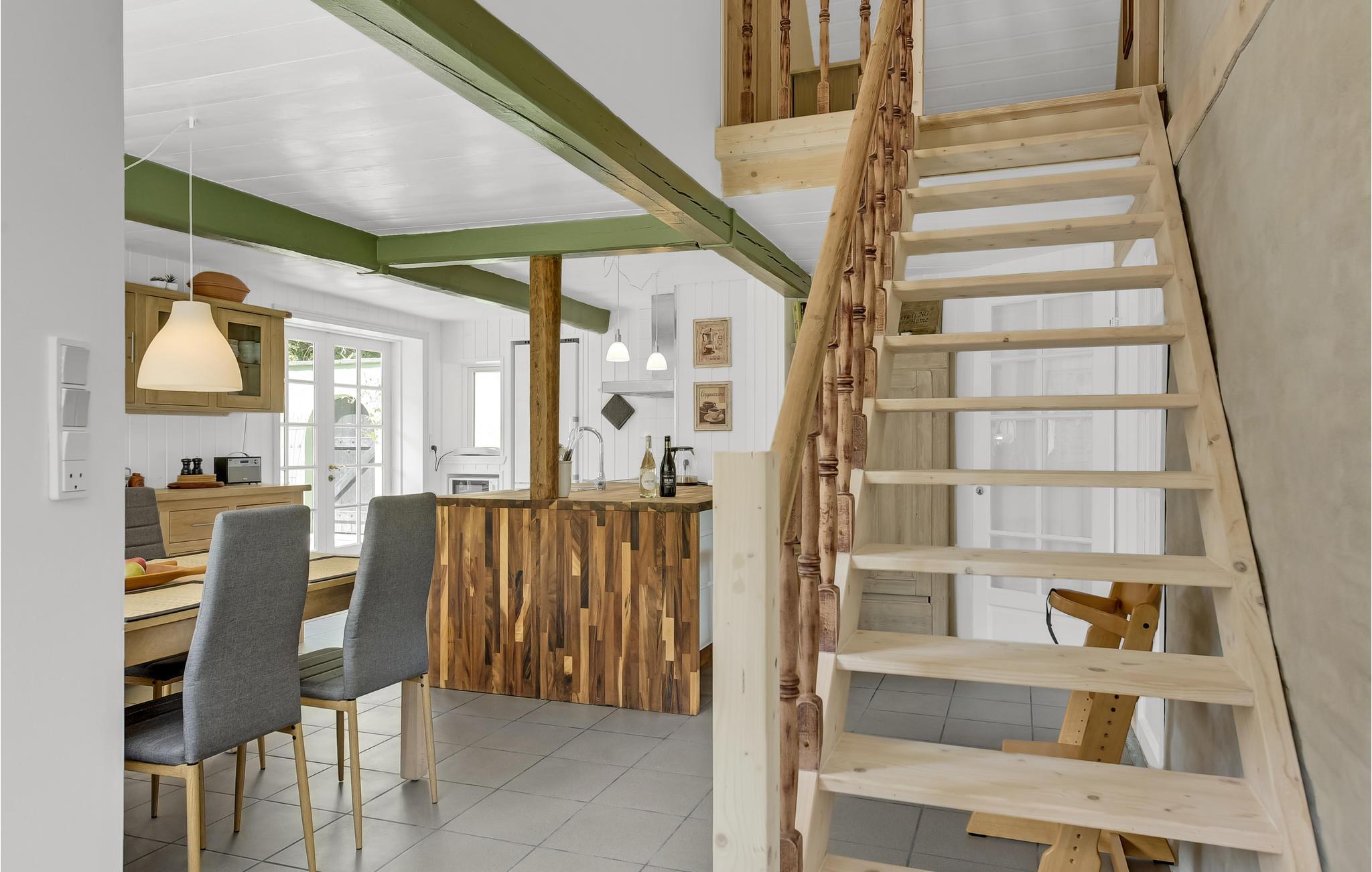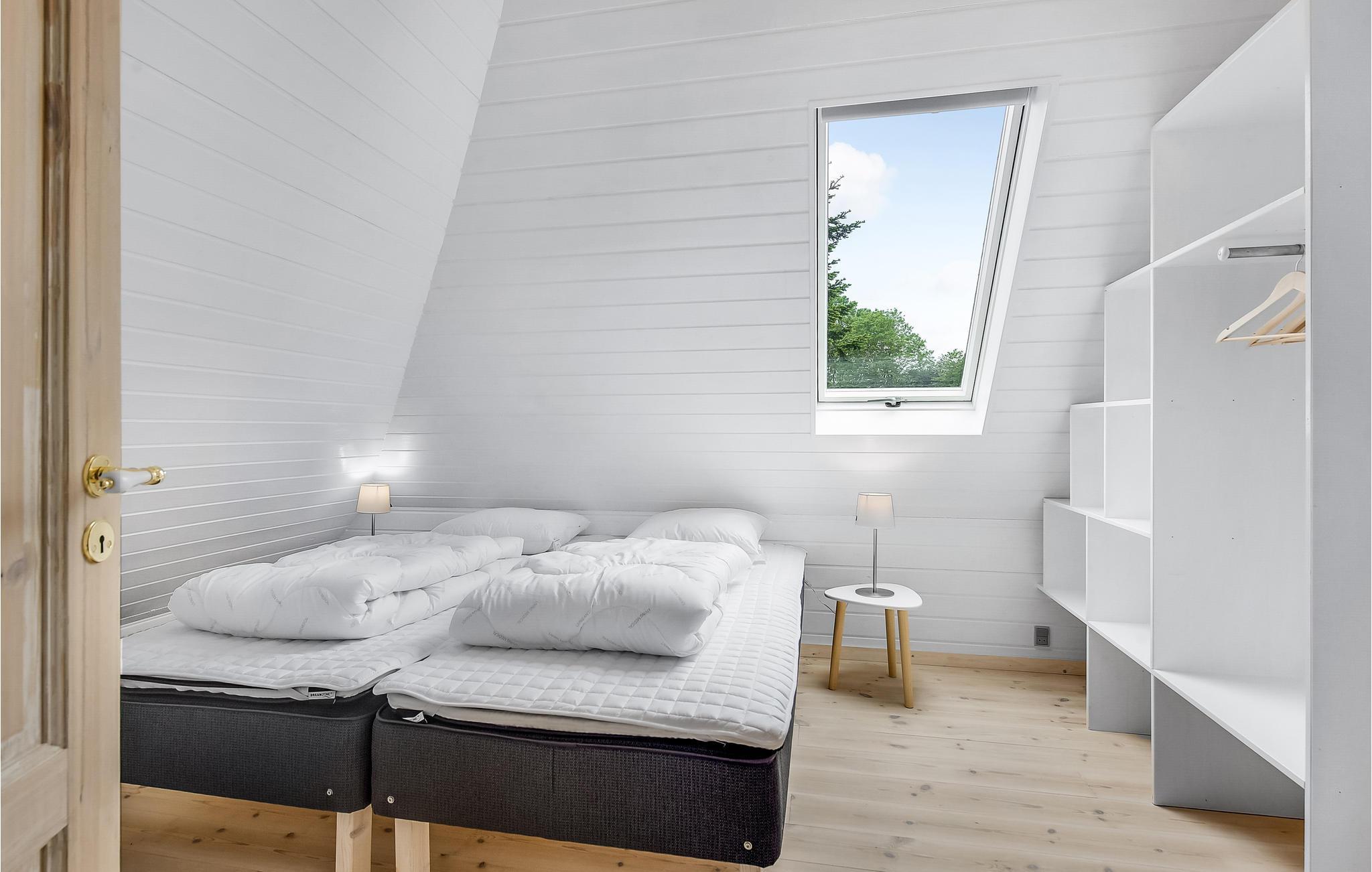 Huset har en rolig placering, og fra grunden er der en fantastisk udsigt til fjordens brede blå linje bag et stykke eng, og længere ude ser I Als. Selve huset byder på gode overnatningsforhold med tre soveværelser, hvoraf to har dobbeltsenge, og det tredje har to enkeltsenge, hvilket giver plads til seks personer. Et af soveværelserne er et gennemgangsrum. I kan se frem til mange hyggelige middage og spilaftener i køkken-alrummet, og efter en tur på stranden, er det skønt at læne sig tilbage i stuen og nyde brændeovnens varm og samme smukke udsigt til fjorden. Loftet over trappen går højt til kip.