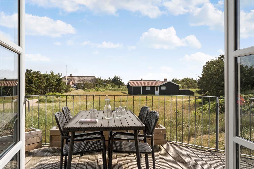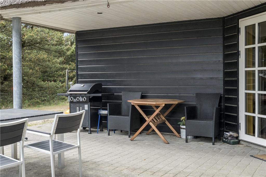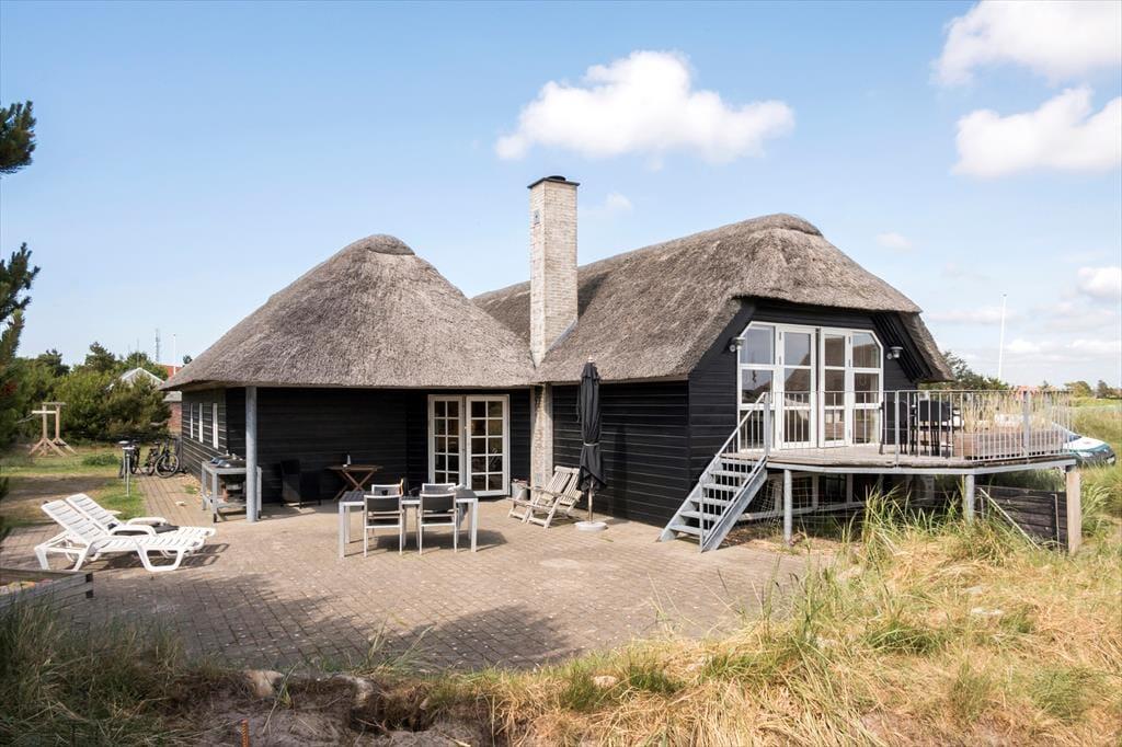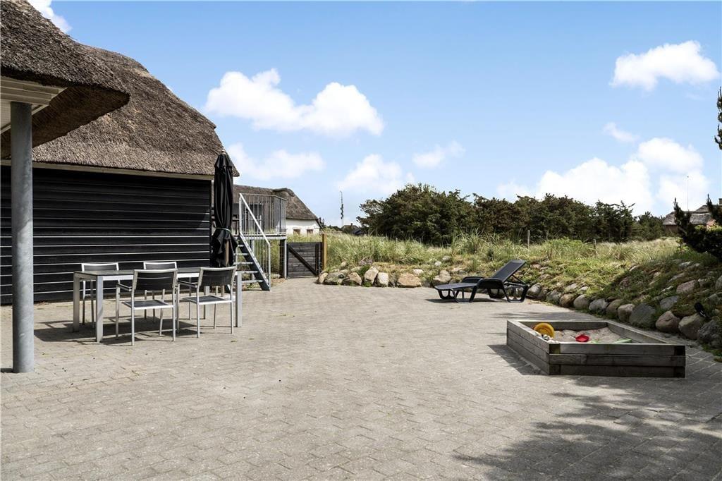 Fra stuen kan I træde direkte ud på den hævede terrasse, som vender mod syd med udsigt over husets store og let kuperede klitgrund. Hvis I foretrækker at sidde i jordhøjde, kan I rykke ned på det flisebelagte terrasseområde, som også har gode solforhold. En del af terrassen er overdækket, og foruden bekvemme havemøbler er der en grill til rådighed, så I kan kokkerere under åben himmel. På grunden er der legefaciliteter til de mindste feriegæster, og hele familien kan dyste i petanque på den dertil indrettede bane.