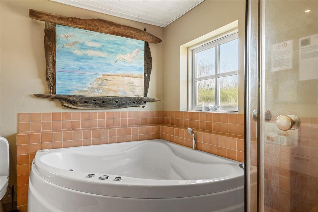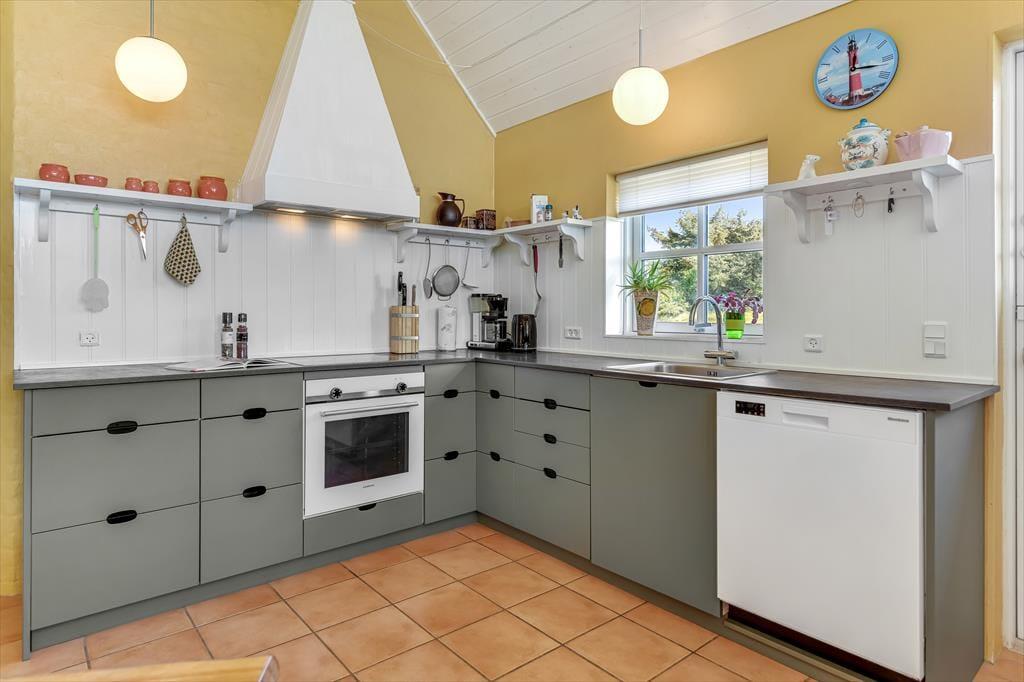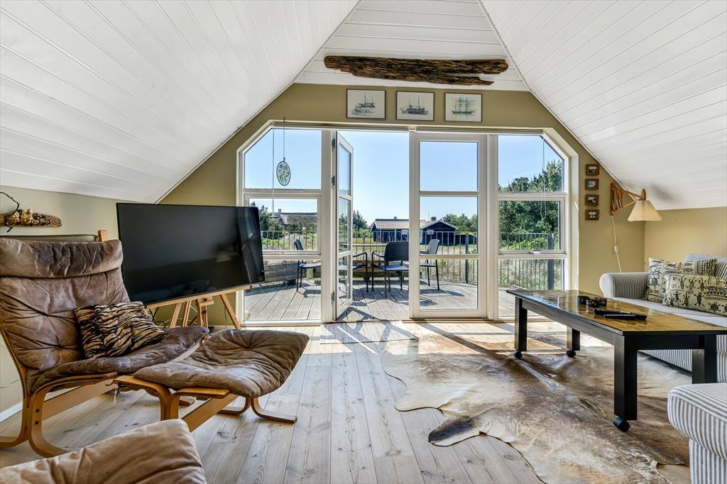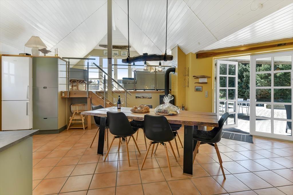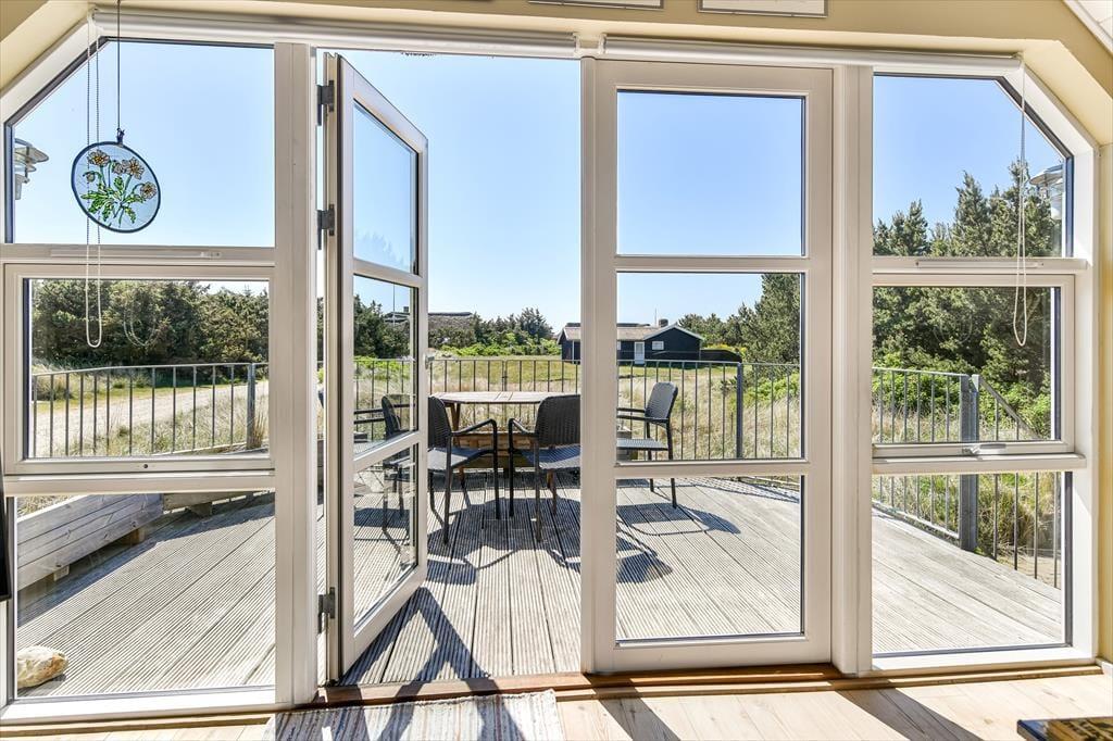 Fra stuen kan I træde direkte ud på den hævede terrasse, som vender mod syd med udsigt over husets store og let kuperede klitgrund. Hvis I foretrækker at sidde i jordhøjde, kan I rykke ned på det flisebelagte terrasseområde, som også har gode solforhold. En del af terrassen er overdækket, og foruden bekvemme havemøbler er der en grill til rådighed, så I kan kokkerere under åben himmel. På grunden er der legefaciliteter til de mindste feriegæster, og hele familien kan dyste i petanque på den dertil indrettede bane.