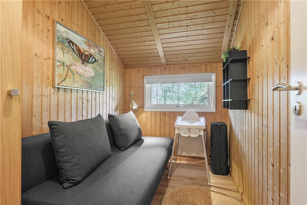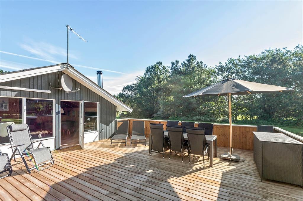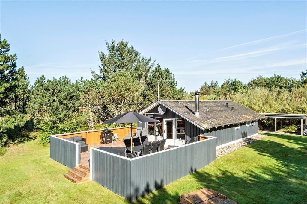 Sommerhuset ligger på en 2674 m2 stor og grøn grund, der skærmes af randbeplantning rundt om græsplænen. Grunden ligger for øvrigt for enden af en lille vej, så I kan med andre ord spille bold og havespil i rolige og ugenerede omgivelser, og de yngste feriegæster kan frit benytte sandkassen, gyngestativet og rutsjebanen. Til bilen er der carport, men det allerbedste er nu næsten den store og nye træterrasse, der ligger syd for sommerhuset. Det er et skønt sted at slikke sol i liggestolene og hyggesnakke i loungemøblerne, og om aftenen kan I samles om havebordet, mens maden steger færdig på grillen.