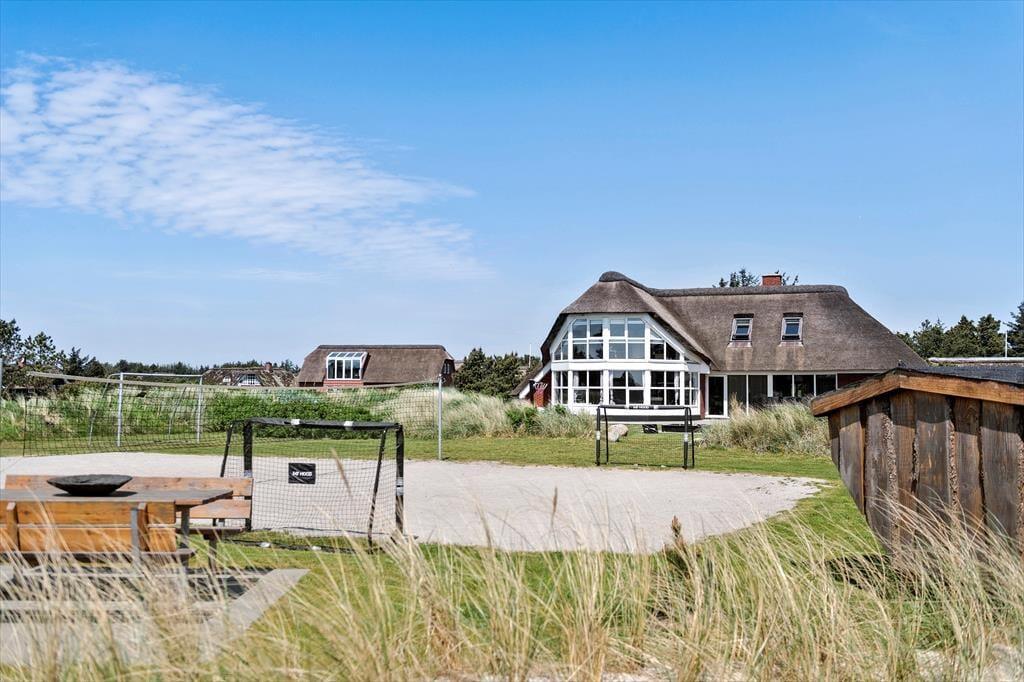 Inde i det stråtækte og særdeles velholdte sommerhus er atmosfæren lys og venlig – ikke bare i stueplan, men også på førstesalen. I alt på de to etager har I 250 m2 at brede jer på, og det betyder også, at 10 personer sagtens kan holde ferie sammen. Fire af sommerhusets fem soveværelser er placeret på førstesalen, der derudover byder på en skøn opholdsstue og et hyggeligt aktivitetsrum. Hvis I ikke bruger tiden heroppe på at spille bordfodbold og airhockey eller slappe af i sofaafdelingen, kan I samles i stueetagen – for eksempel til et lækkert måltid mad i spisestuen, der ligger i åben forbindelse med et veludstyret køkken. Et soveværelse og to badeværelser ligger også her i stueplan foruden poolafdelingen, hvor I kan benytte jer af saunaen, dampkabinen, spabadet og selve poolen.