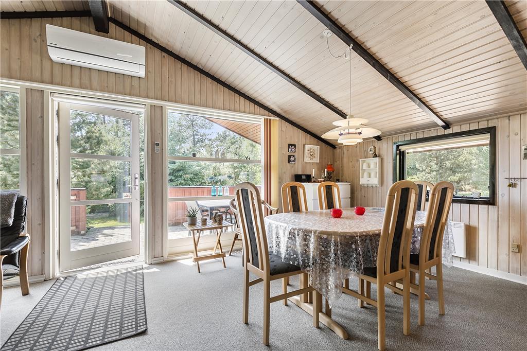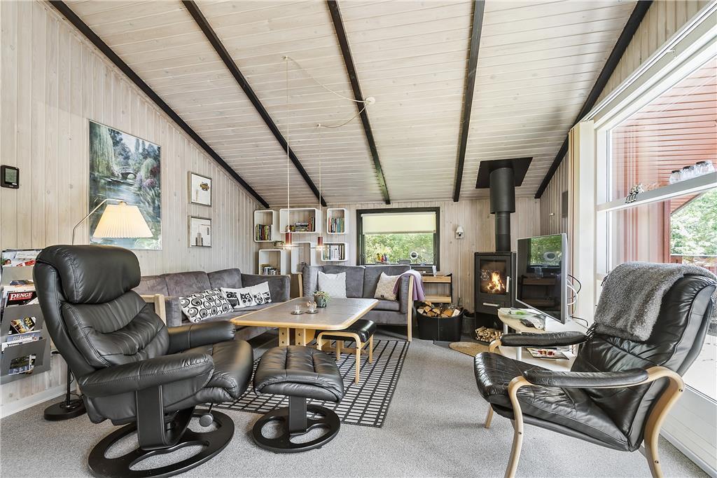 I huset er der et hyggeligt køkkenalrum og stue med god plads til seks personer. I stuen kan I nyde aftenerne med ild i brændeovnen eller kortspil ved spisebordet. Fra stuen er der direkte adgang til den sydvendte terrasse.