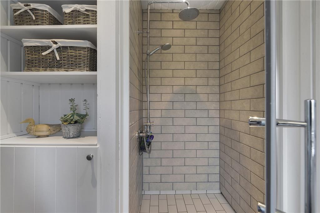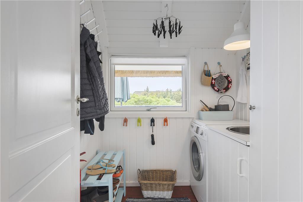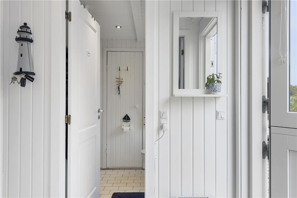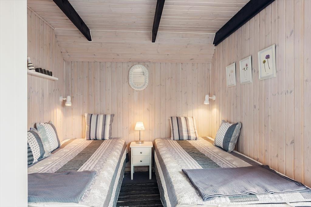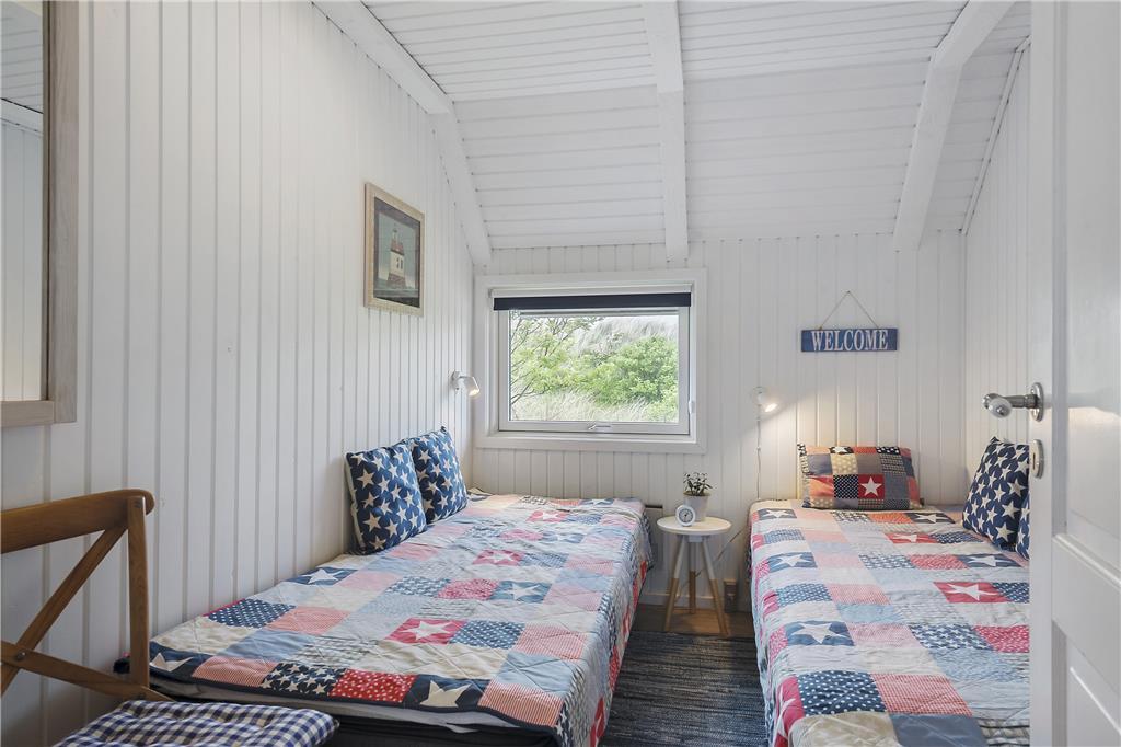 I huset er der et soveværelse med en god dobbeltseng, samt dertil et værelse med 2 enkeltsenge. Badeværelset er veludnyttet, og herfra er der indgang til saunaen. Det sidste rum i huset er et praktisk bryggers med skabsplads og vaskemaskine. Lige ud af døren og henover terrassen, og I træder ind i det hyggelige tilstødende anneks, som har et fint lille værelse med to enkeltsenge og et rummeligt, lyst badeværelse.