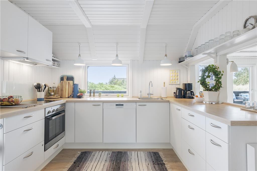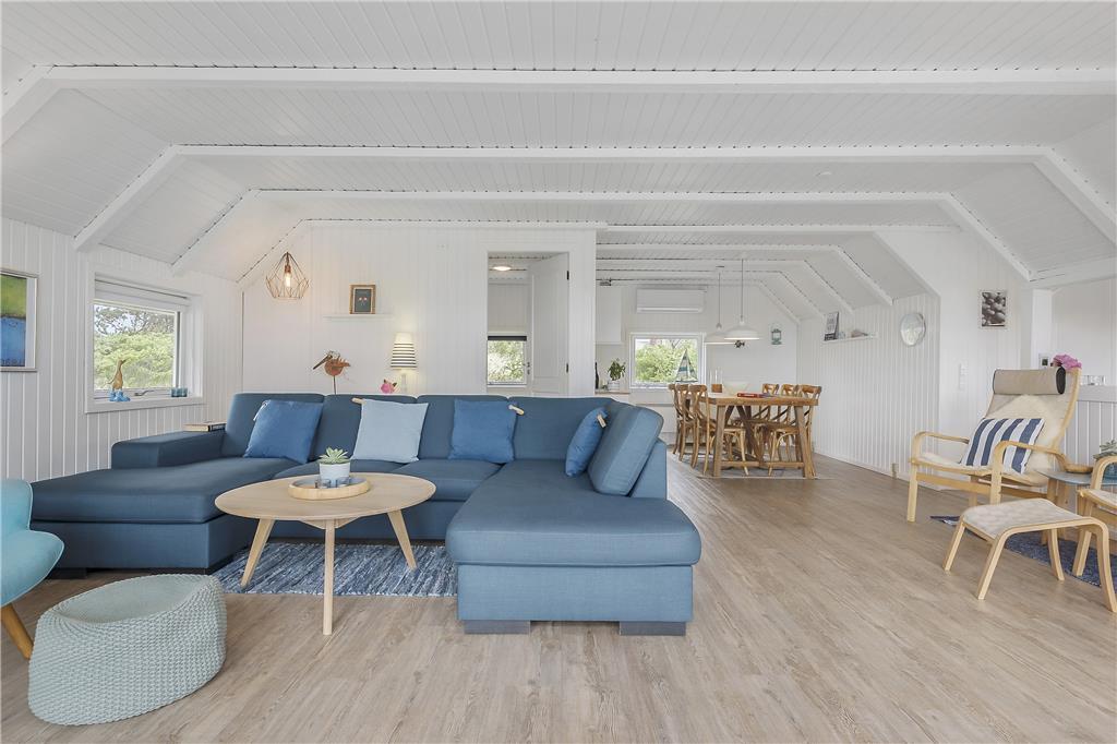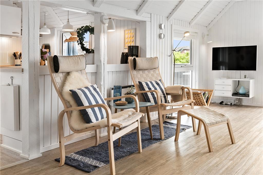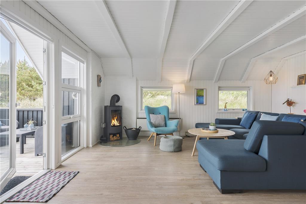 Straks man træder ind i dette sommerhus, føler man sig hjemme og kan sænke skuldrene og slappe af. Her oser det af sommerhushygge og idyl. Sommerhuset er meget smagfuldt indrettet og har mange fine detaljer, som det næsten er umuligt at beskrive. Et hus, som skal opleves! Sommerhuset har et dejligt køkken, hvor man kan følge med i, hvad der foregår i den store og lyse stue, hvor der er spisebord og et hyggeligt sofahjørne med brændeovn. Fra stuen er der direkte adgang til den meget store lukkede træterrasse.