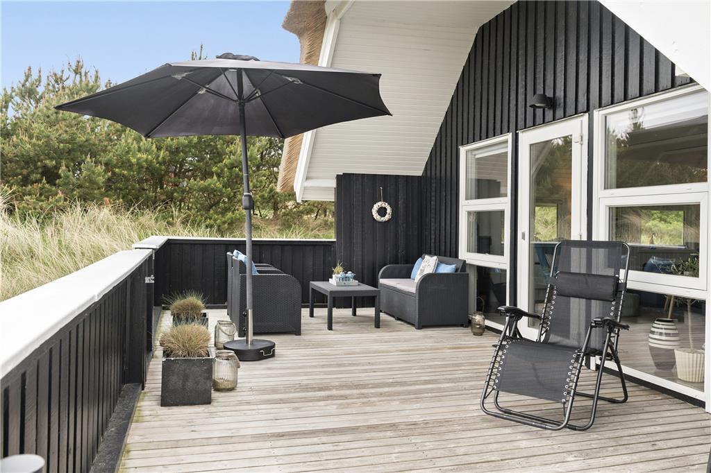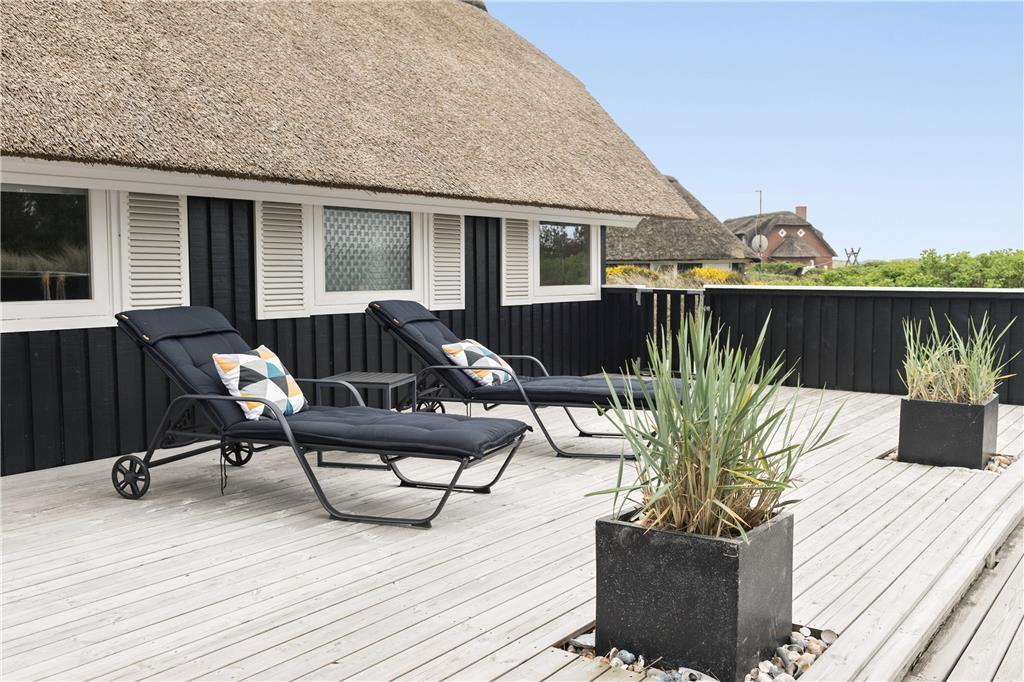 Grunden er dejlig ugenert, og den meget store og indhegnede træterrasse er fantastisk. På terrassen er der flere gode lækroge, hvor man kan nyde solen enten i en liggestol eller i det hyggelige møbelarrangement. Der er smukt og smagfuldt dekoreret med hedens og strandens planter i store krukker. På terrassen kan man nyde vejret og solen, fra den står op, til den går ned. Huset ligger så tæt på vandet, at man kan høre bølgernes brusen, imens man sidder i læ på terrassen.