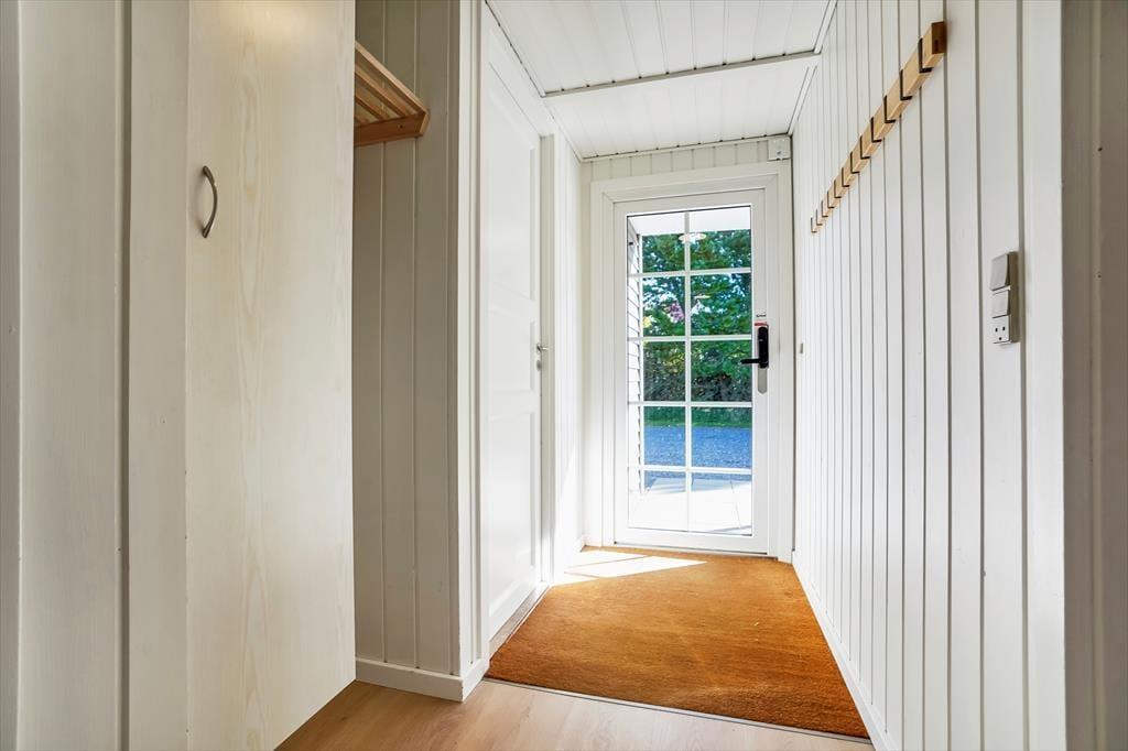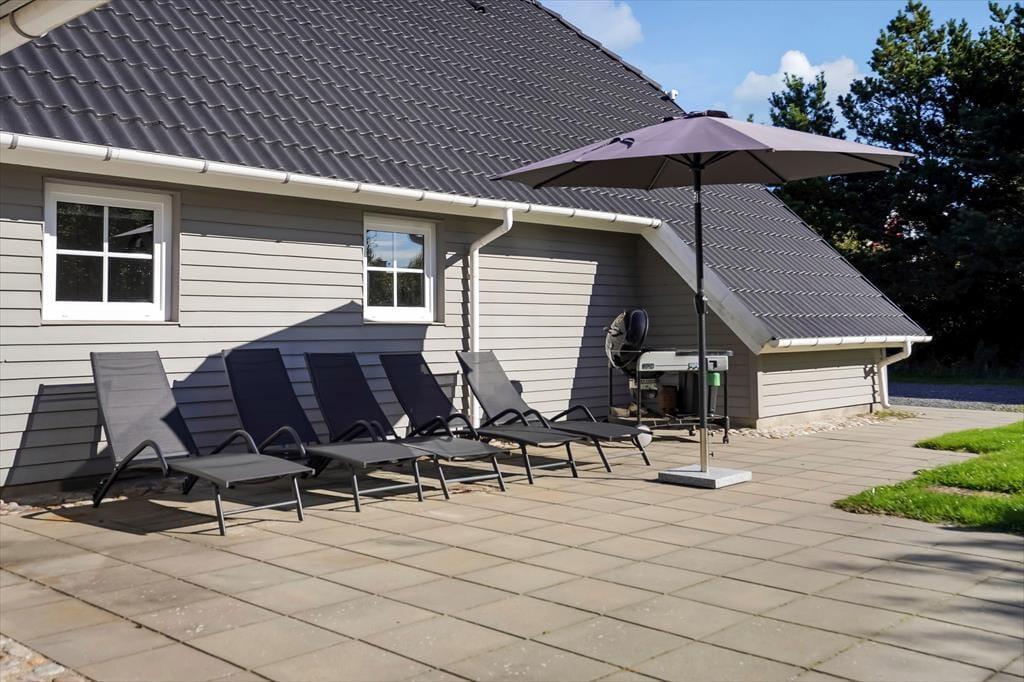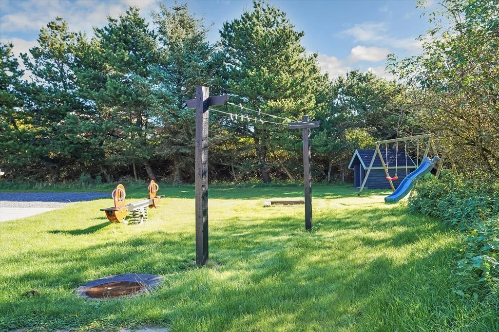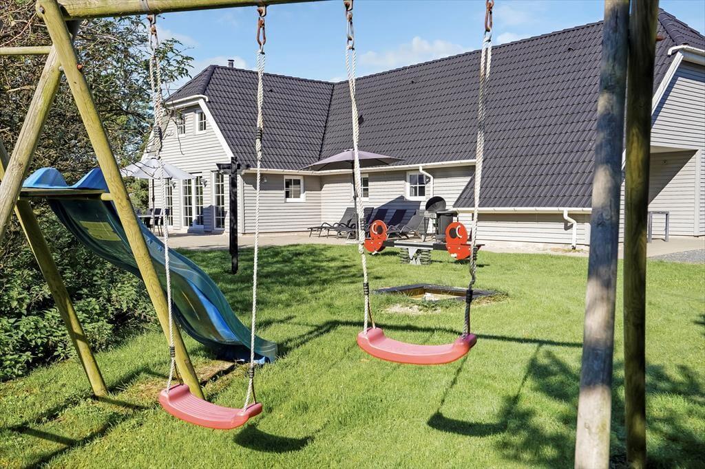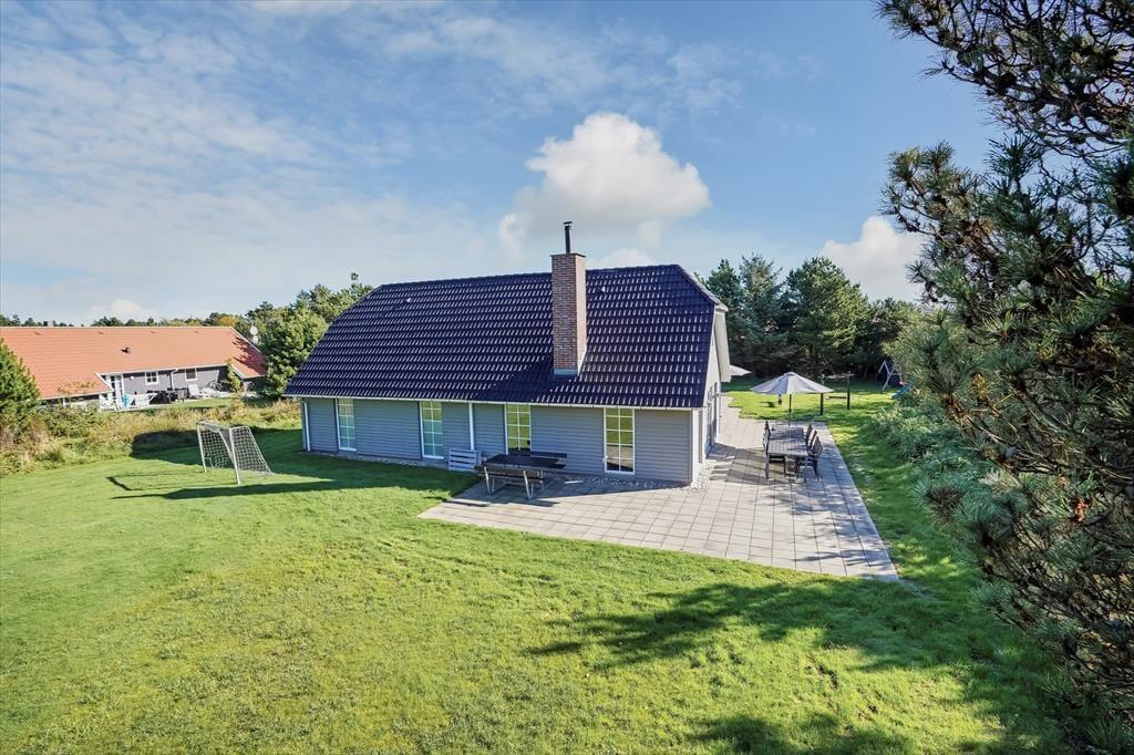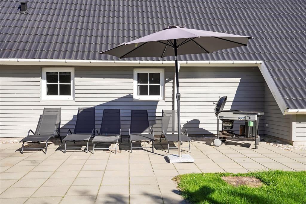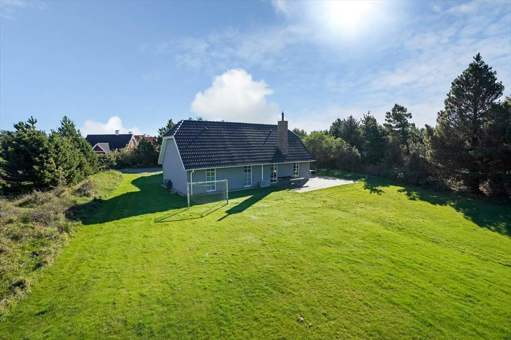 Udearealet er ligesom huset perfekt anlagt til mange mennesker. Grunden er stor og ligger tilbagetrukket fra vejen, og der er god plads til parkering på grusbelægningen. Til flere sider er der tæt randbeplantning, så I kan nyde driverlivet på det solrige terrassemiljø ganske uforstyrret. Den vidtstrakte græsplæne indbyder til boldspil – der er endda opstillet fodboldmål – og til de mindre børn er der sandkasse, legehus og gyngestativ.