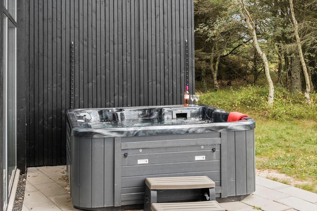 På husets store, sydvendte terrasse kan feriedagene nydes i fulde drag. Terrassen er delvist overdækket, hvis I får brug for skygge eller læ, og som noget helt særligt er et udespa del af udendørsfaciliteterne. Når børnene er lagt i seng, er det oplagt at sænke sig i det dampende, varme vand med en god flaske og i godt selskab – og mens I sidder og nyder den rolige aftenstund, viser naturen måske lidt af sin magi, når et par rådyr springer over naturgrunden.