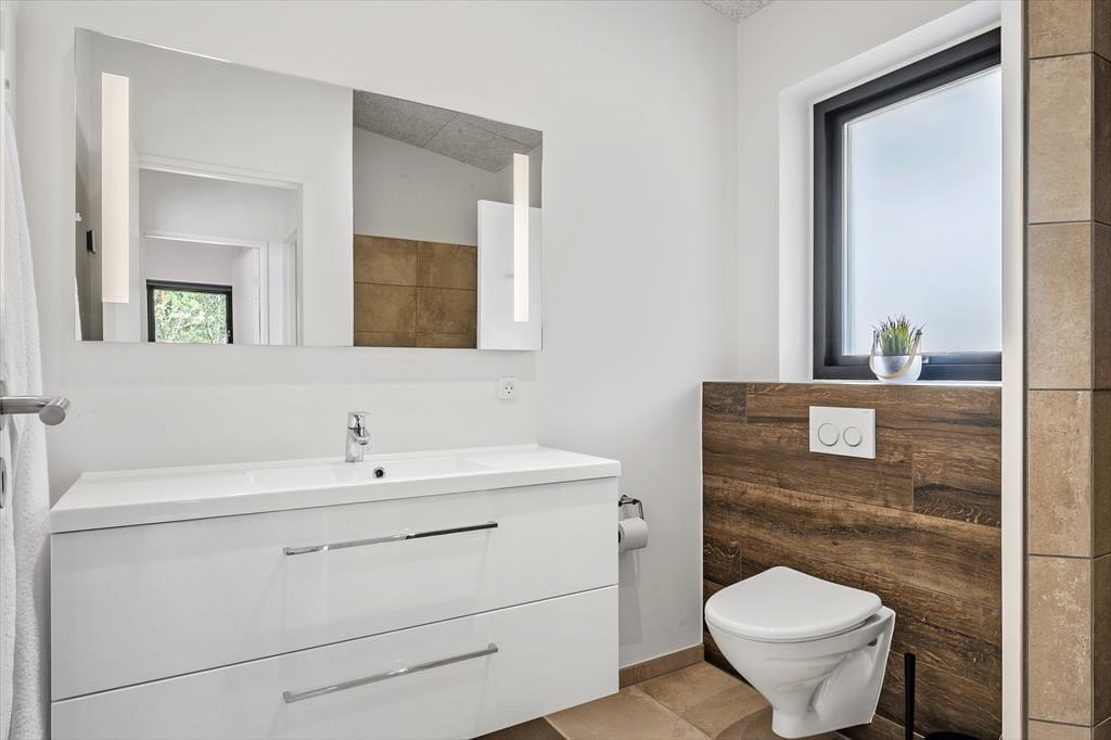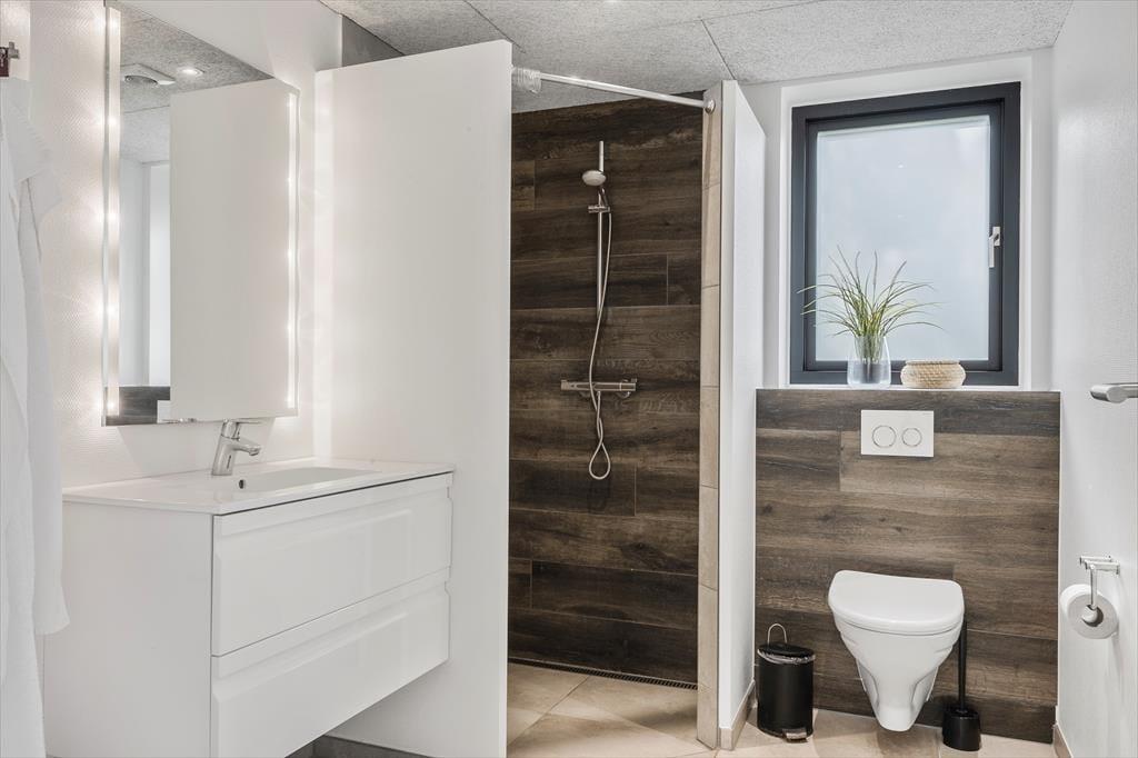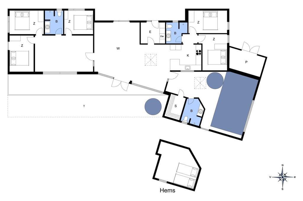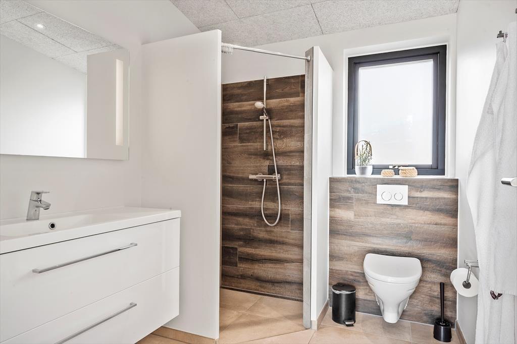 Med et boligareal på 242 m2 kan 12 feriegæster uden tvivl finde sig godt til rette i sommerhuset. Fem soveværelser er alle udstyrede med masser af skabsplads og komfortable dobbeltsenge, og derudover finder I to ekstra sovepladser på hemsen over køkkenet. To af husets badeværelser er fornuftigt placeret ved soveafdelingerne, mens et tredje badeværelse er del af wellnessafdelingen. I sommerhuset fuldendes luksus-oplevelsen også af knap så synlige detaljer: Overalt sørger lyddæmpede lofter for en behagelig akustik, og der er gulvvarme i alle rum.