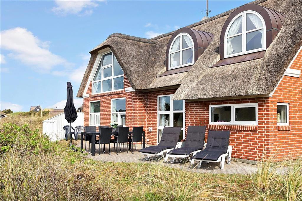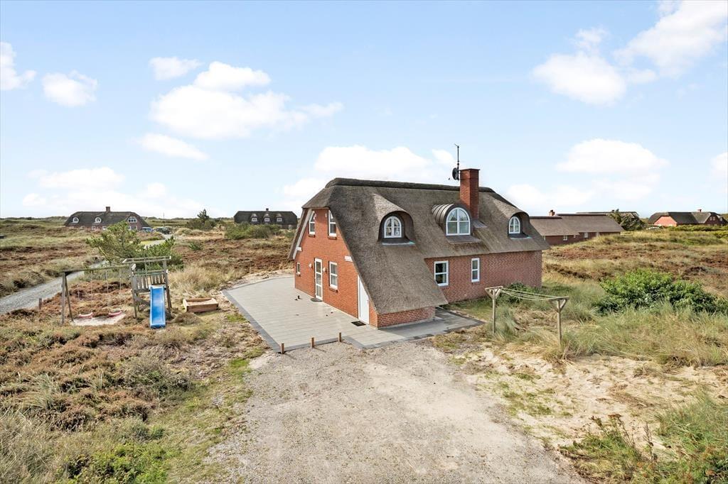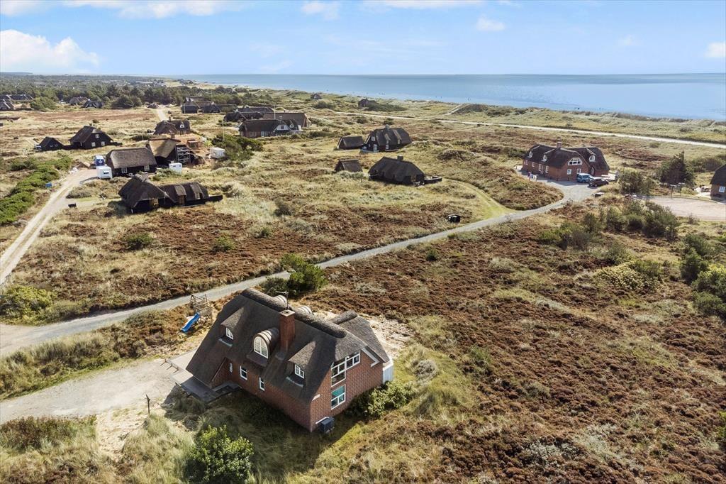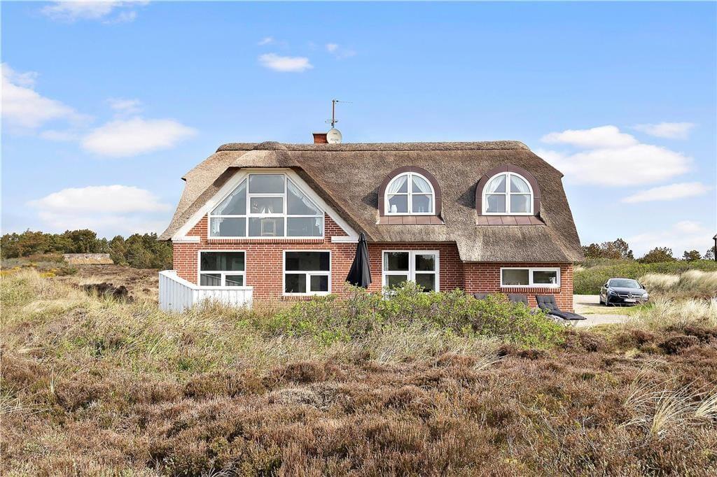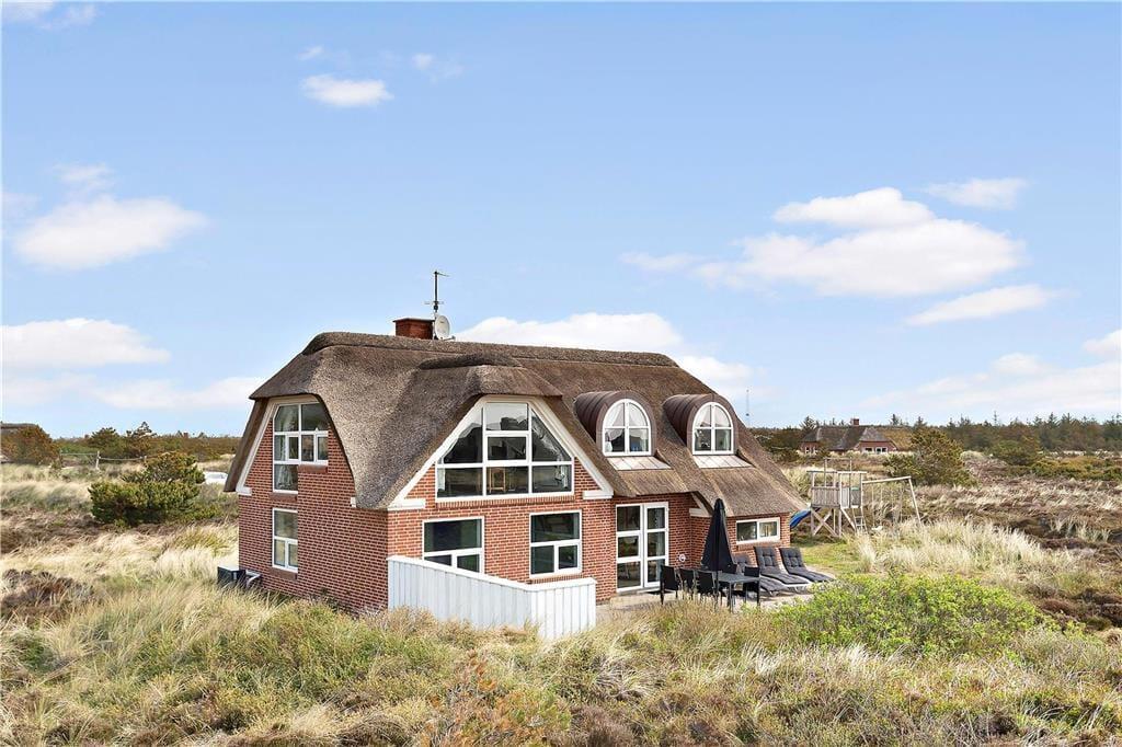 Det stråtækte sommerhus er ikke bare stort, men er også virkelig hyggeligt og funktionelt indrettet. Kort sagt finder I alt, hvad I skal bruge inden døre –lige fra komfortable dobbeltsenge på de fire soveværelser til vaskemaskine og tørretumbler på det ene af de to badeværelser. Gode opholdspladser er der naturligvis også, for I kan hygge jer omkring spisebordet i stueetagens køkken, og når I virkelig skal nyde ferielivet, har I jeres helt egen wellness-afdeling med pool, spabad og sauna. Det føles også som ren velvære at slappe af i førstesalens stue, for her kan I tænde op i brændeovnen og sætte jer i lænestolene med en god kop kaffe, mens I nyder udsigten over klitlandskabet og havet gennem de store vinduespartier.