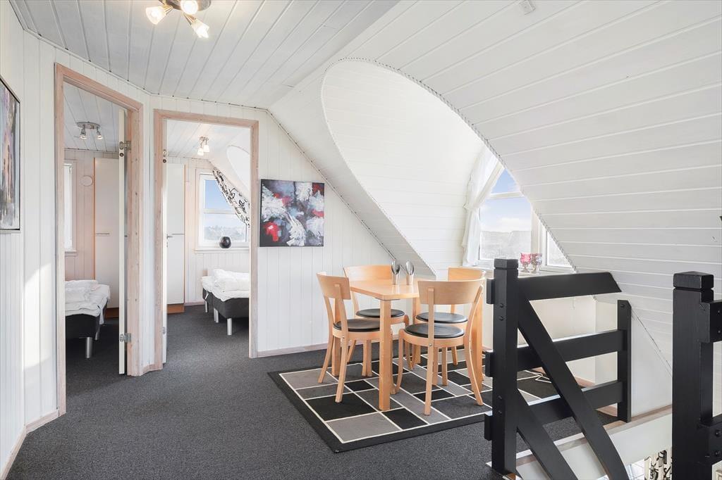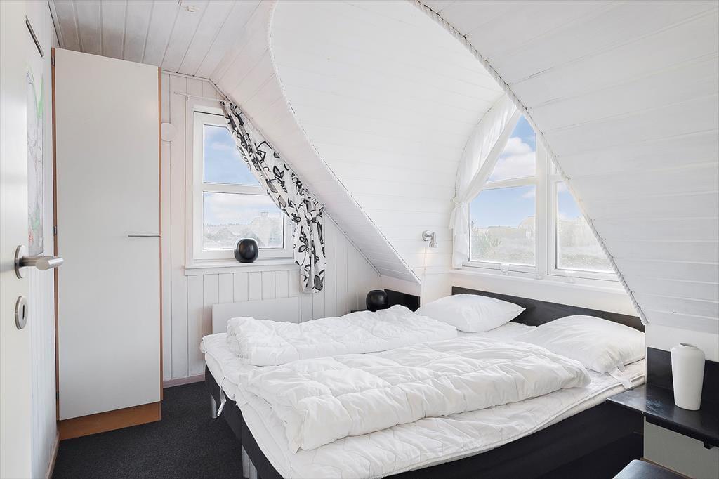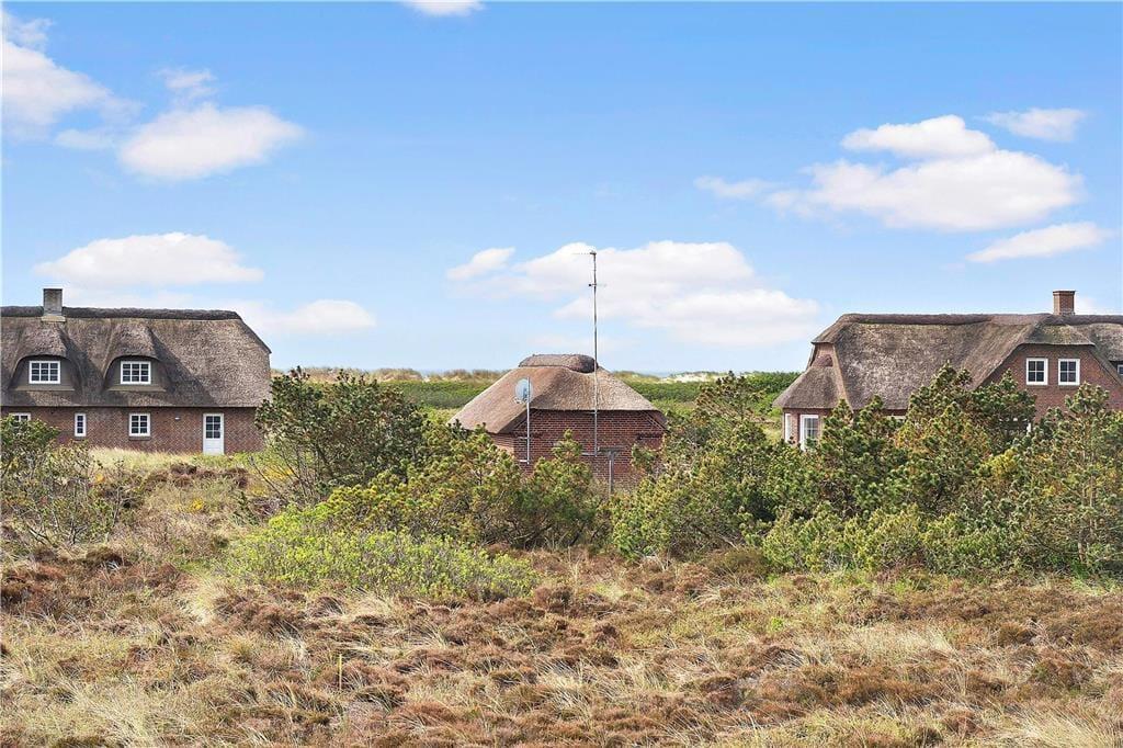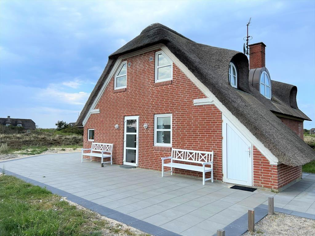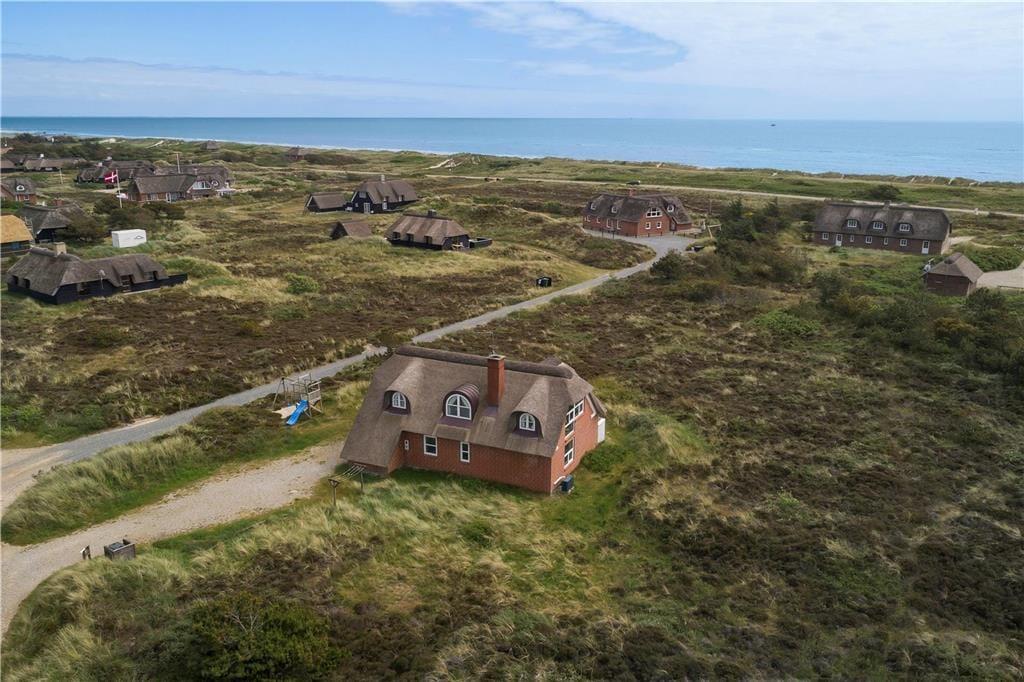 Det stråtækte sommerhus er ikke bare stort, men er også virkelig hyggeligt og funktionelt indrettet. Kort sagt finder I alt, hvad I skal bruge inden døre –lige fra komfortable dobbeltsenge på de fire soveværelser til vaskemaskine og tørretumbler på det ene af de to badeværelser. Gode opholdspladser er der naturligvis også, for I kan hygge jer omkring spisebordet i stueetagens køkken, og når I virkelig skal nyde ferielivet, har I jeres helt egen wellness-afdeling med pool, spabad og sauna. Det føles også som ren velvære at slappe af i førstesalens stue, for her kan I tænde op i brændeovnen og sætte jer i lænestolene med en god kop kaffe, mens I nyder udsigten over klitlandskabet og havet gennem de store vinduespartier.