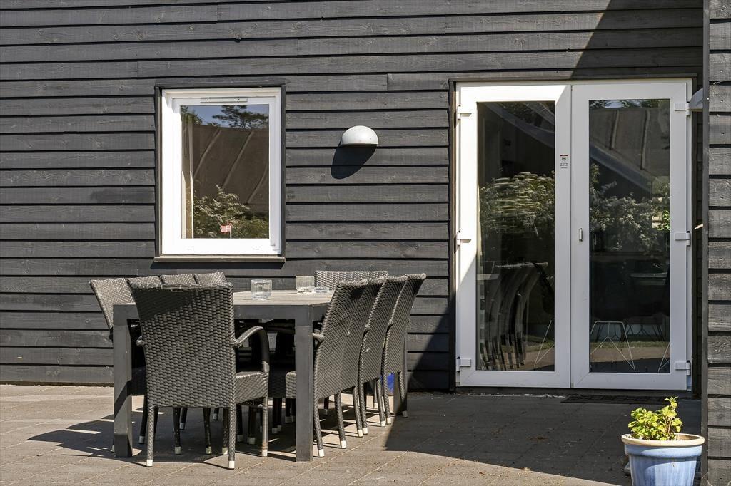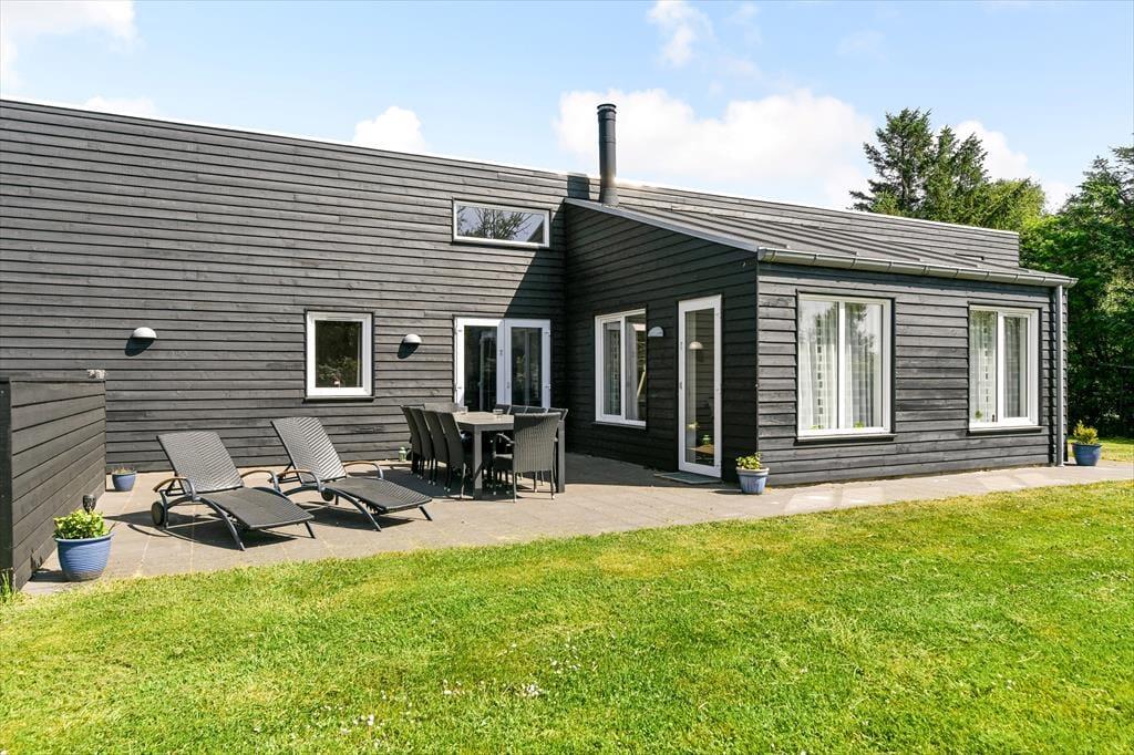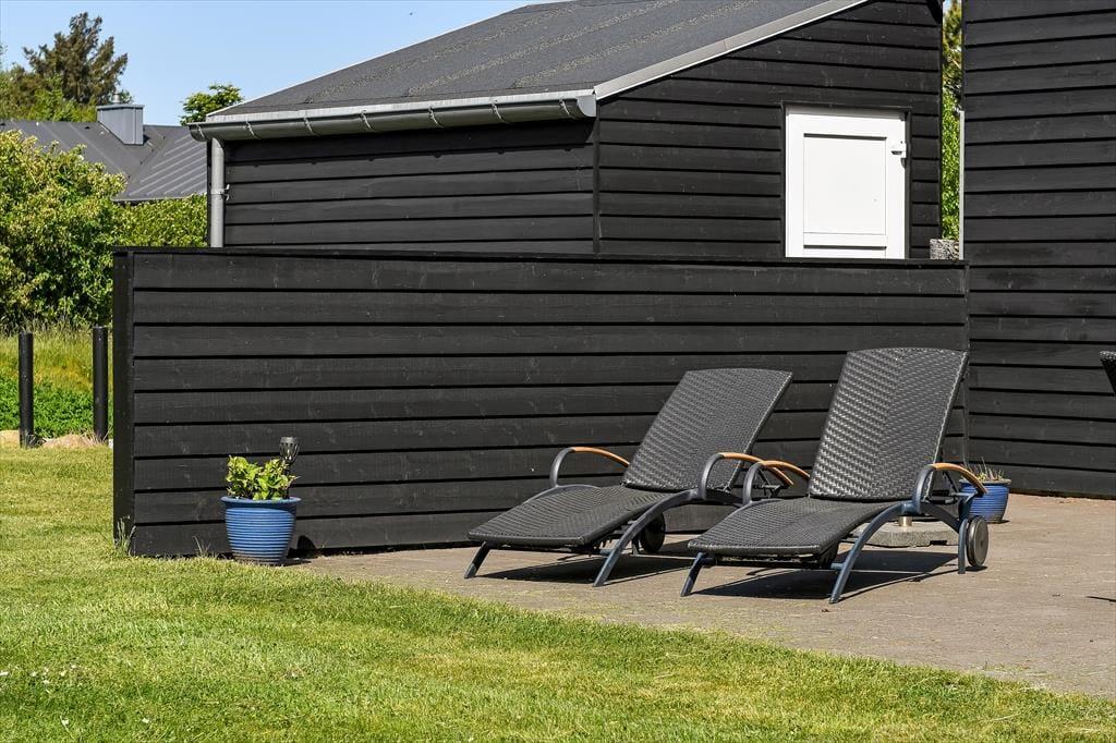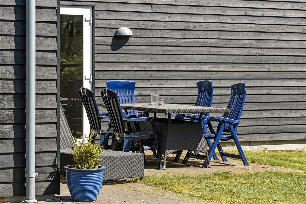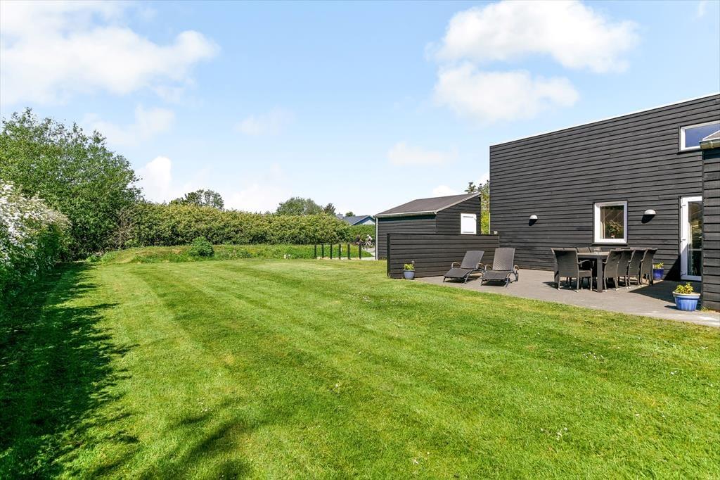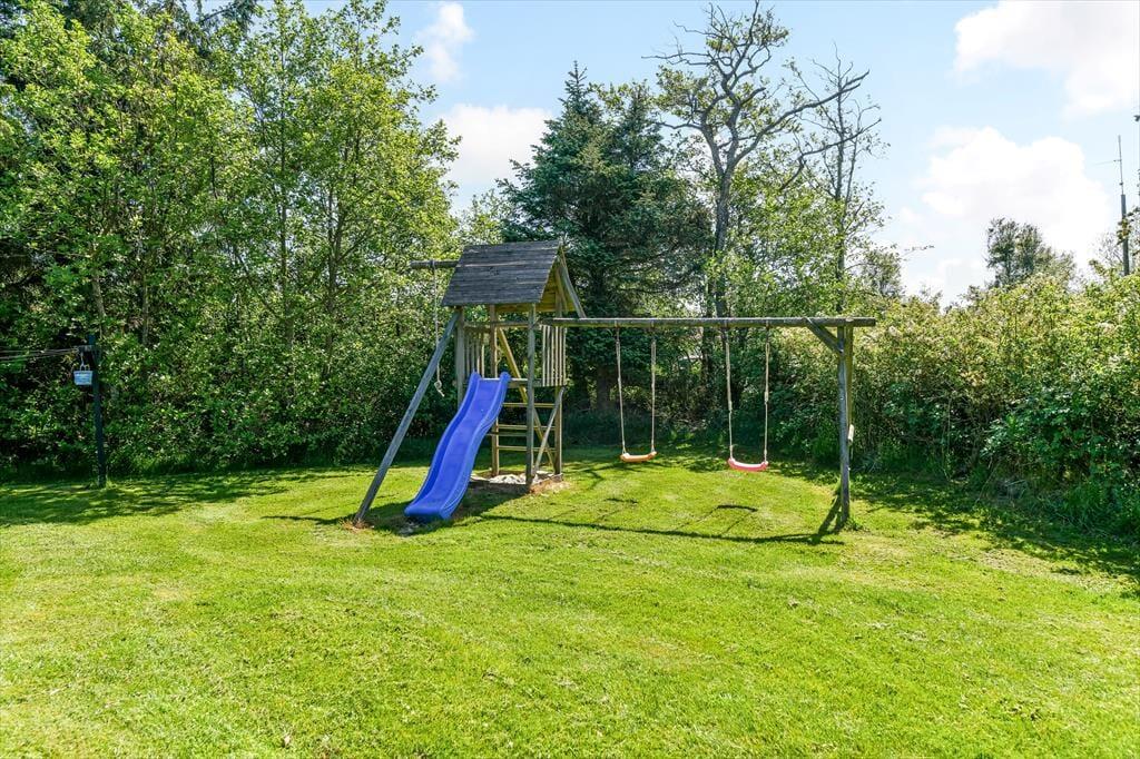 Ferieforholdene er mindst lige så fortrinlige ude i det fri på den store, grønne grund, der skærmes af en tæt hæk og anden randbeplantning ud mod vejen og ind mod naboerne. Græsplænen kan sagtens danne rammen om kongespillet eller andre haveaktiviteter, og de yngste feriegæster har også et sjovt legestativ med gynger, klatretårn og rutsjebane at boltre sig på. Det sydvendte terrassemiljø inviterer til at drikke formiddagskaffe, spise frokost og holde siesta i solen, og om aftenen kan du tænde grillen og byde alle dine kære på et frisktilberedt festmåltid under åben himmel.