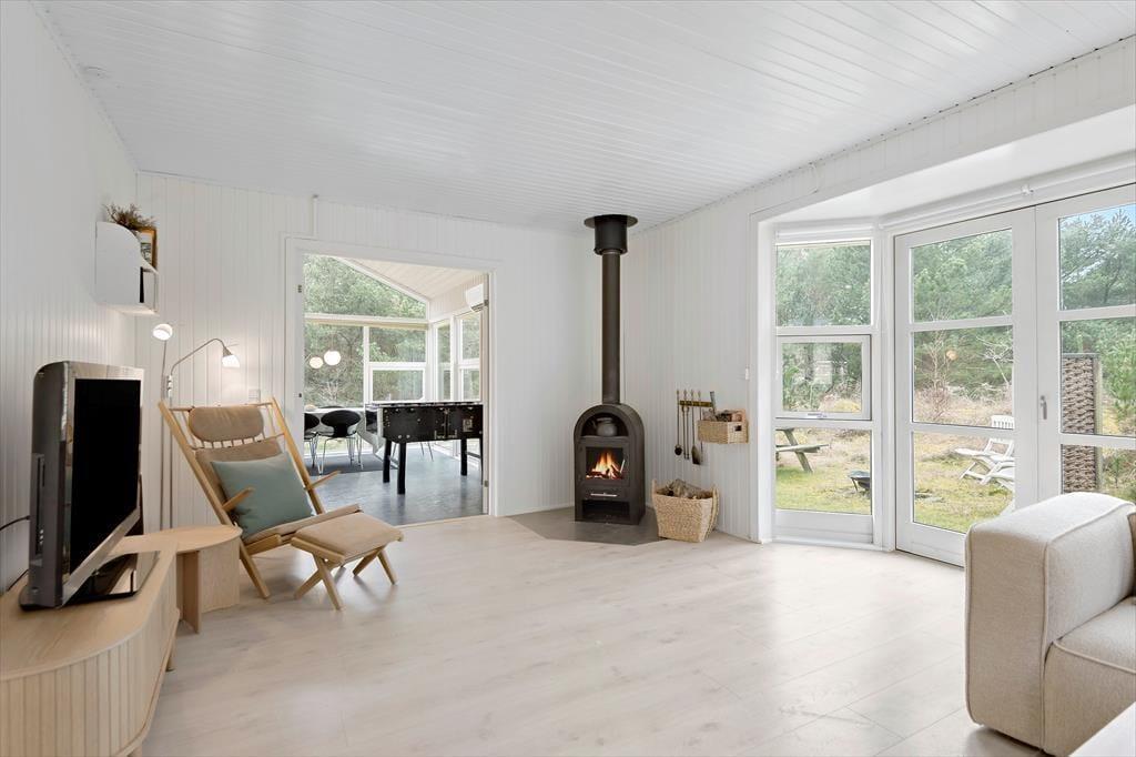 Sommerhus i Blåvand Strand og By, Vestjylland, med plads til 6 voksne og 2 husdyr. Der er en hyggelig indretning med bl.a. brændeovn, og du finder desuden vaskemaskine, opvaskemaskine og tørretumbler i boligen.