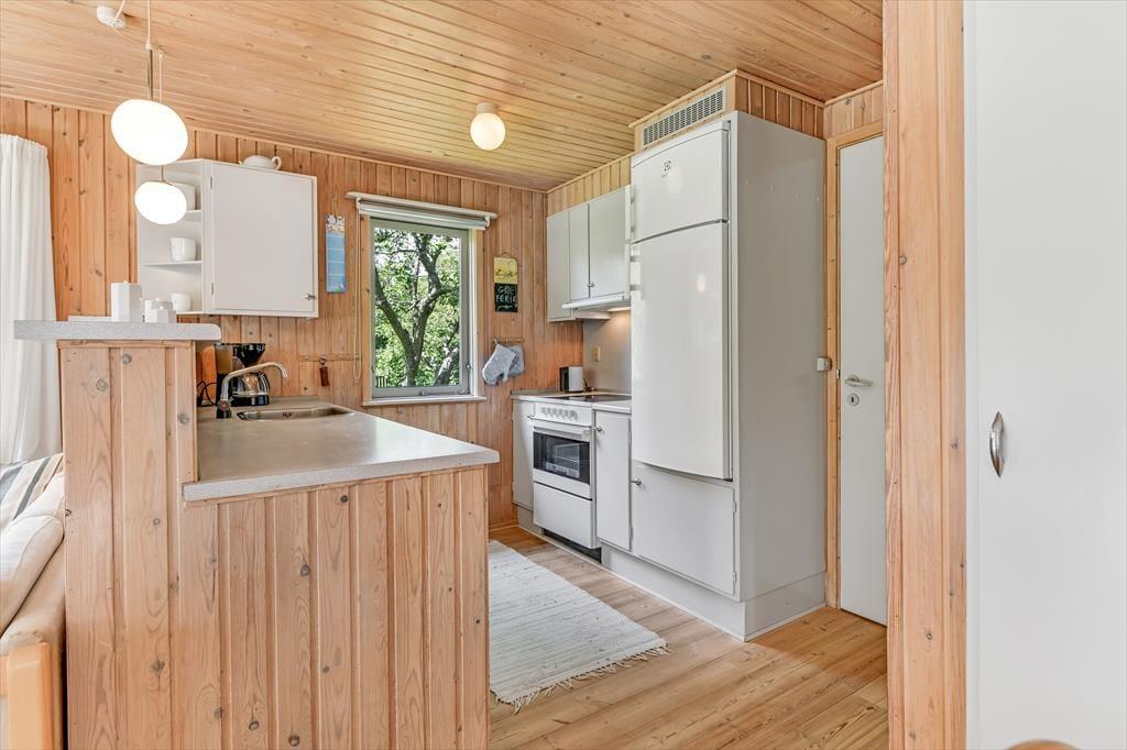 Dette feriehus er af den slags sommerhuse, som fra første øjeblik giver dig lyst til at sidde hyggeligt sammen i komfortabelt tøj i opholdsrummet, læse i fred og spille brætspil i glade omgivelser. Sofagruppen befinder sig lige ved brændeovnen. Ved den hyggelige spiseplads nyder I sammen dagens store og små måltider. Det veludstyrede køkken smelter sammen med opholdsrummet, og således kan du selv under madlavningen nyde nærheden til dine kære og deltage i alle samtaler. Der er tre soveværelser og et badeværelse med bruser, samt en udestue, der blandt andet inviterer til at nyde den første kaffe om morgenen med udsigt til de grønne træer.