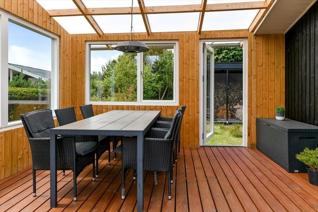 Fra køkkenet kan du træde lige ud på en østvendt fliseterrasse, hvor morgenkaffen passende kan indtages i dagens første solstråler. Senere vil du måske hellere slå dig ned på det sydvendte terrassemiljø, der ligger i forlængelse af stuen. Her er der et åbent areal og en overdækket afdeling med god afskærmning, hvis du får brug for at søge læ for vestenvinden eller aftenduggen. På en del af grunden breder den naturlige bevoksning sig frit, så du har noget kønt at kigge på– og på græsplænen er der plads til boldspil og fangeleg, hvis børnene trænger til at blive underholdt.
