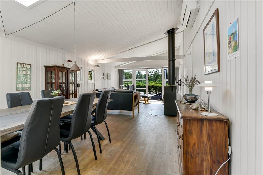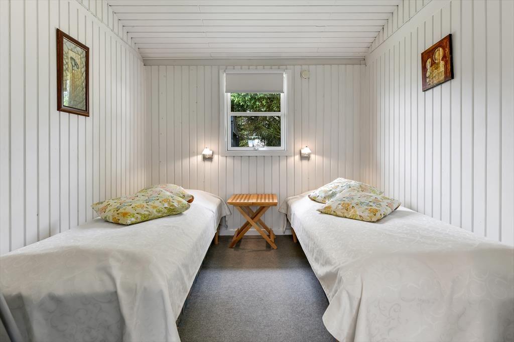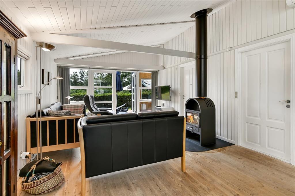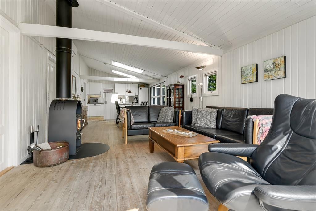 Sommerhuset er et af den slags, der giver dig fornemmelsen af ro og afslapning, så snart du træder indenfor. Stue og køkken ligger i åben forbindelse, og her har du en rar ramme om feriens hyggestunder, hvad enten de består af krimilæsning og krydsogtværser i sofaarrangementet eller madlavning og lækre måltider ved spisebordet. På en råkold dag kan du tænde op i brændeovnen for at sprede ekstra varme og god stemning – og hvis sommersolen skinner, kan du i stedet åbne terrassedøren og invitere den friske luft indenfor. Planløsningen byder på to soveværelser og et brusebadeværelse, så I kan være op til fire personer, og en hund er også velkommen inden døre.