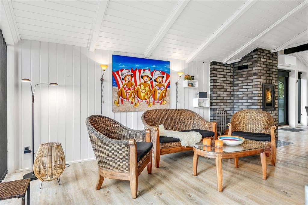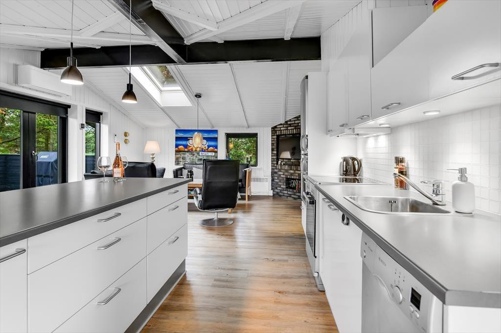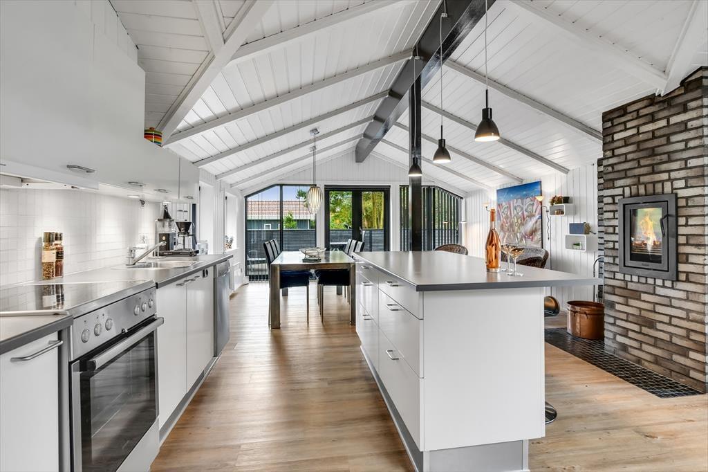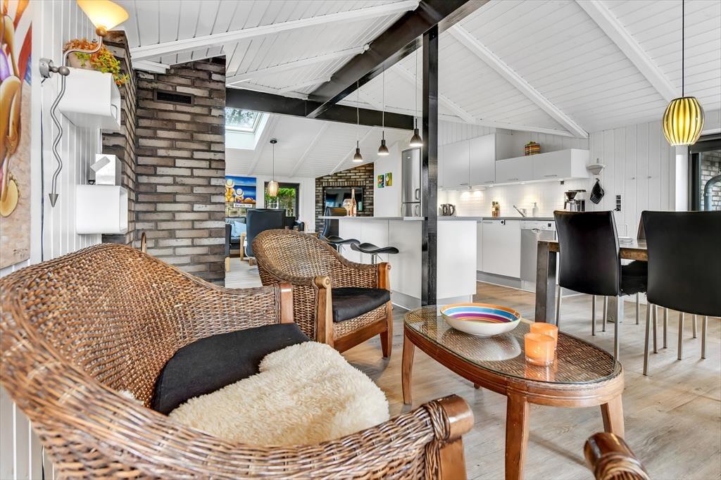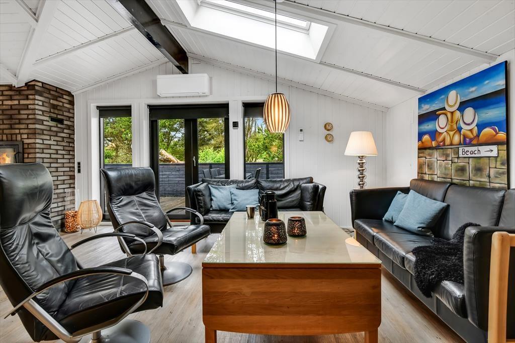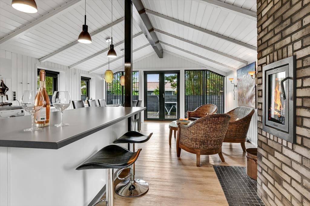 Når du træder ind i dette indbydende sommerhus, bliver du mødt af en lys og rummelig atmosfære. Husets hjerte er det åbne køkken-alrum, som er smukt integreret med stuen. Her kan du nyde hyggelige middage ved spisebordet og efterfølgende slappe af i sofaen foran Smart-TV’et. Brændeovnen spreder varme og hygge på kølige aftener, mens de store vinduer lukker masser af dagslys ind. De tre gode værelser er alle udstyret med TV, så der er rig mulighed for privatliv og underholdning for hele familien. Sommerhuset er gennemført i en moderne stil, der samtidig formår at bevare den klassiske sommerhuscharme.