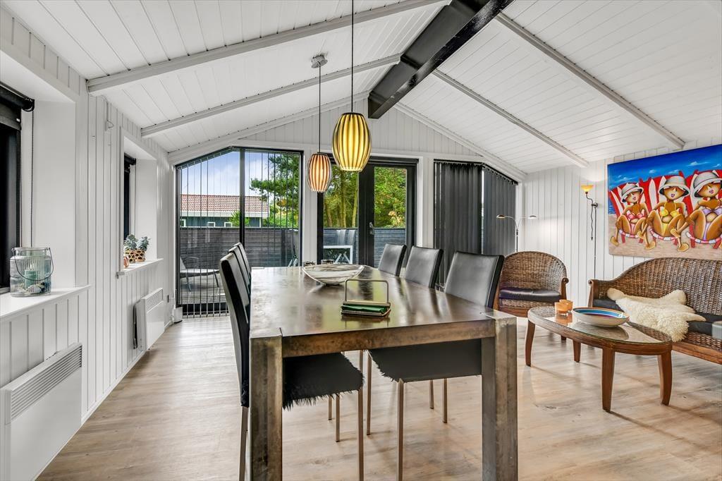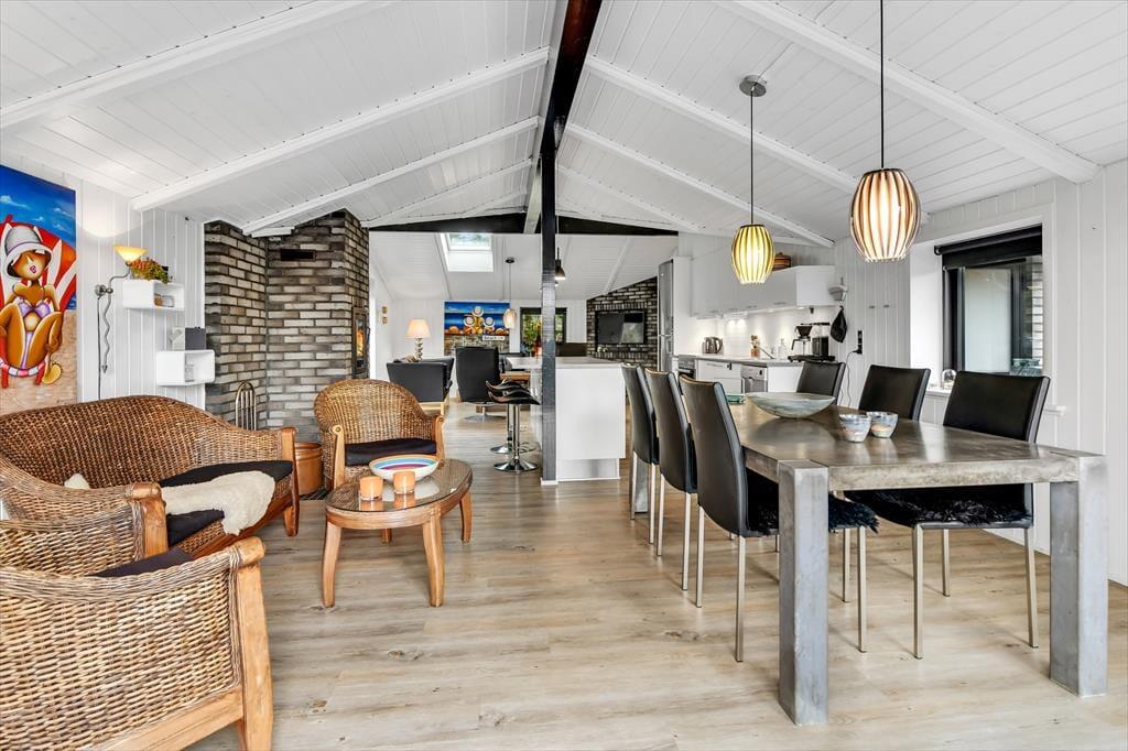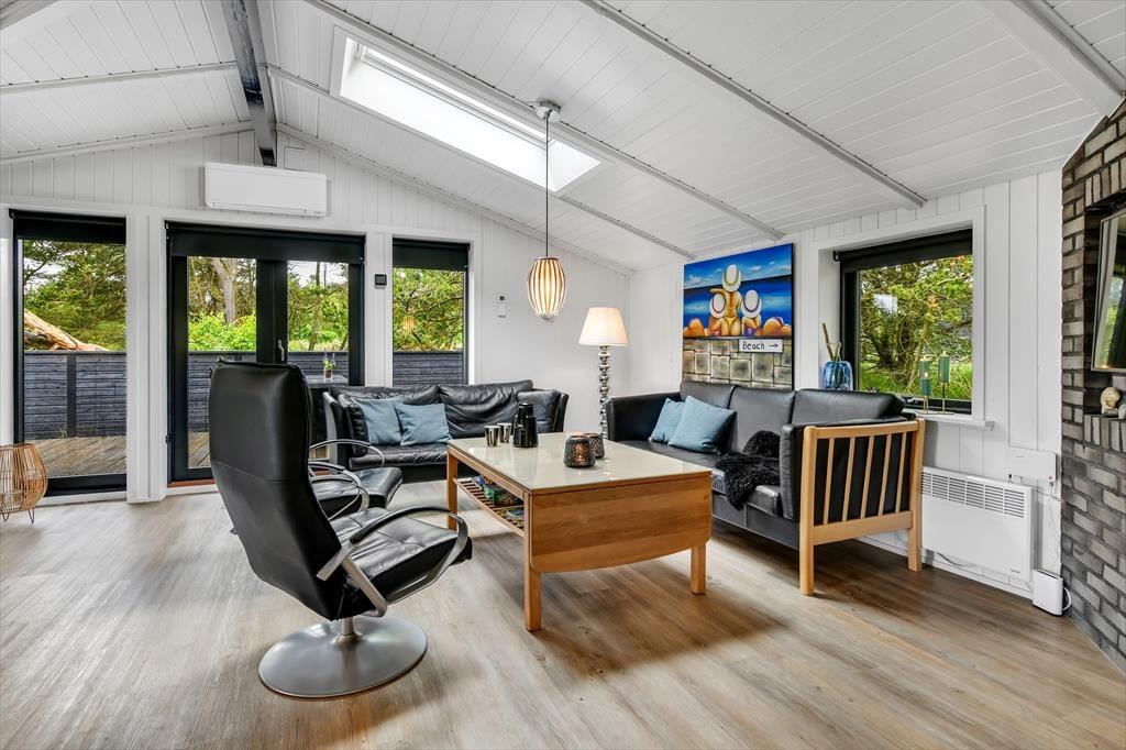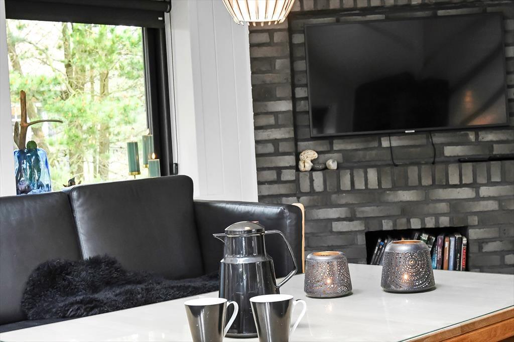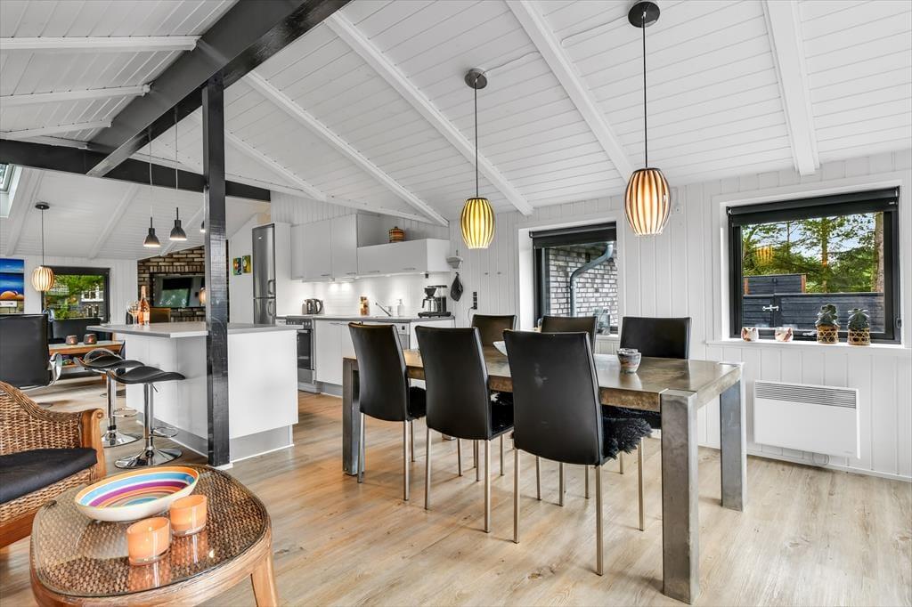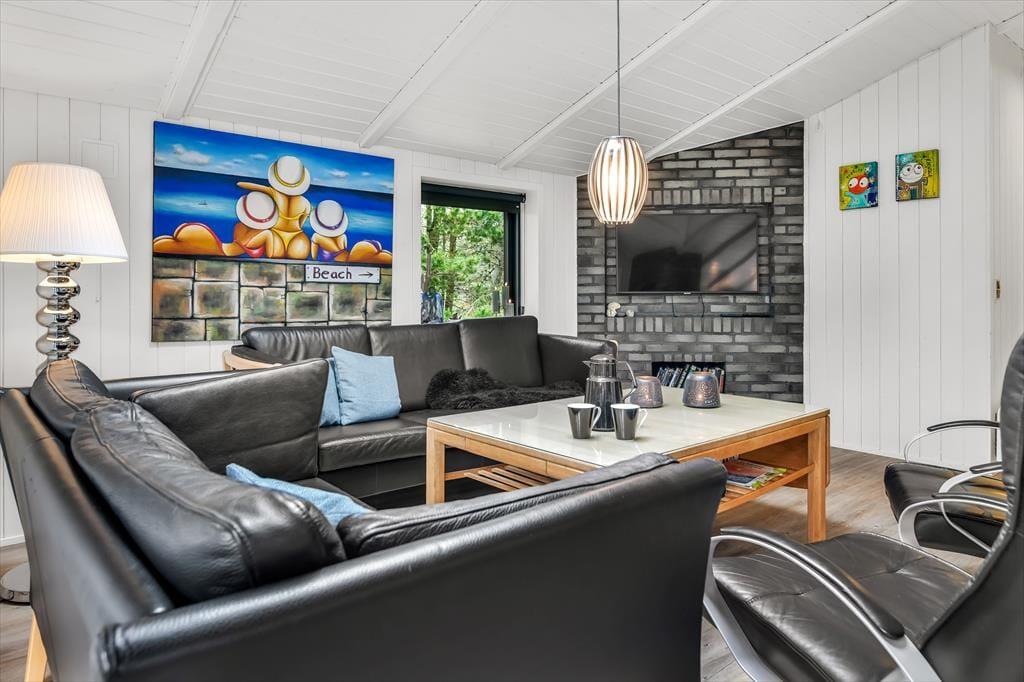 Når du træder ind i dette indbydende sommerhus, bliver du mødt af en lys og rummelig atmosfære. Husets hjerte er det åbne køkken-alrum, som er smukt integreret med stuen. Her kan du nyde hyggelige middage ved spisebordet og efterfølgende slappe af i sofaen foran Smart-TV’et. Brændeovnen spreder varme og hygge på kølige aftener, mens de store vinduer lukker masser af dagslys ind. De tre gode værelser er alle udstyret med TV, så der er rig mulighed for privatliv og underholdning for hele familien. Sommerhuset er gennemført i en moderne stil, der samtidig formår at bevare den klassiske sommerhuscharme.