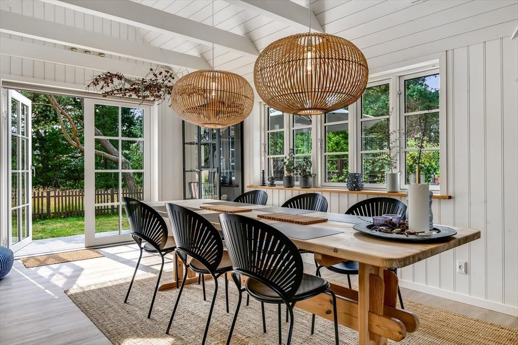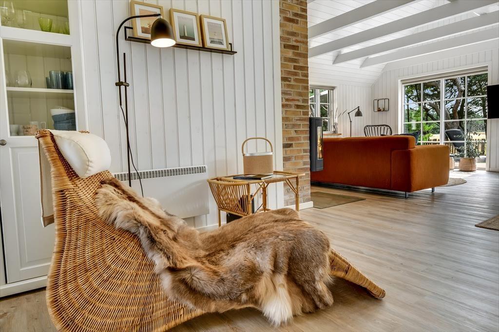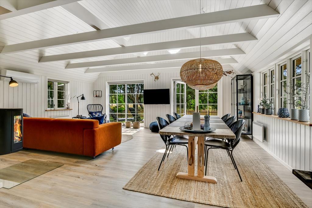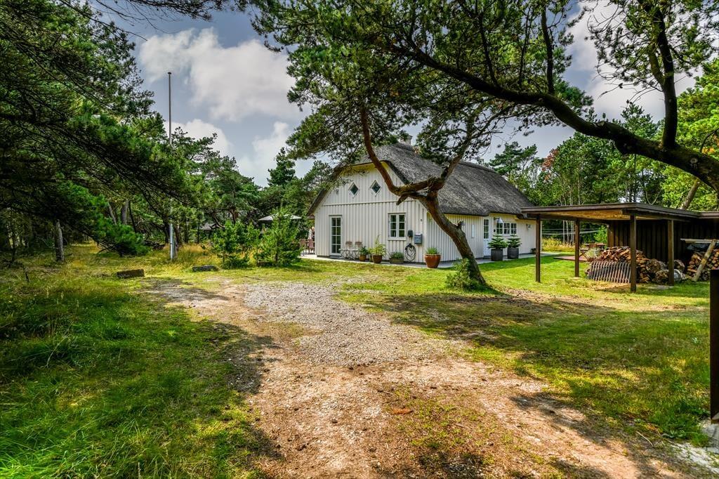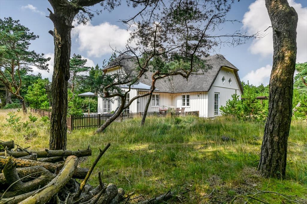 Med sit smukke stråtag og sin hvide træfacade er arkitekturen klassisk, men det 133 m2 store sommerhus har nu kun stået her på naturgrunden siden 2015. Inden døre byder indretningen på en velfungerende blanding af det tidsløse og det mere moderne, så du er sikker på at bo komfortabelt og samtidig i særdeles stemningsfulde rammer. Med to lækre badeværelser, tre gode soveværelser og en stor hems med ekstra sovepladser kan du nemt invitere familie eller venner med på ferien – og I kan alle glæde jer til at samles til leg, hygge og afslapning i det flotte opholdsrum. Her er der brændeovn til eventuelle kølige dage og et åbent køkken, hvor I kan trylle alle jeres favoritretter frem, og gennem vinduerne kan I nyde det smukke lysindfald og se lige ud på de naturskønne omgivelser.
