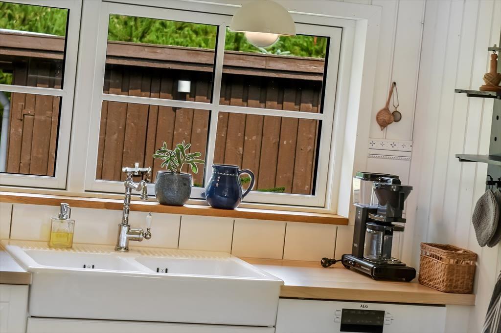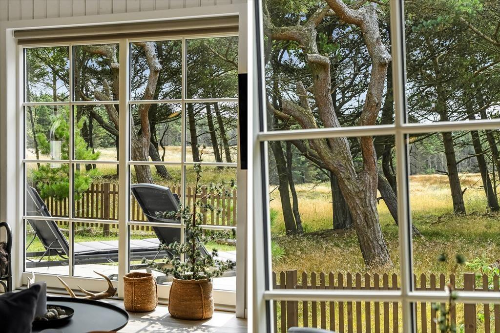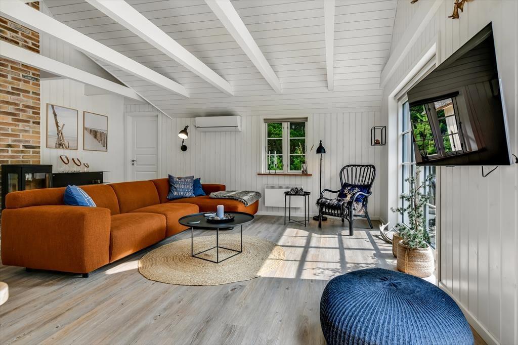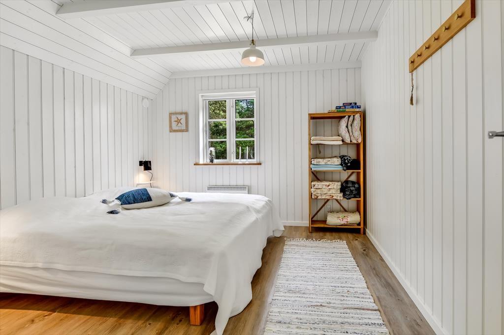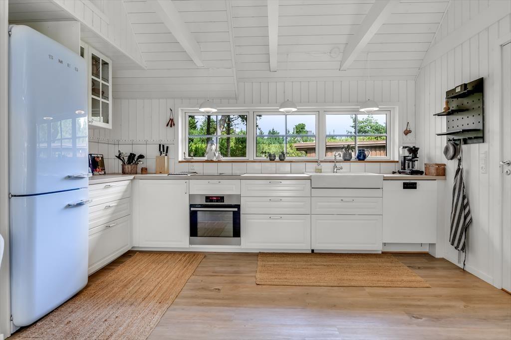 Med sit smukke stråtag og sin hvide træfacade er arkitekturen klassisk, men det 133 m2 store sommerhus har nu kun stået her på naturgrunden siden 2015. Inden døre byder indretningen på en velfungerende blanding af det tidsløse og det mere moderne, så du er sikker på at bo komfortabelt og samtidig i særdeles stemningsfulde rammer. Med to lækre badeværelser, tre gode soveværelser og en stor hems med ekstra sovepladser kan du nemt invitere familie eller venner med på ferien – og I kan alle glæde jer til at samles til leg, hygge og afslapning i det flotte opholdsrum. Her er der brændeovn til eventuelle kølige dage og et åbent køkken, hvor I kan trylle alle jeres favoritretter frem, og gennem vinduerne kan I nyde det smukke lysindfald og se lige ud på de naturskønne omgivelser.