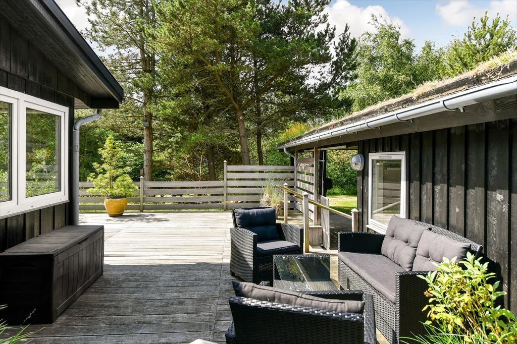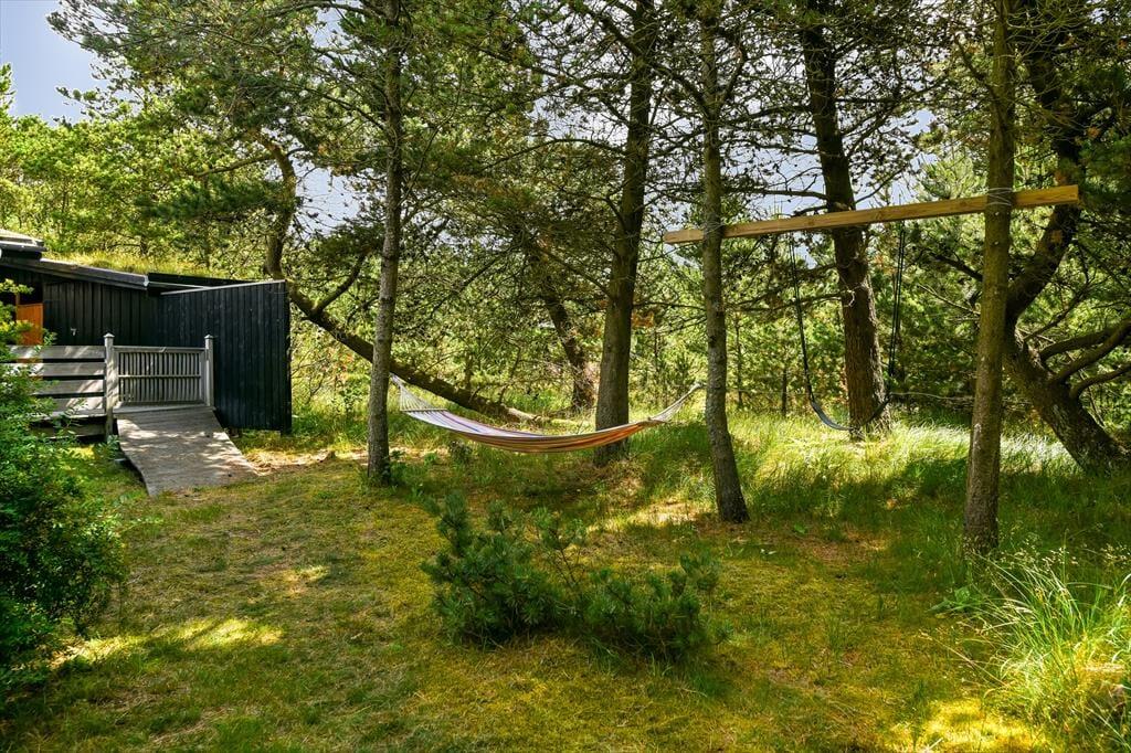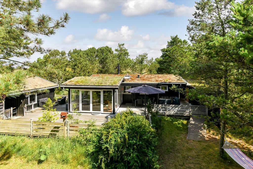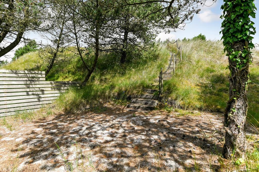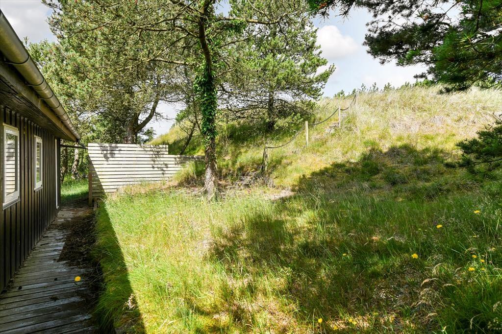 Naturgrunden er virkelig en idyllisk oase: Her er masser af plads til både leg og afslapning, og du kan tilmed gå på opdagelse mellem træerne eller op på klittoppen for at nyde solen og de fredfyldte omgivelser. Rundt om huset er der flere terrasseområder, hvor du kan slænge dig i liggestolene eller samles med dine kære til en kølig forfriskning i loungeafdelingen. Om morgenen kan du skylle dig under udebruseren til lyden af fuglesang, og senere på dagen er det måske tid til at tænde op i grillen og forberede aftensmaden, mens børnene hopper på trampolinen eller leger i det grønne.