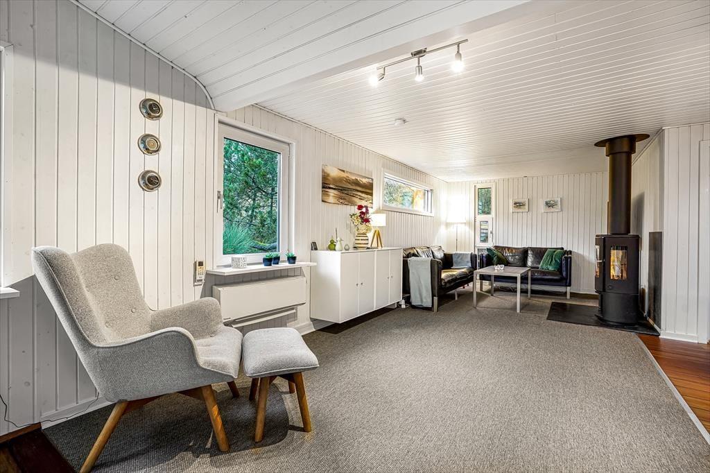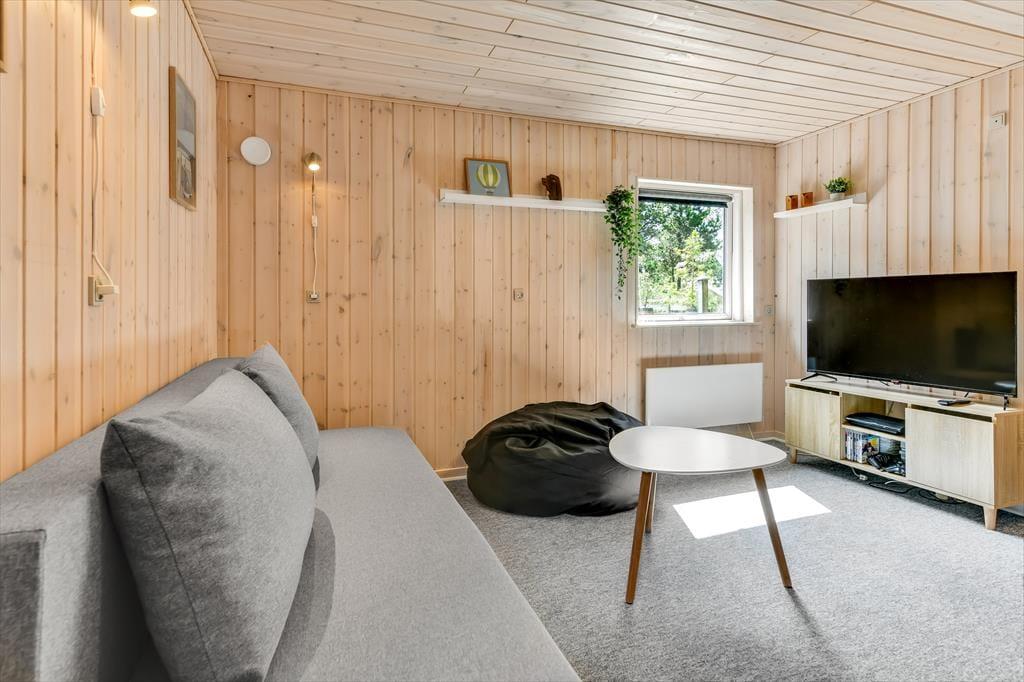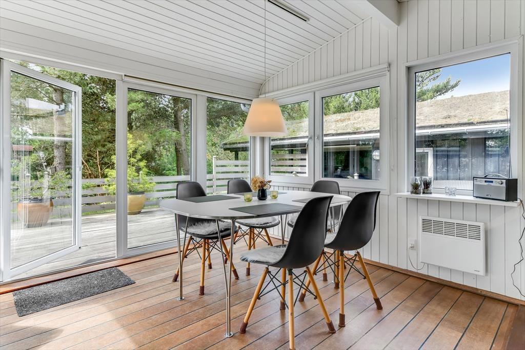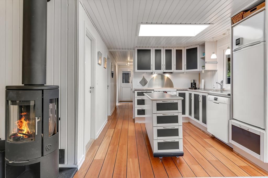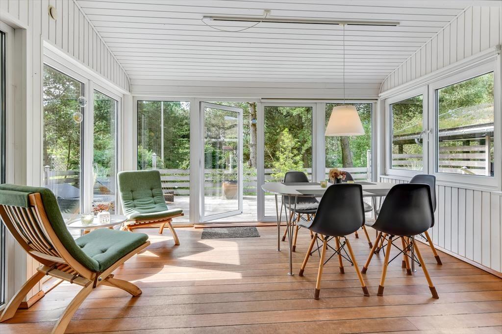 Du bliver mødt af husets hyggelige og rare atmosfære, så snart du træder indenfor. De tre soveværelser og det rummelige badeværelse hører med til det gode helhedsindtryk, men dagens vågne timer kommer du nok primært til at tilbringe i opholdsrummet, hvor stue og køkken ligger i åben forbindelse. Hvis du elsker at lave mad, kan du glæde dig til at bruge god tid på at stege og brase i den veludstyrede køkkenafdeling – og hvis du hellere vil slænge dig på mere tilbagelænet vis, kan du tænde op i brændeovnen og sætte dig godt til rette i sofahjørnet. Spisebordet er placeret i en ende af stuen, hvor der er vinduer vendt mod tre verdenshjørner, så det føles nærmest som at sidde i en udestue, når du nyder lysindfaldet og kigger ud på den grønne grund. I annekset finder du et aktivitetsrum med blandt andet bordfodbold og dart, der sørger for mange timers sjov og underholdning.
