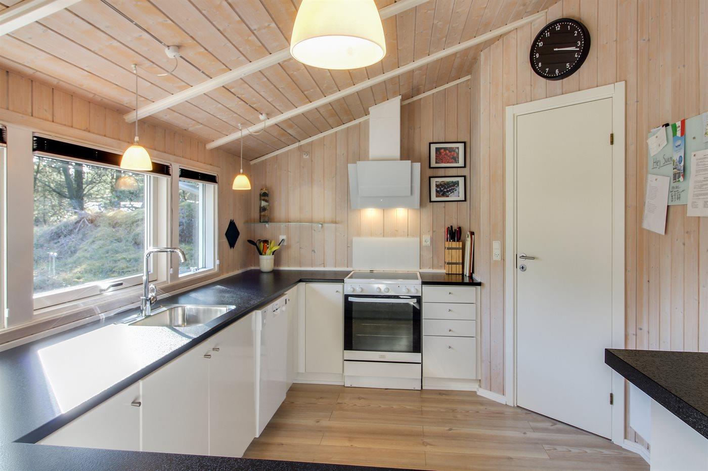 Køkkenet er udstyret med 1 køleskab. Der er 4 keramiske kogeplader, varmluftovn, mikrobølgeovn samt opvaskemaskine.