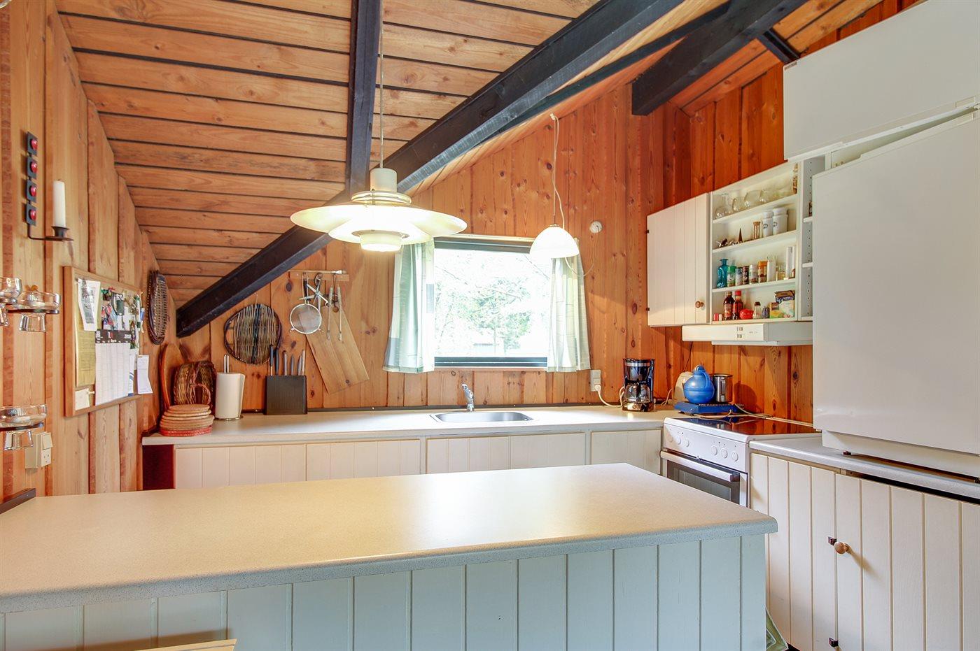 Køkkenet er udstyret med 1 køleskab. Der er 4 elkogeplader, bageovn samt opvaskemaskine (bordmodel).