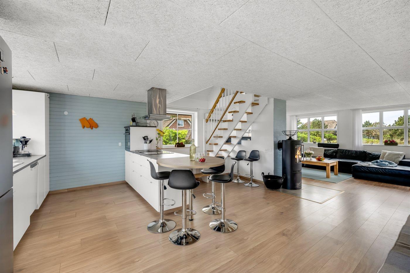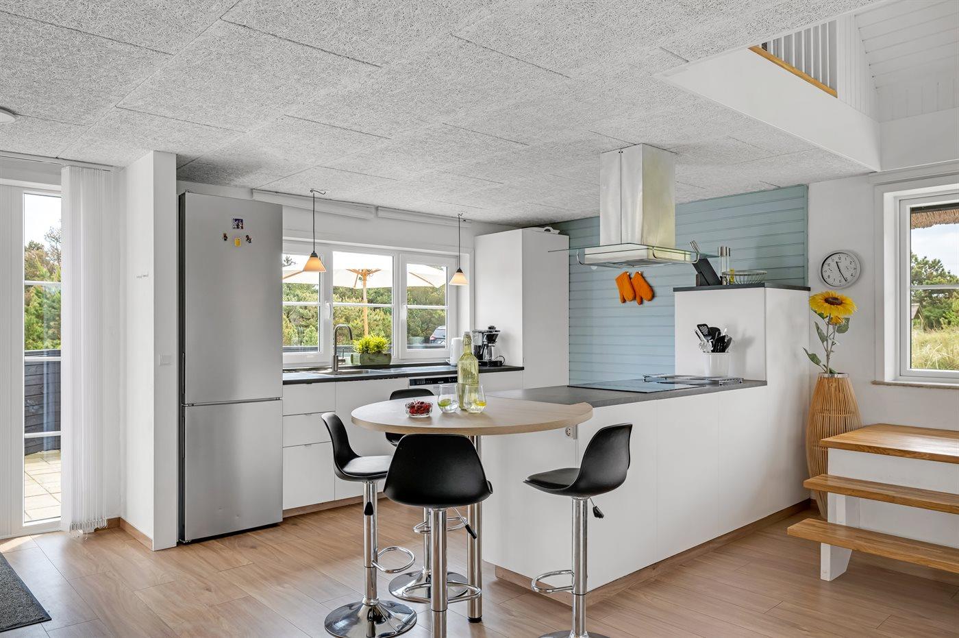Køkkenet er udstyret med 1 køleskab. Der er 4 induktionskogeplader, varmluftovn, mikrobølgeovn samt opvaskemaskine.