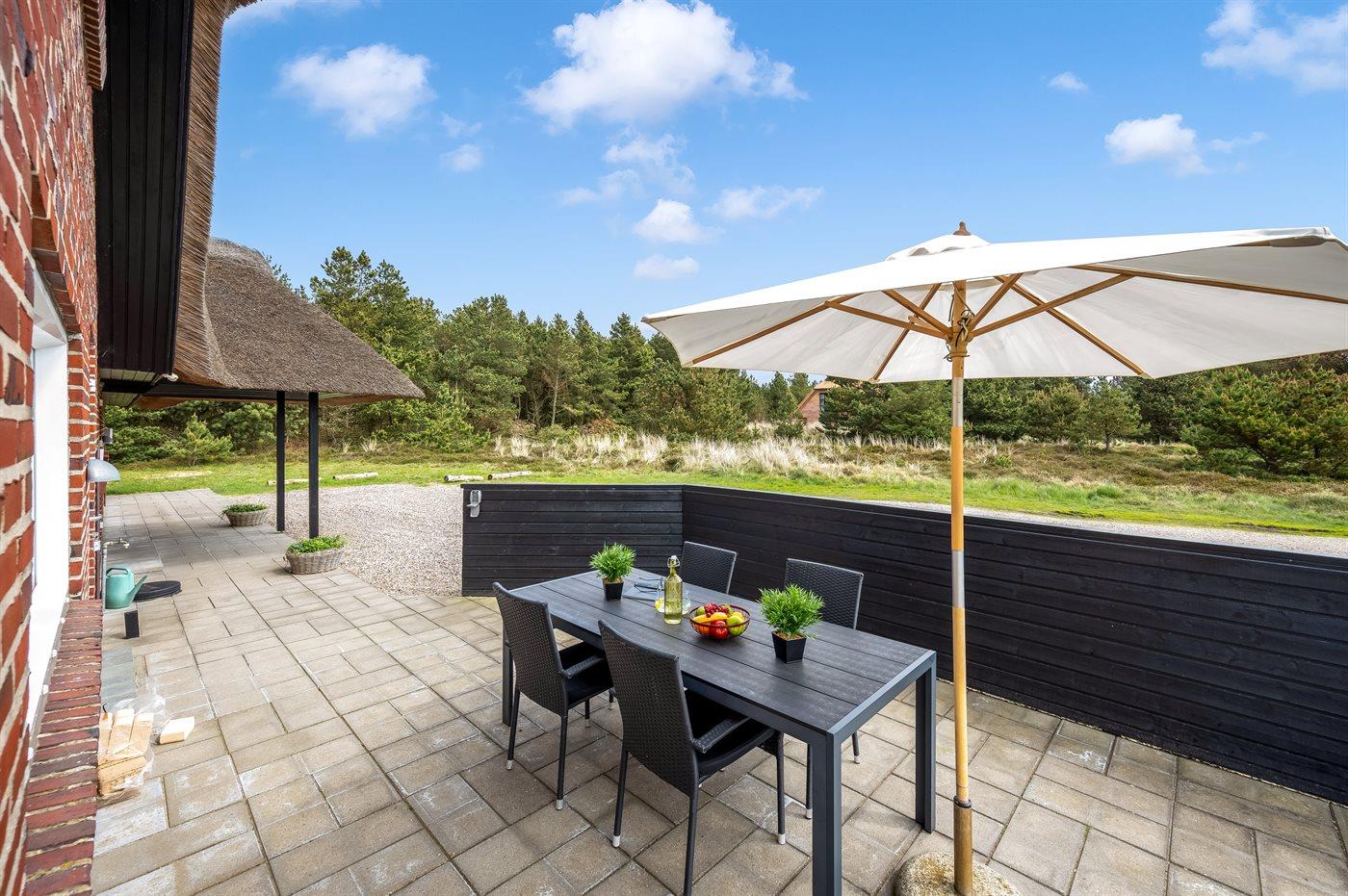 Ferieboligen er beliggende på en 2537 m² stor naturgrund. Der er 500 m til havet. Nærmeste forretning er beliggende i en afstand af 1000 m. Til ferieboligen hører 200 m² terrasseareal. Desuden er der 20 m² overdækket terrasse. Der er redskabsrum. Gynge. Sandkasse. Grill til rådighed. Der er installeret stik til opladning af elbil. Type 2 stik. Parkering ved ferieboligen.