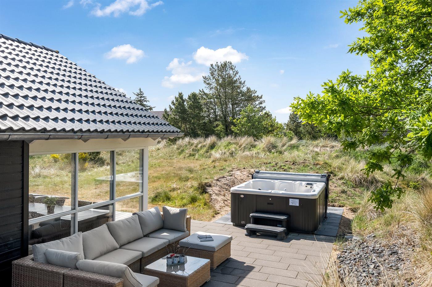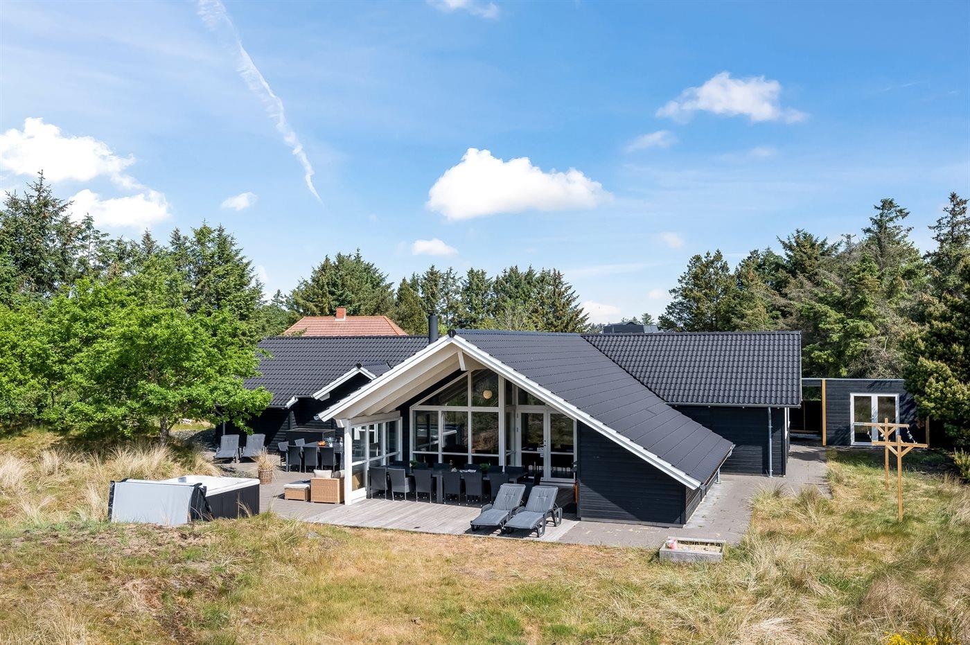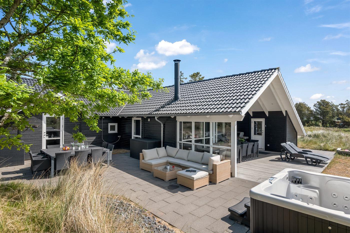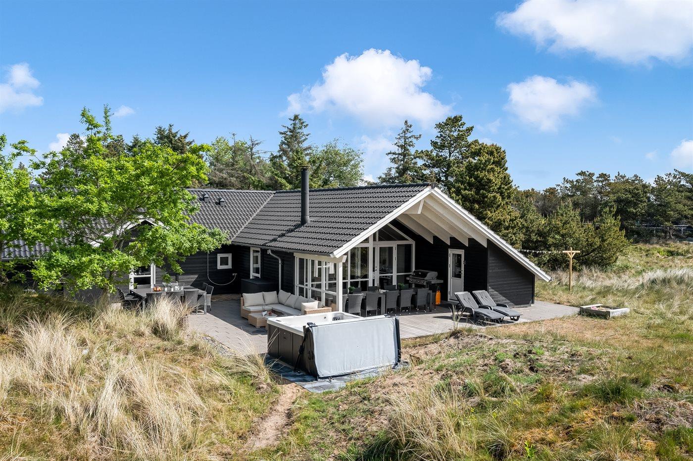 Velholdt sommerhus i Blåvand med aktivitetsrum, spa og elbil-ladestander tæt på strand og by.