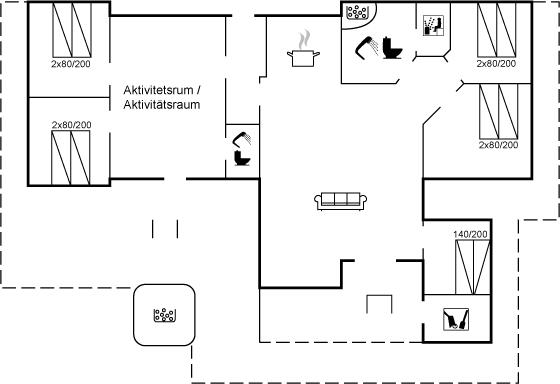 I aktivitetsrummet er der følgende udstyr: Billard-/poolbord. Dart. Arkadespillemaskine. Der er gulvvarme i aktivitetsrummet.