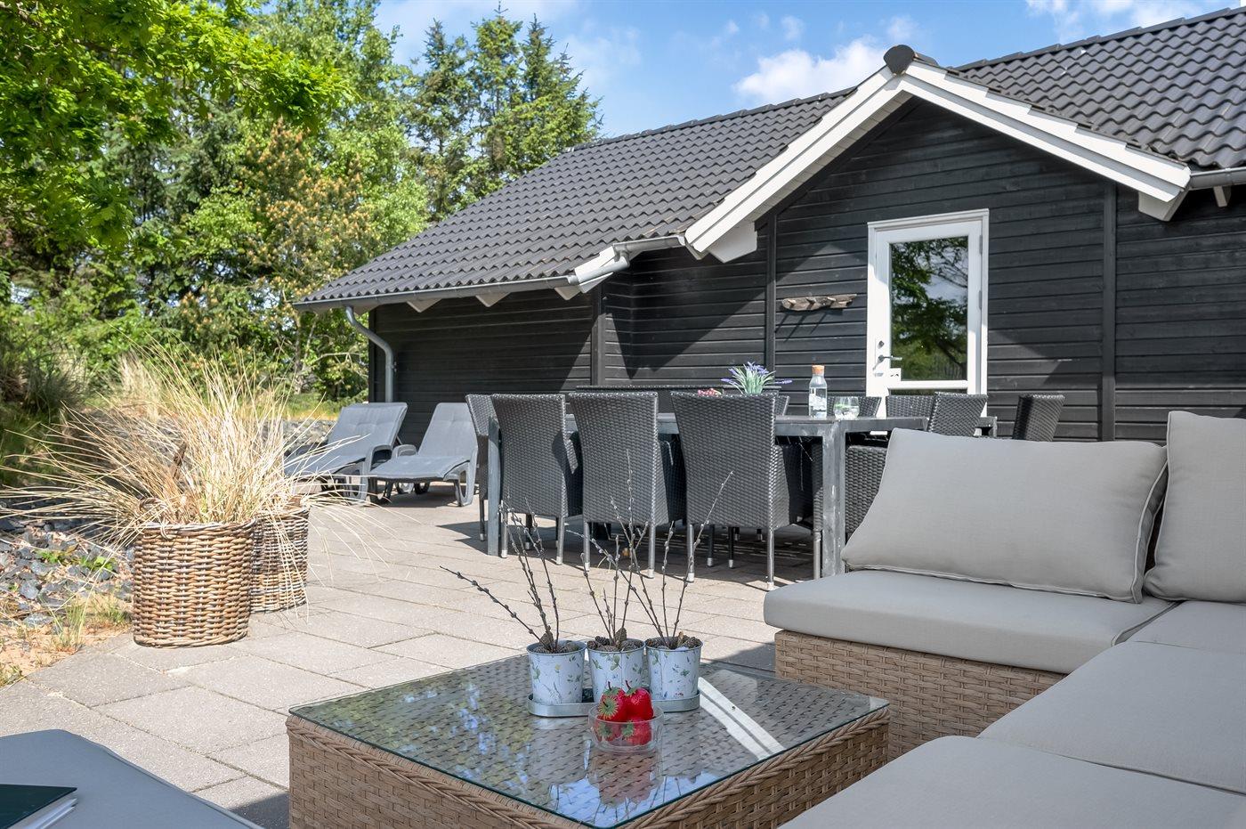 Ferieboligen er beliggende på en 1700 m² stor naturgrund. Der er 1500 m til havet. Nærmeste forretning er beliggende i en afstand af 150 m. Til ferieboligen hører åbent terrasseareal. Desuden er der overdækket terrasse. Der er redskabsrum. Grill til rådighed. Der er installeret stik til opladning af elbil. Type 2 stik. Med 11 kW ladeeffekt. Parkering ved ferieboligen.