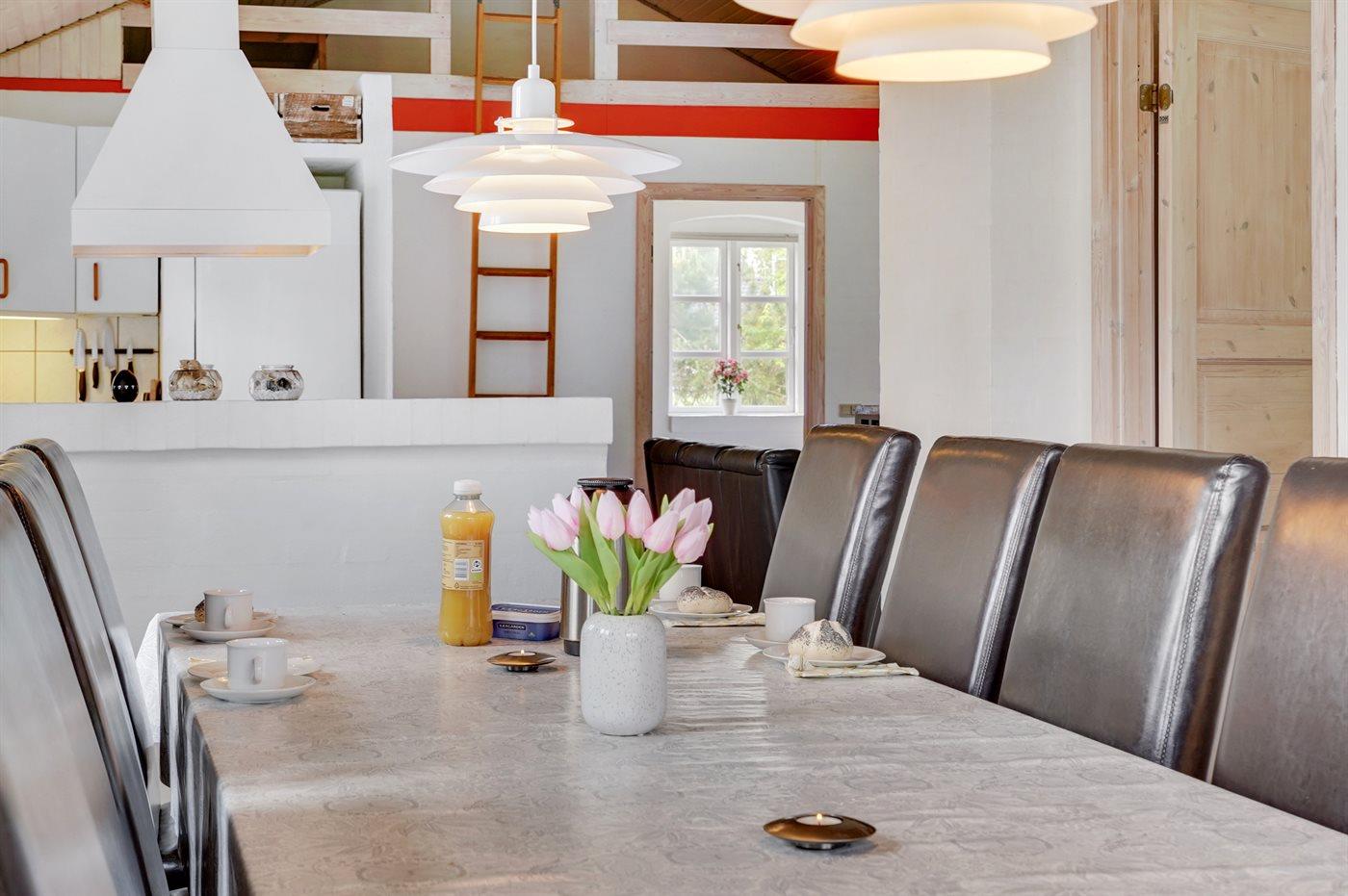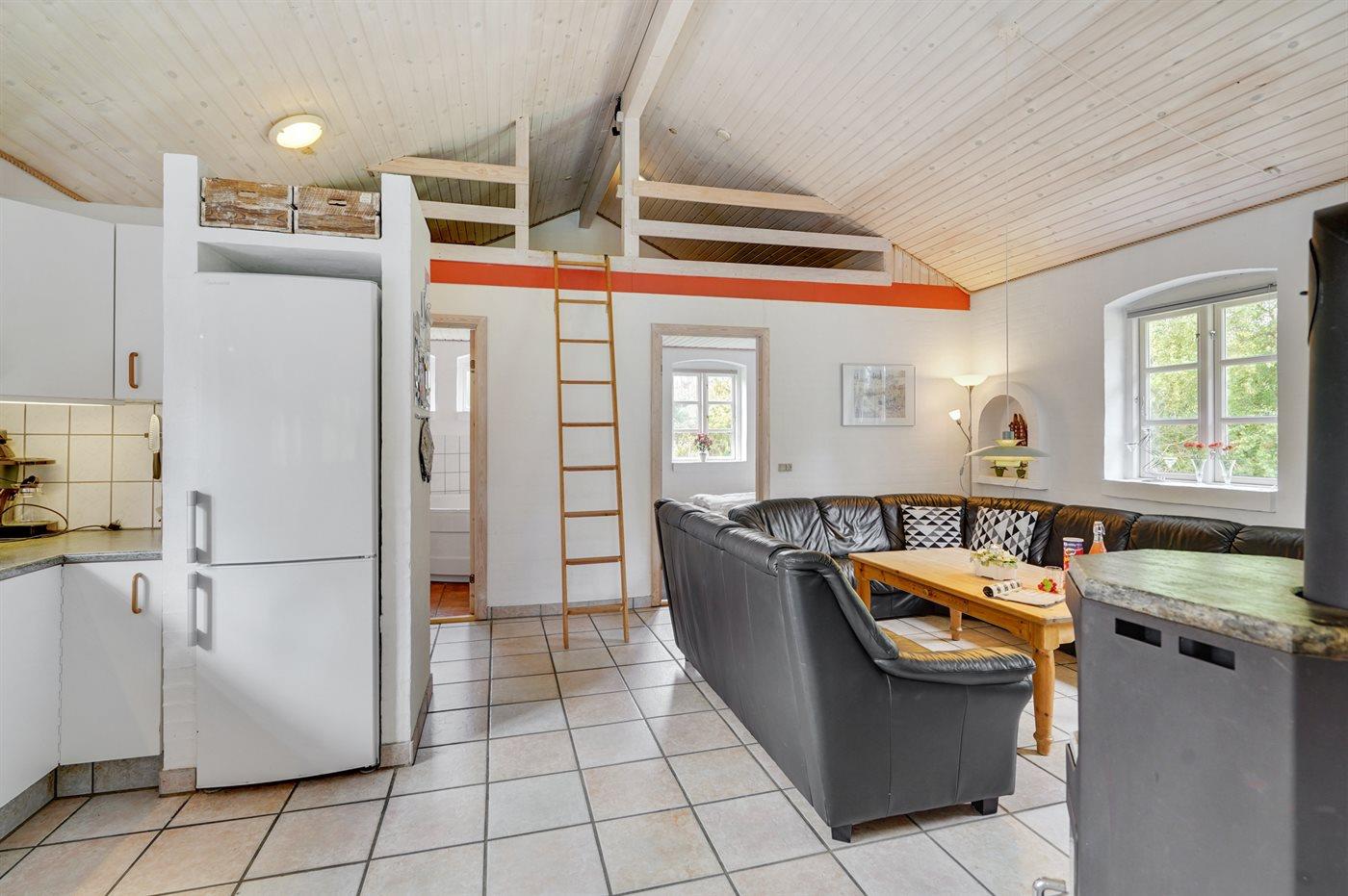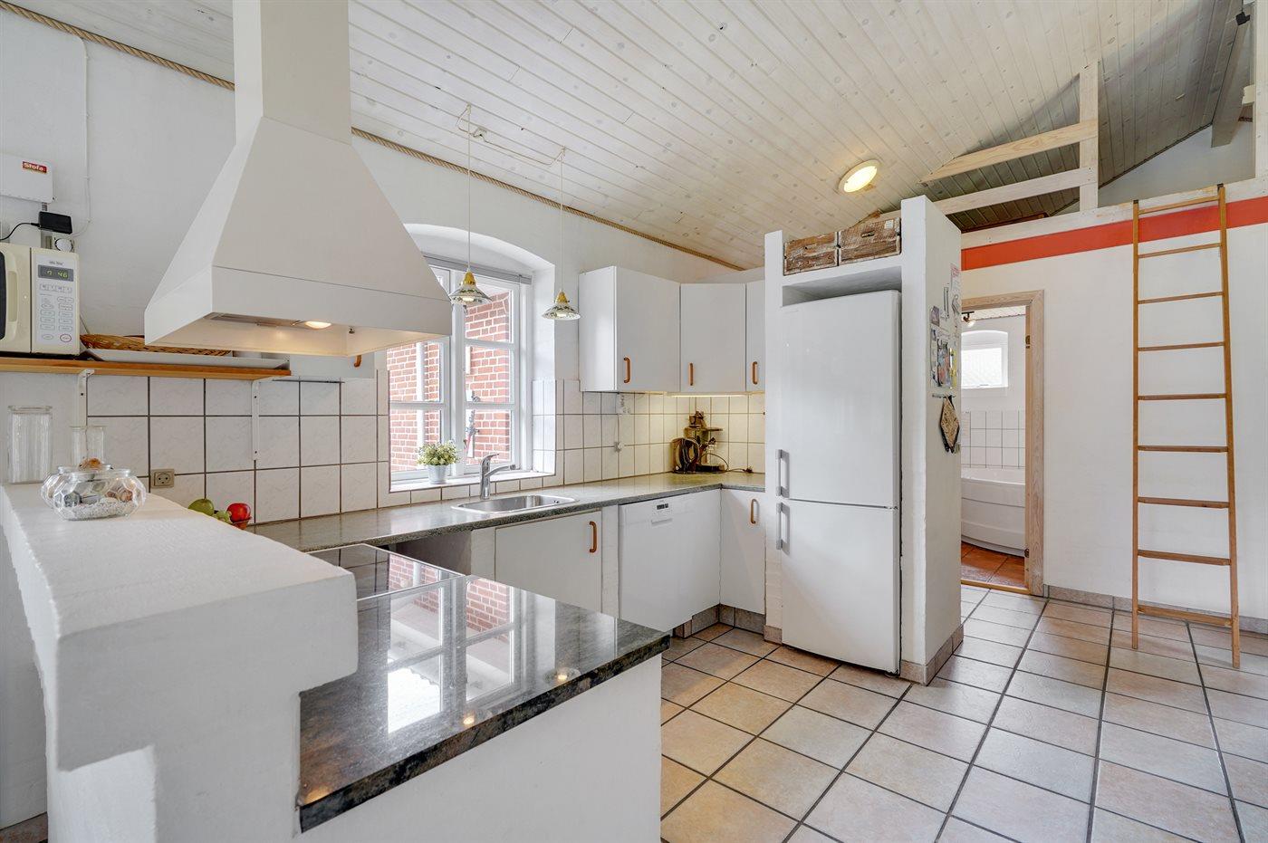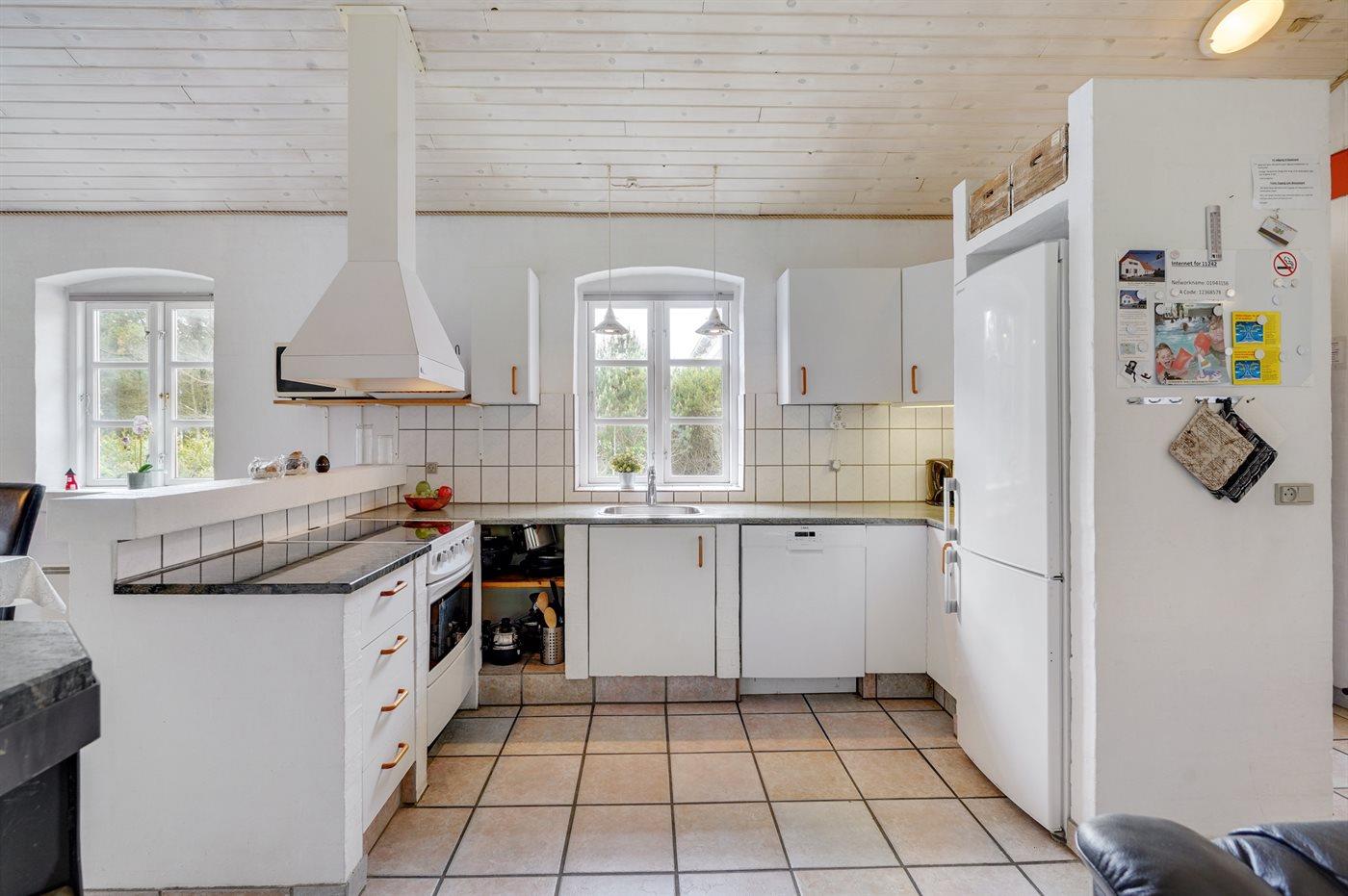 Køkkenet er udstyret med 1 køleskab. Der er 4 keramiske kogeplader, varmluftovn, mikrobølgeovn samt opvaskemaskine.