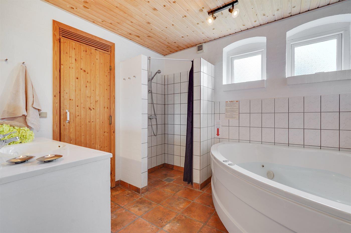 Der er 2 badeværelser med bruseniche og 2 toiletter. Der er gulvvarme på 2 badeværelser. I saunaen er der mulighed for afslapning.