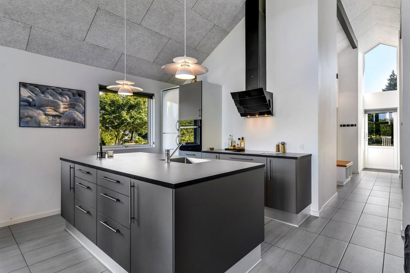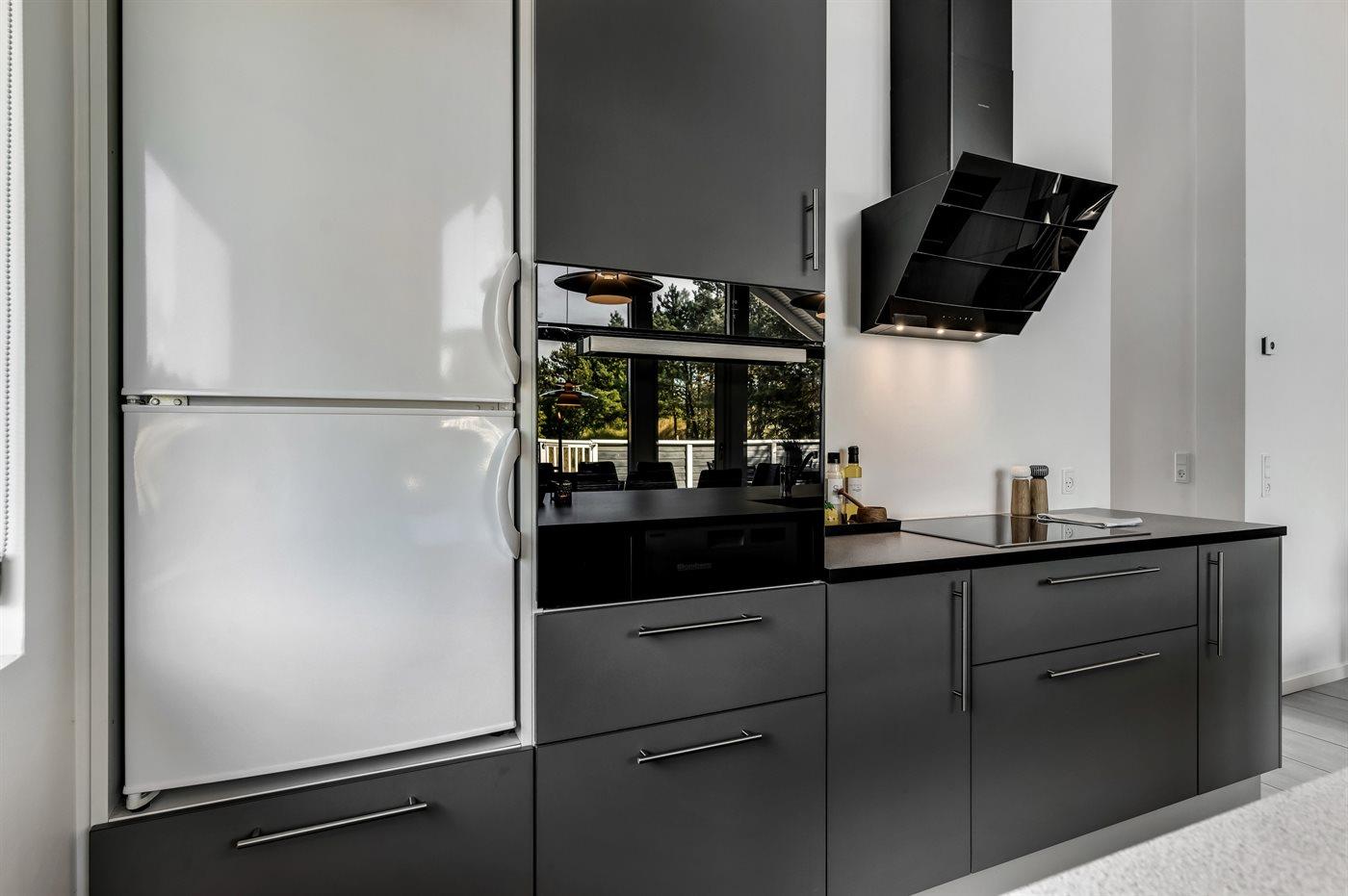 Køkkenet er udstyret med 1 køleskab. Der er 4 keramiske kogeplader, varmluftovn, mikrobølgeovn samt opvaskemaskine.
