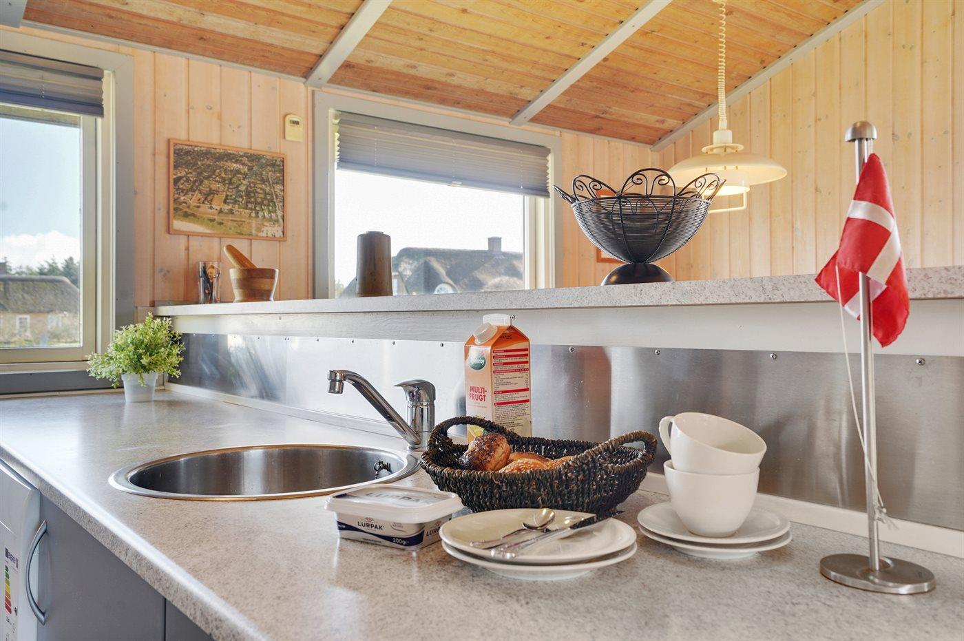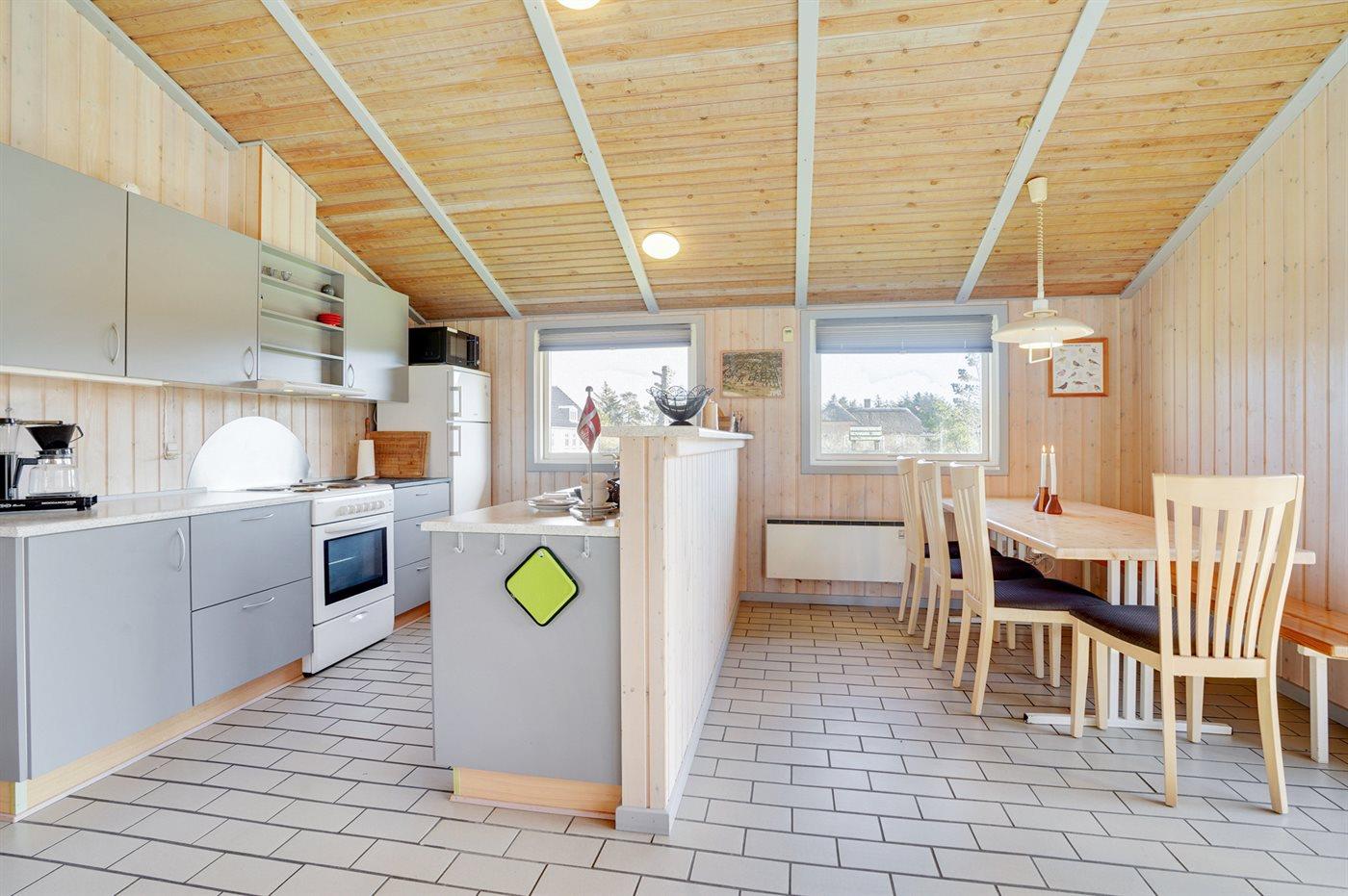 Køkkenet er udstyret med 1 køleskab. Der er 4 elkogeplader, bageovn, mikrobølgeovn samt opvaskemaskine.