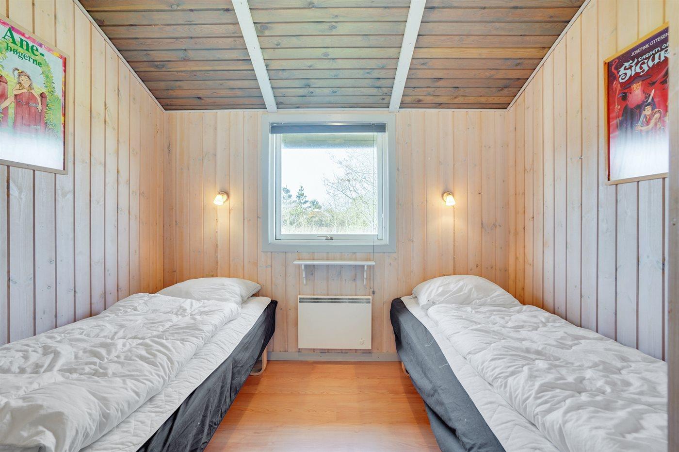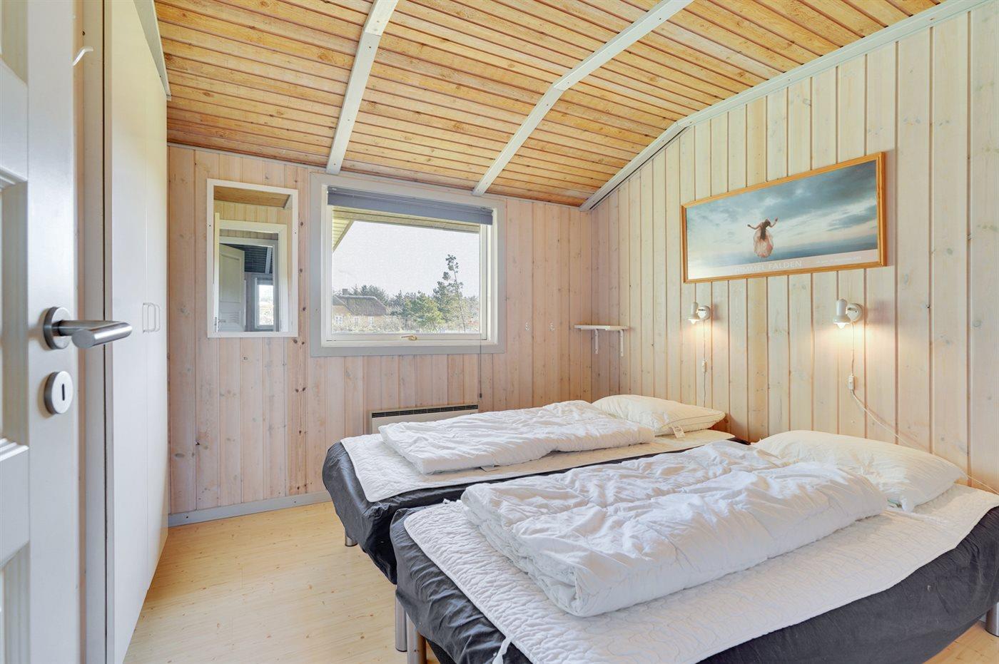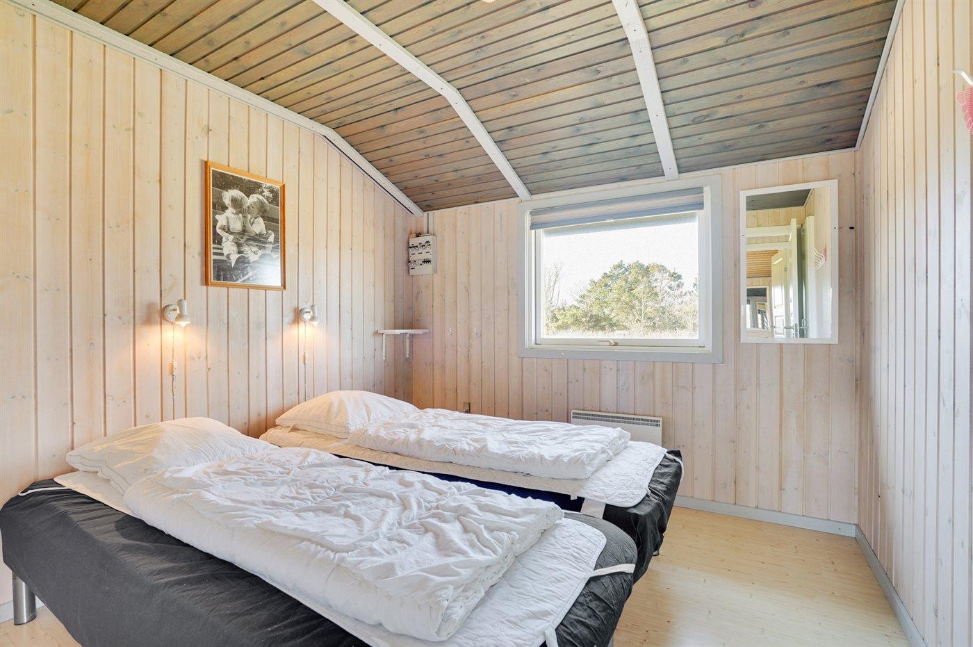 Der er i alt 3 soveværelser. Sovepladserne fordeler sig på: 4 sovepladser i dobbeltsenge. 2 sovepladser i enkeltsenge. Derudover er der 1 stk. barneseng.