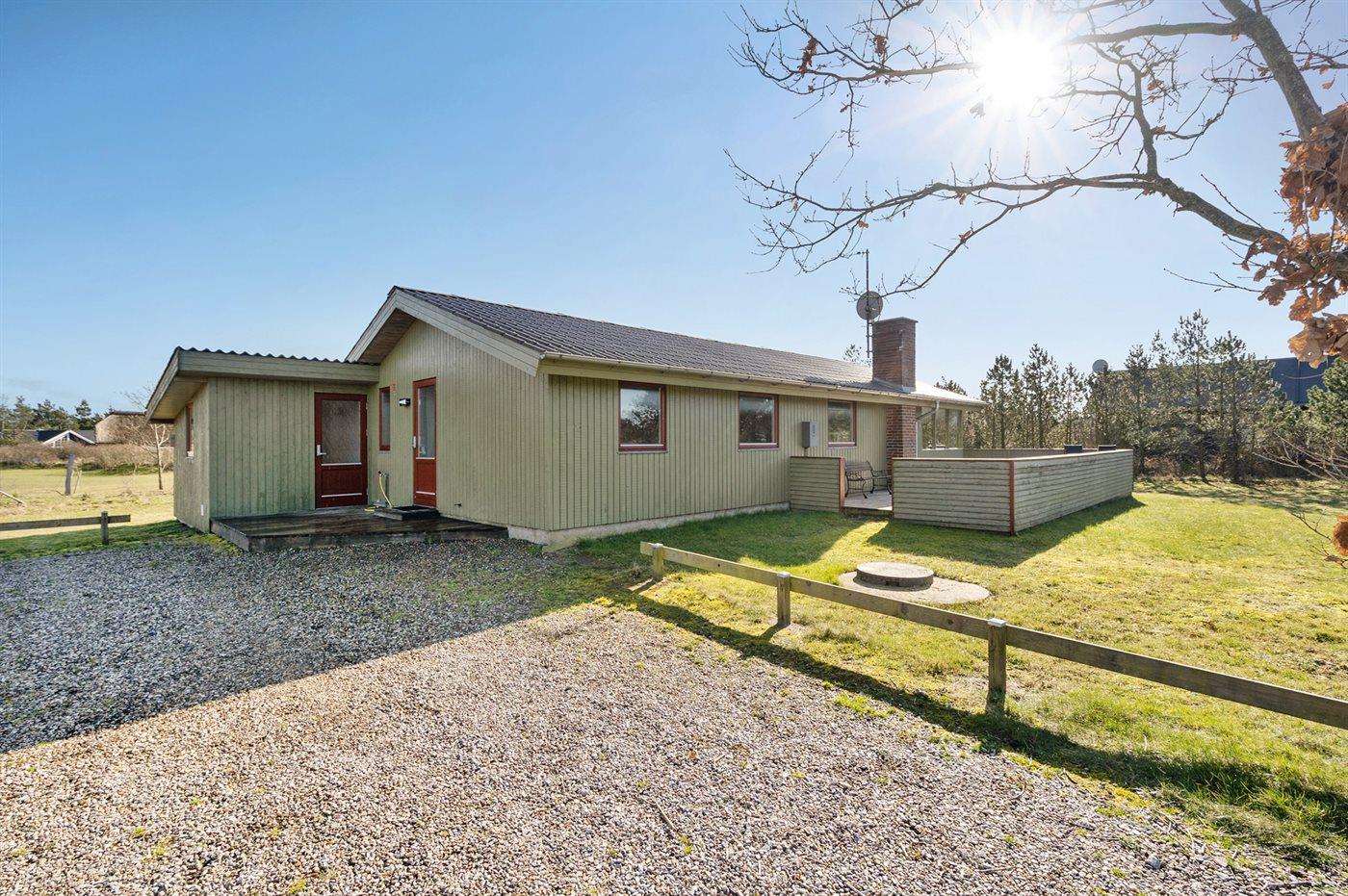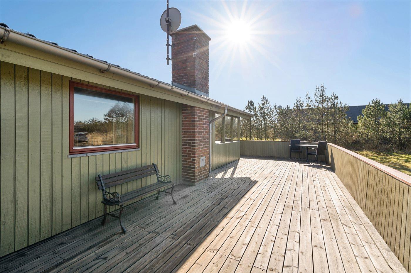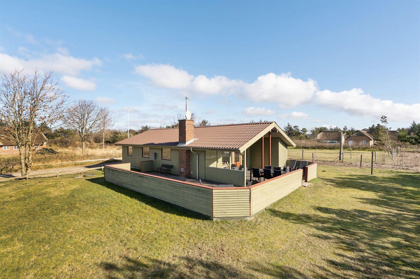 Hyggeligt sommerhus tæt på Blåvands strand med store terrasser og plads til husdyr.