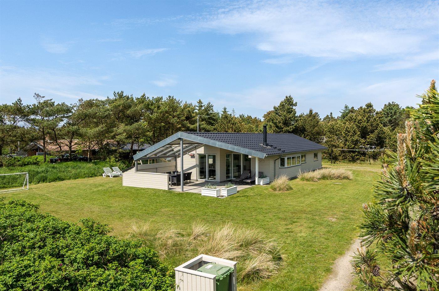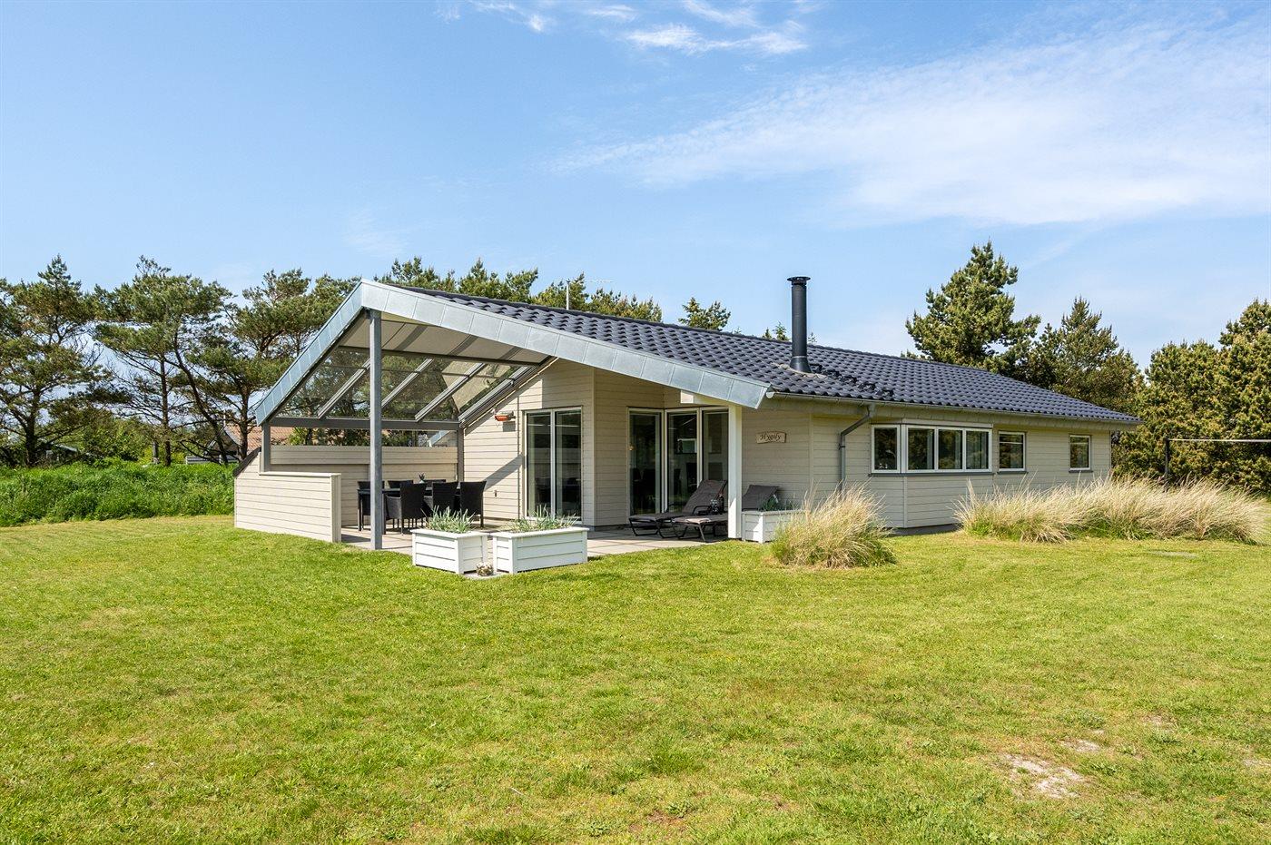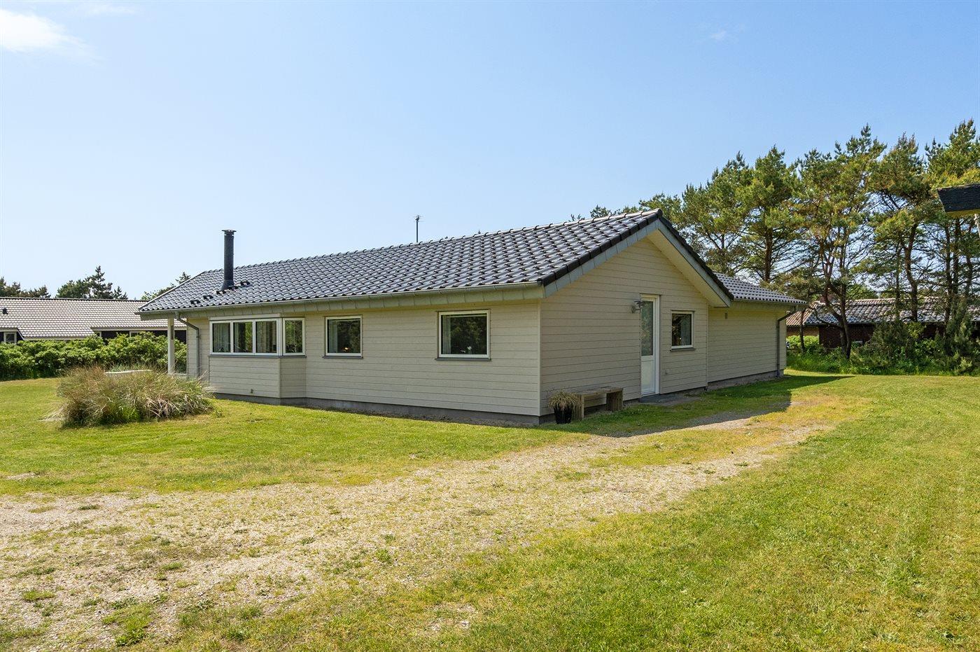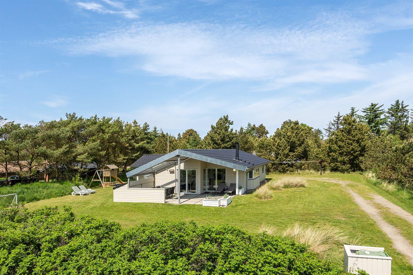 Kun 600 m fra stranden ligger dette flotte og meget velholdte sommerhus med et boligareal på i alt 114 m2 og med plads til 6 personer. Huset, som senest er renoveret i 2021, ligger på en dejlig stor grund. Der findes legeområde med legestativ, gynge og sandkasse, hvortil der hører 5 m2 overdækket terrasse. Der findes en dejlig stor, overdækket og læfyldt terrasse på 29 m2 med markise, ovenlys og terrassevarmer samt gode havemøbler og Weber-grill. Den herlige lyse opholdsstue med hyggelig alkove indeholder brændeovn, radio med CD-afspiller samt TV med parabol (digital). Desuden forefindes gratis, trådløs internetforbindelse (egen computer skal medbringes). Husets sovepladser fordeler sig på 3 gode soveværelser; 2 med dobbeltseng og 1 med 2 enkeltsenge. Det åbne køkken er bl.a. udstyret med bl.a. opvaskemaskine, mikrobølgeovn, varmluftovn, komfur med keramiske kogeplader samt fryser. Rummeligt badeværelse med gulvvarme, bruser, 2 pers. spa samt sauna. Ekstra badeværelse - ligeledes med gulvvarme og bruser. Af yderligere udstyr i huset kan nævnes vaskemaskine og tørretumbler. Der er installeret type 2 stik med 11 kW ladeeffekt til opladning af elbil.