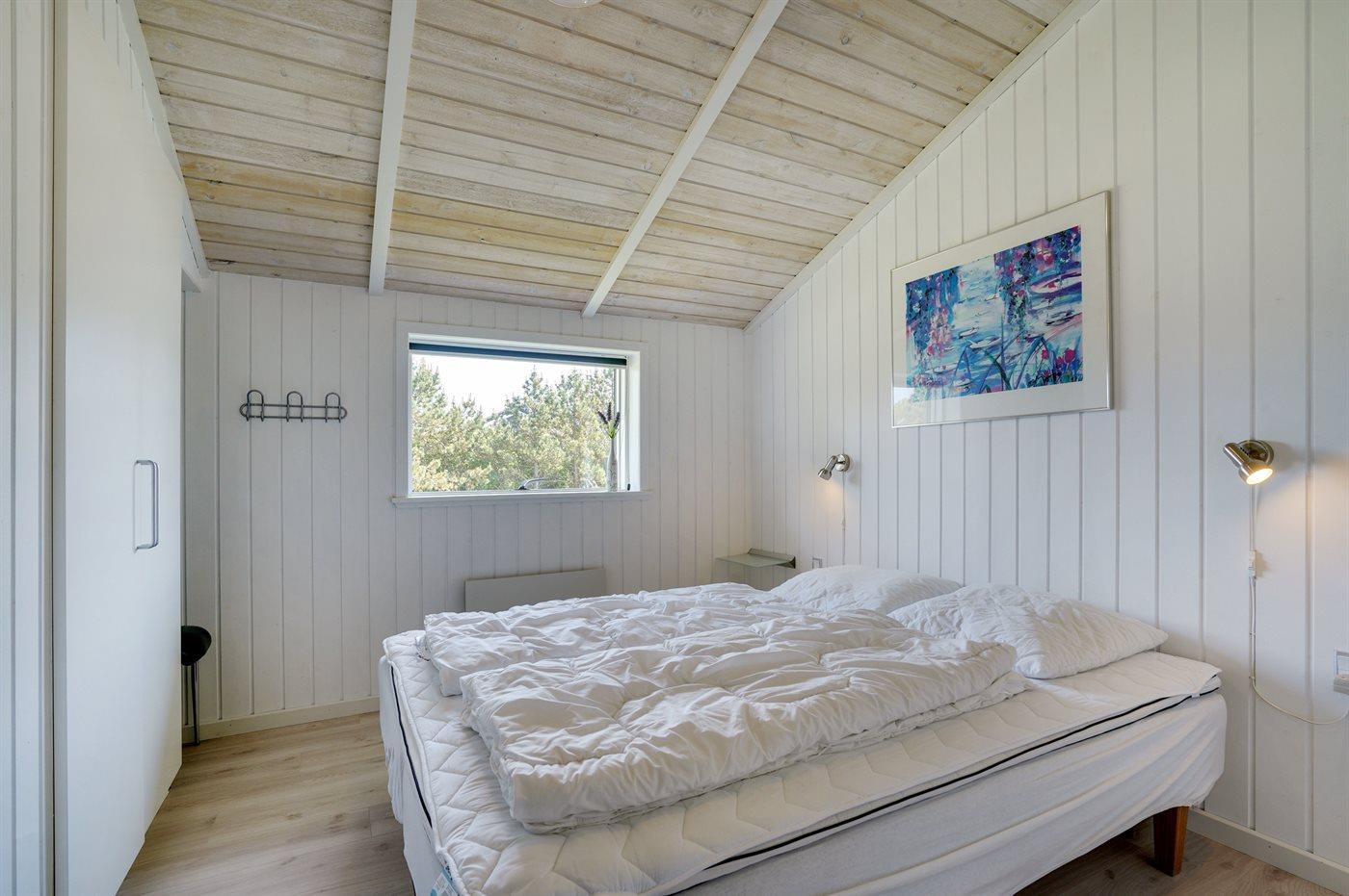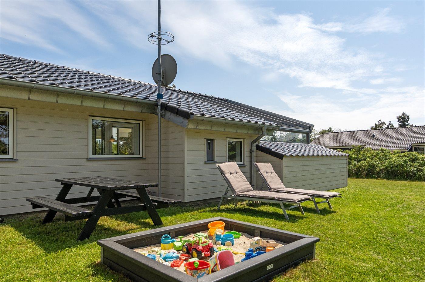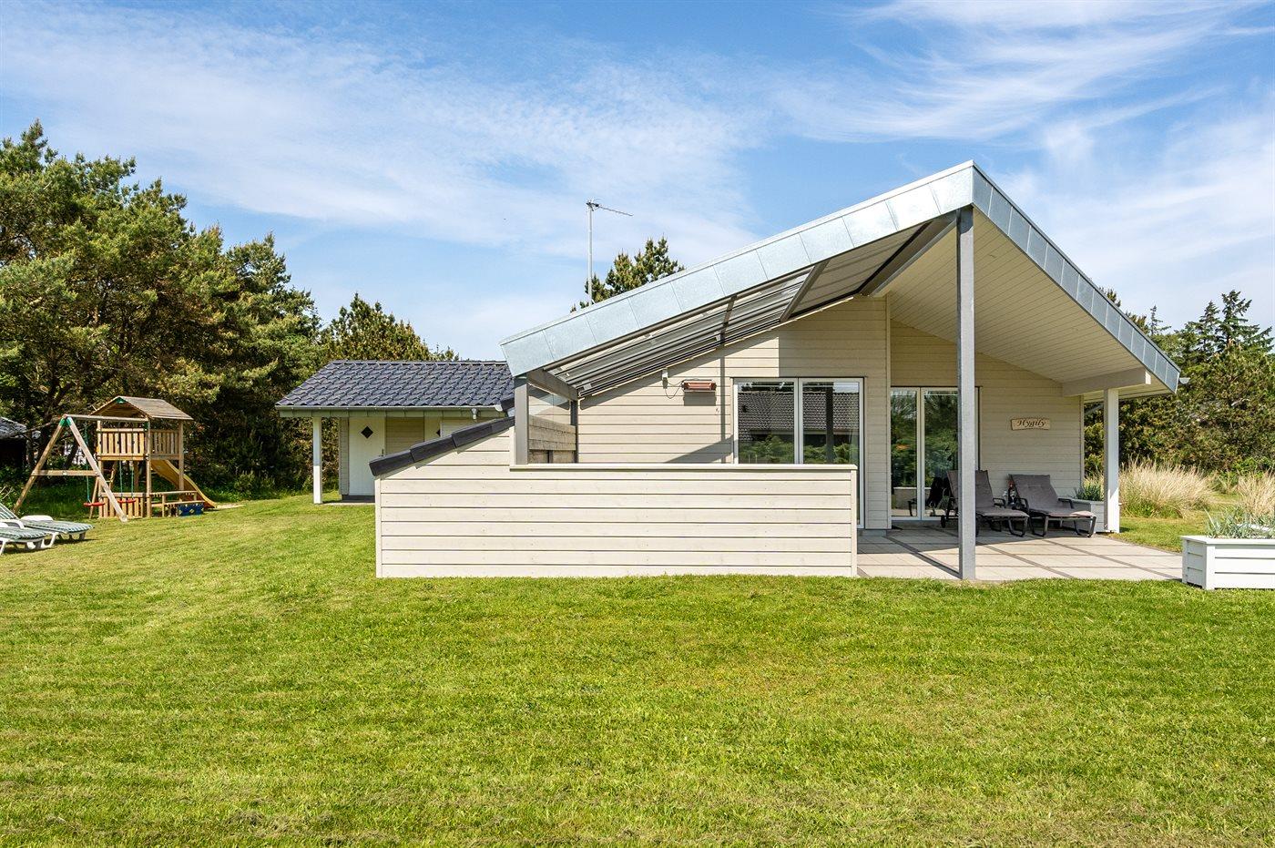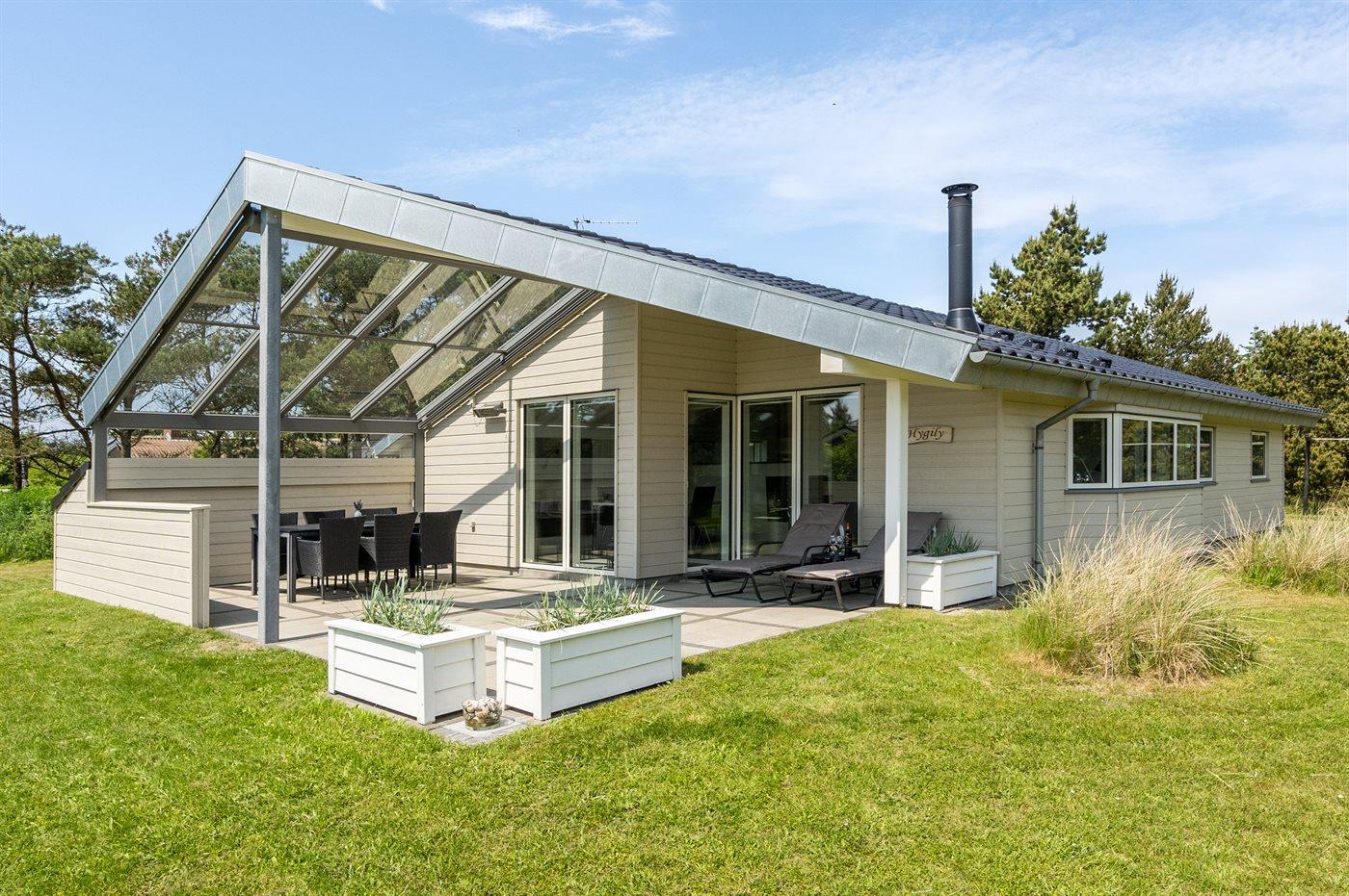 Kun 600 m fra stranden ligger dette flotte og meget velholdte sommerhus med et boligareal på i alt 114 m2 og med plads til 6 personer. Huset, som senest er renoveret i 2021, ligger på en dejlig stor grund. Der findes legeområde med legestativ, gynge og sandkasse, hvortil der hører 5 m2 overdækket terrasse. Der findes en dejlig stor, overdækket og læfyldt terrasse på 29 m2 med markise, ovenlys og terrassevarmer samt gode havemøbler og Weber-grill. Den herlige lyse opholdsstue med hyggelig alkove indeholder brændeovn, radio med CD-afspiller samt TV med parabol (digital). Desuden forefindes gratis, trådløs internetforbindelse (egen computer skal medbringes). Husets sovepladser fordeler sig på 3 gode soveværelser; 2 med dobbeltseng og 1 med 2 enkeltsenge. Det åbne køkken er bl.a. udstyret med bl.a. opvaskemaskine, mikrobølgeovn, varmluftovn, komfur med keramiske kogeplader samt fryser. Rummeligt badeværelse med gulvvarme, bruser, 2 pers. spa samt sauna. Ekstra badeværelse - ligeledes med gulvvarme og bruser. Af yderligere udstyr i huset kan nævnes vaskemaskine og tørretumbler. Der er installeret type 2 stik med 11 kW ladeeffekt til opladning af elbil.
