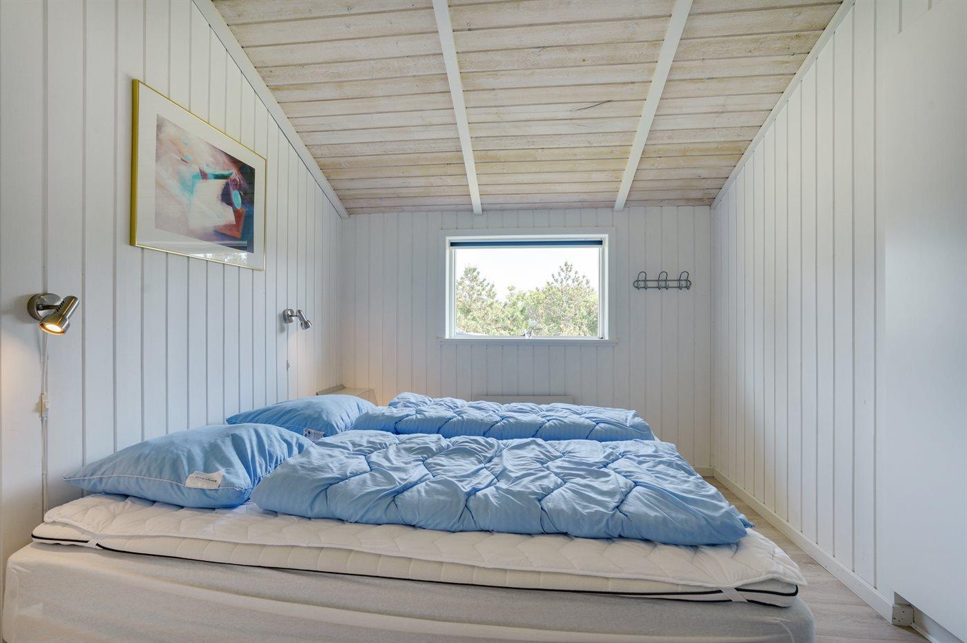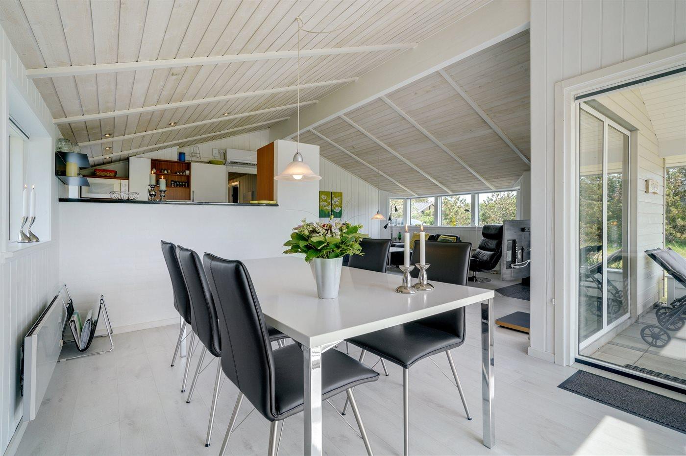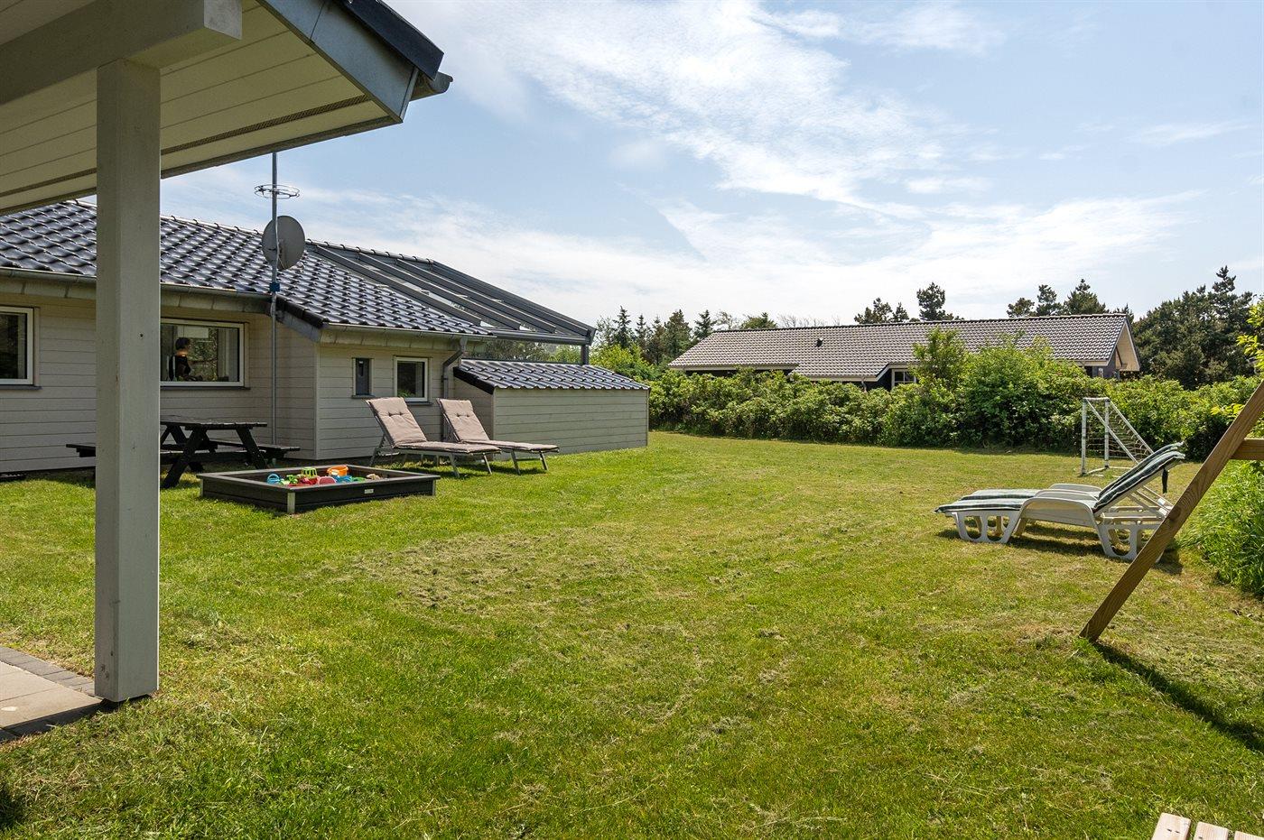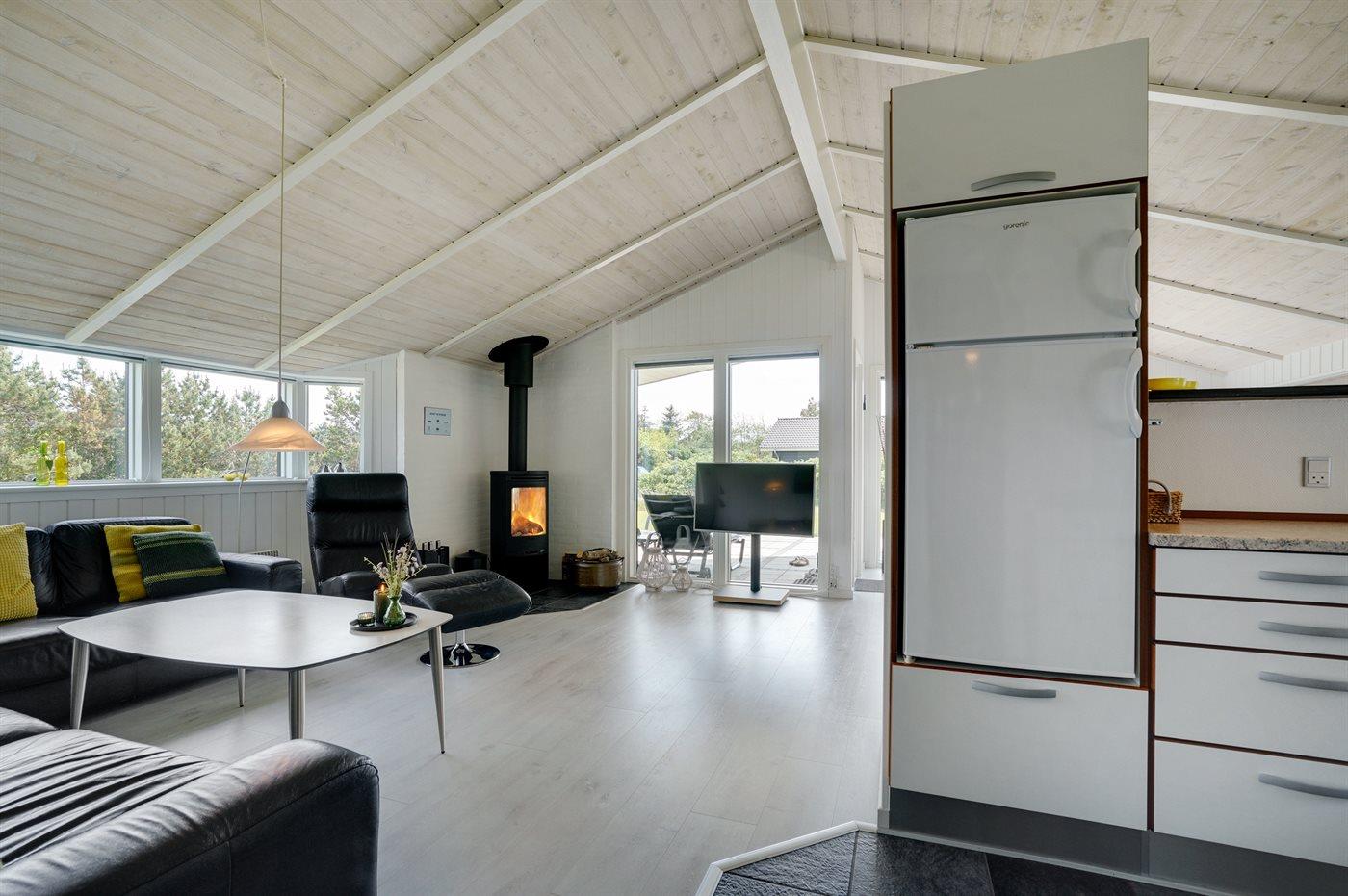 Kun 600 m fra stranden ligger dette flotte og meget velholdte sommerhus med et boligareal på i alt 114 m2 og med plads til 6 personer. Huset, som senest er renoveret i 2021, ligger på en dejlig stor grund. Der findes legeområde med legestativ, gynge og sandkasse, hvortil der hører 5 m2 overdækket terrasse. Der findes en dejlig stor, overdækket og læfyldt terrasse på 29 m2 med markise, ovenlys og terrassevarmer samt gode havemøbler og Weber-grill. Den herlige lyse opholdsstue med hyggelig alkove indeholder brændeovn, radio med CD-afspiller samt TV med parabol (digital). Desuden forefindes gratis, trådløs internetforbindelse (egen computer skal medbringes). Husets sovepladser fordeler sig på 3 gode soveværelser; 2 med dobbeltseng og 1 med 2 enkeltsenge. Det åbne køkken er bl.a. udstyret med bl.a. opvaskemaskine, mikrobølgeovn, varmluftovn, komfur med keramiske kogeplader samt fryser. Rummeligt badeværelse med gulvvarme, bruser, 2 pers. spa samt sauna. Ekstra badeværelse - ligeledes med gulvvarme og bruser. Af yderligere udstyr i huset kan nævnes vaskemaskine og tørretumbler. Der er installeret type 2 stik med 11 kW ladeeffekt til opladning af elbil.