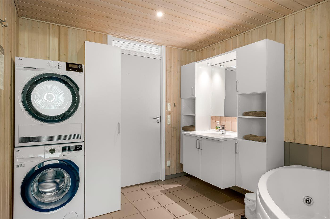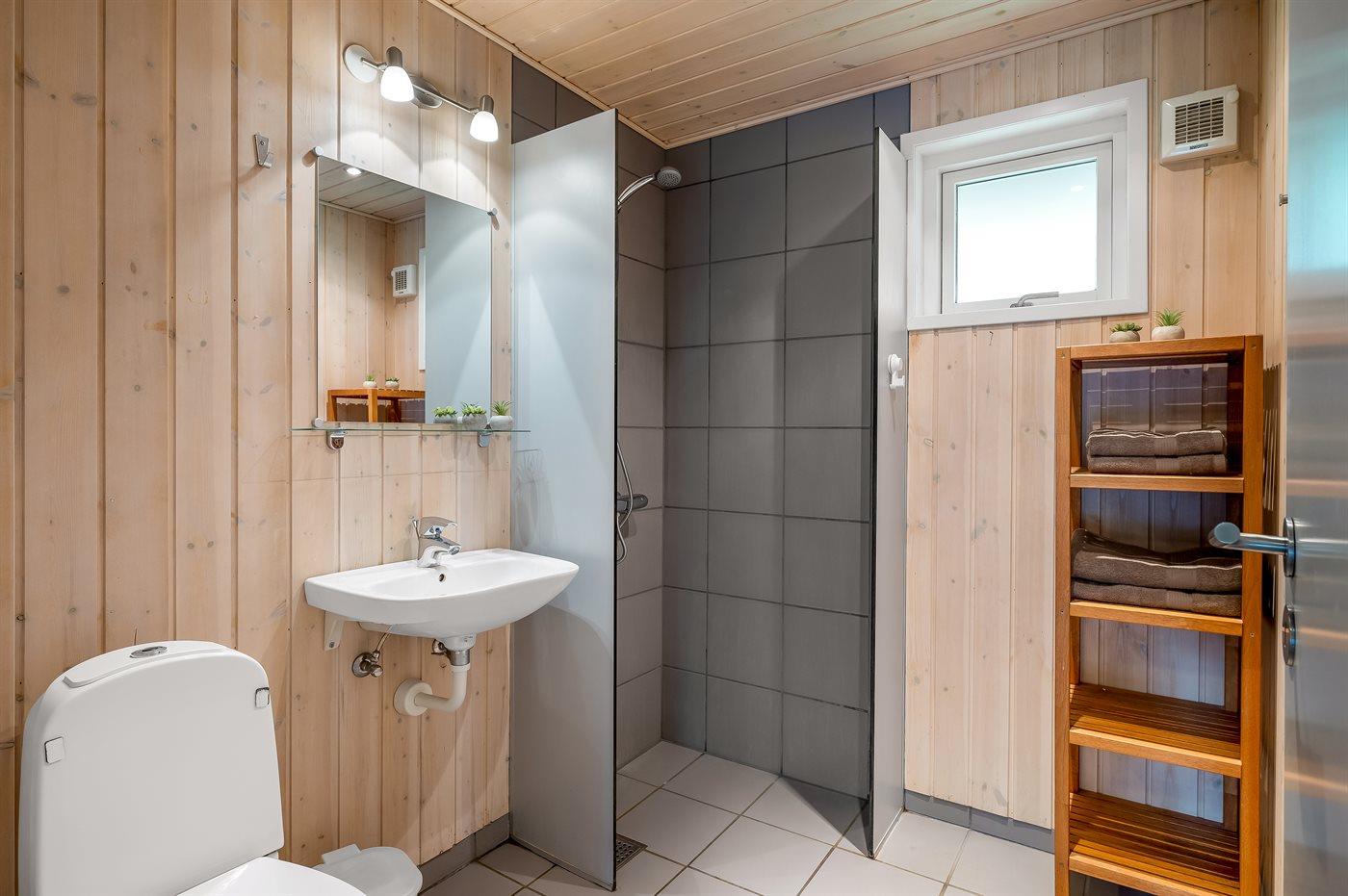2 badeværelser, begge med bruser. Fra det ene badeværelse er der adgang til sauna samt 2-pers. spa.