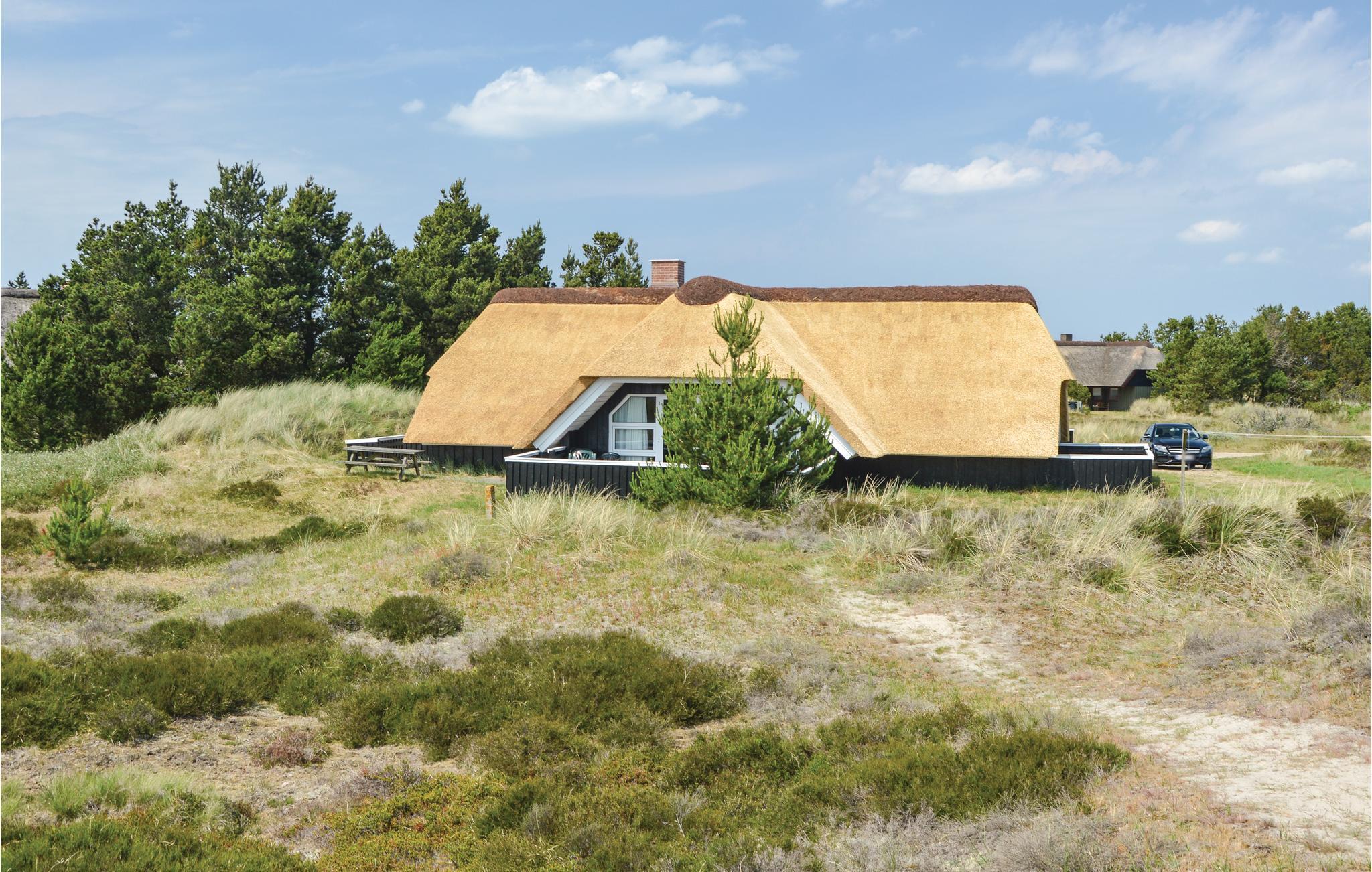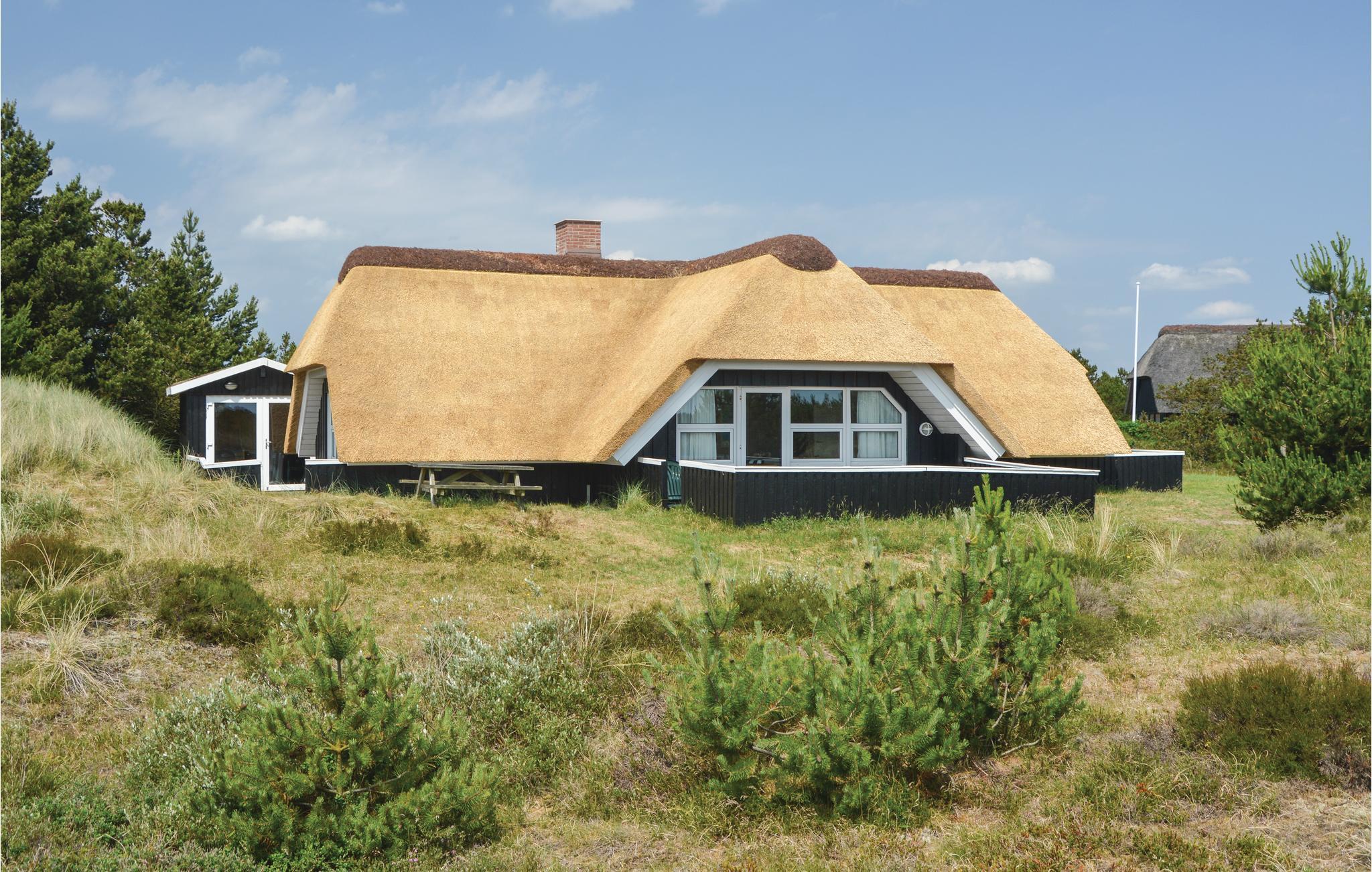 I den nordlige del af Blåvand, på en stor naturgrund med masser af plads til at boltre sig på, ligger dette flotte stråtækte feriehus af træ. Huset er veludstyret med faciliteter og smagfuldt indrettet med pæne og komfortable møbler. De fritliggende loftsbjælker er malet, så de står i flot kontrast til loftet og samtidig matcher møbler, lamper og øvrigt interiør, der omhyggeligt er mikset til en smagfuld enhed. Den dejlige natur i området indbyder til trave- og cykelture året rundt. Dette feriehus danner den perfekte ramme om en dejlig ferie for hele familien.