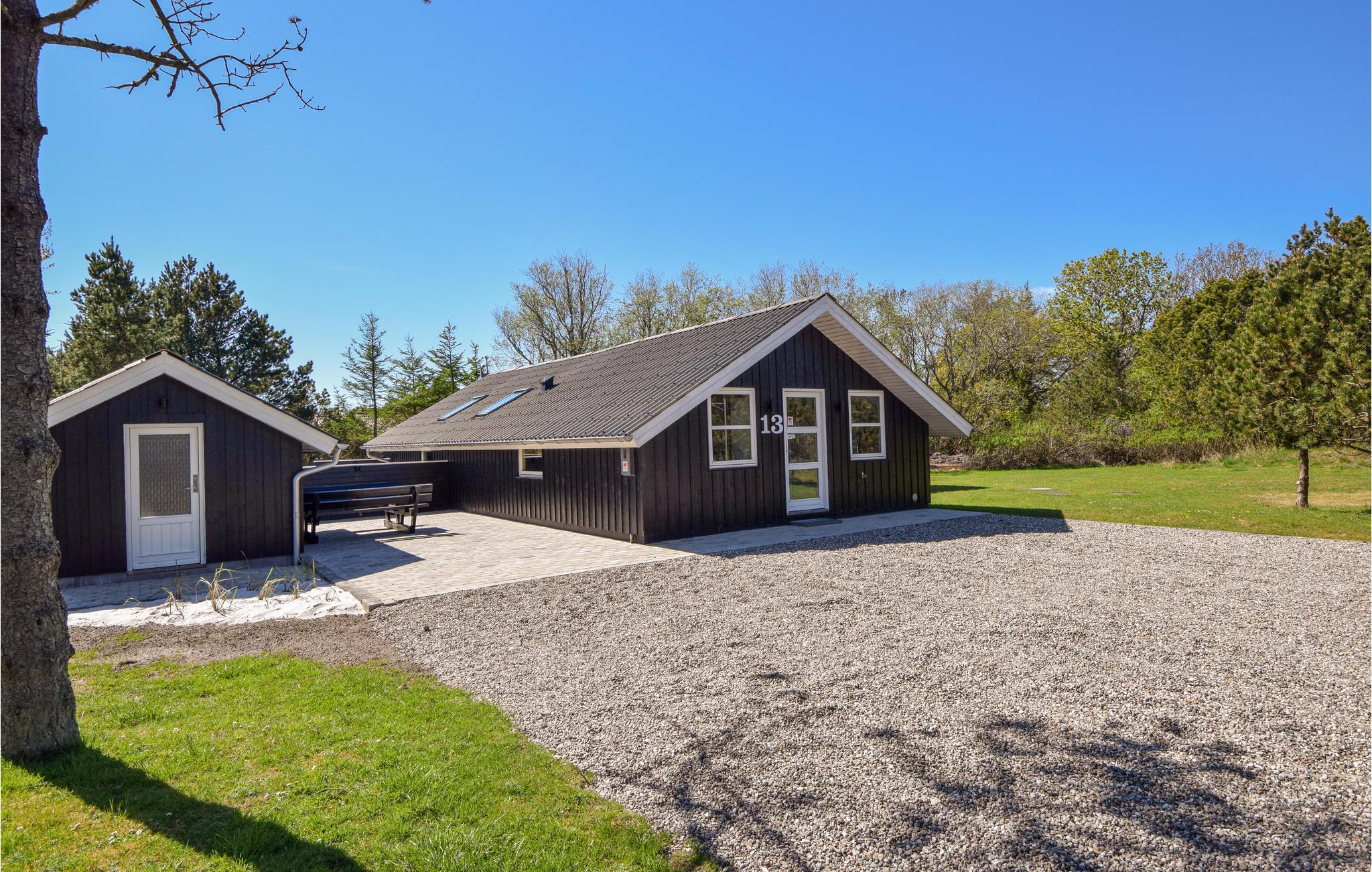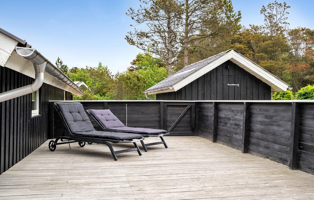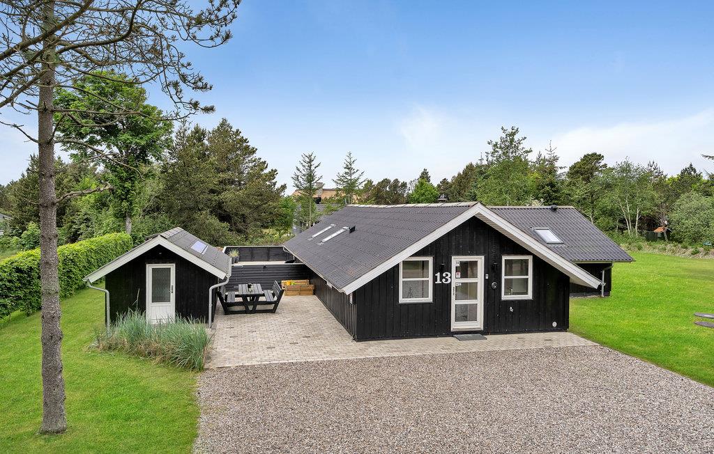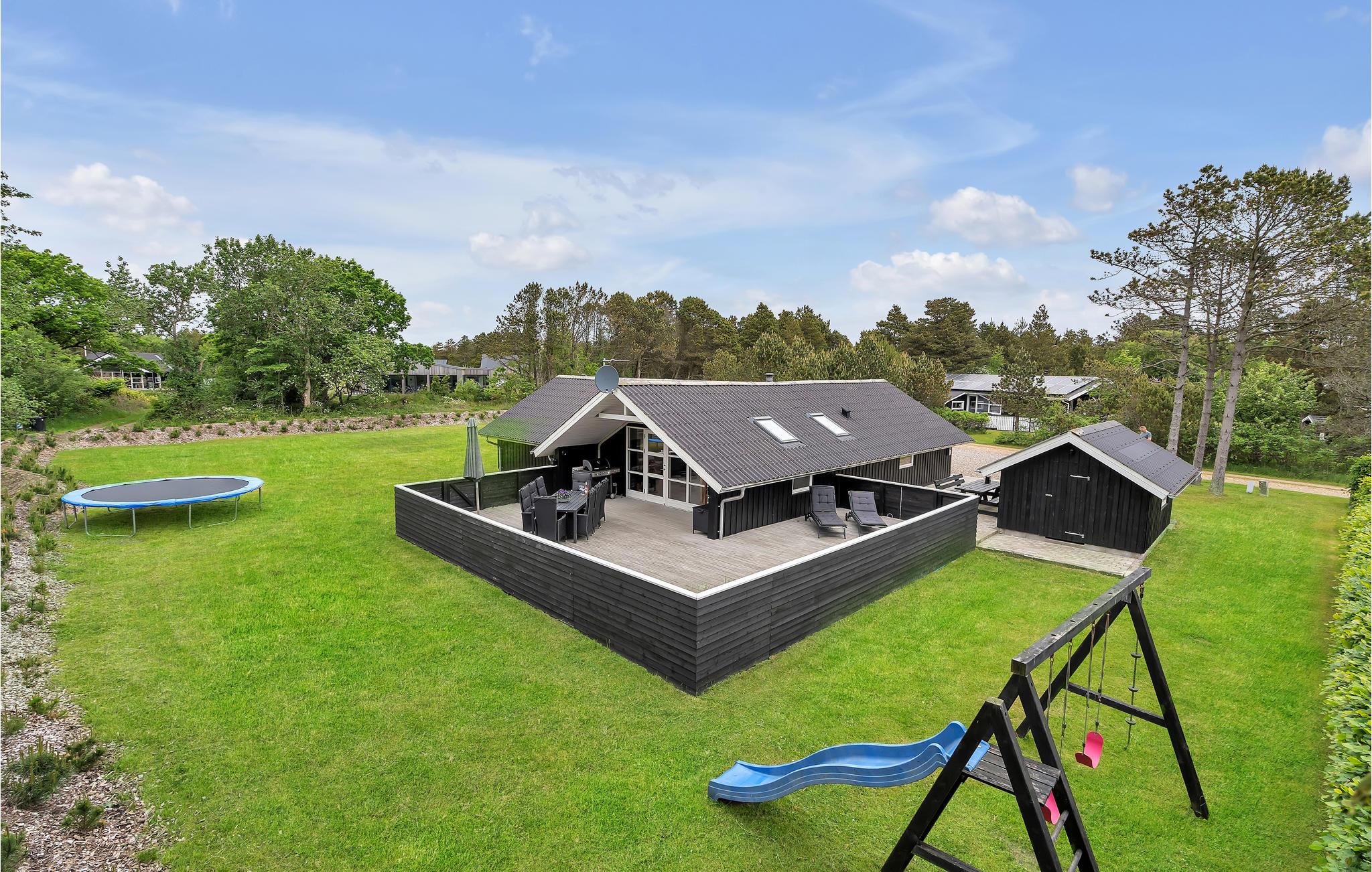 Hyggeligt feriehus i Blåvand med sauna, spabad og flere terrasser på en lukket naturgrund.