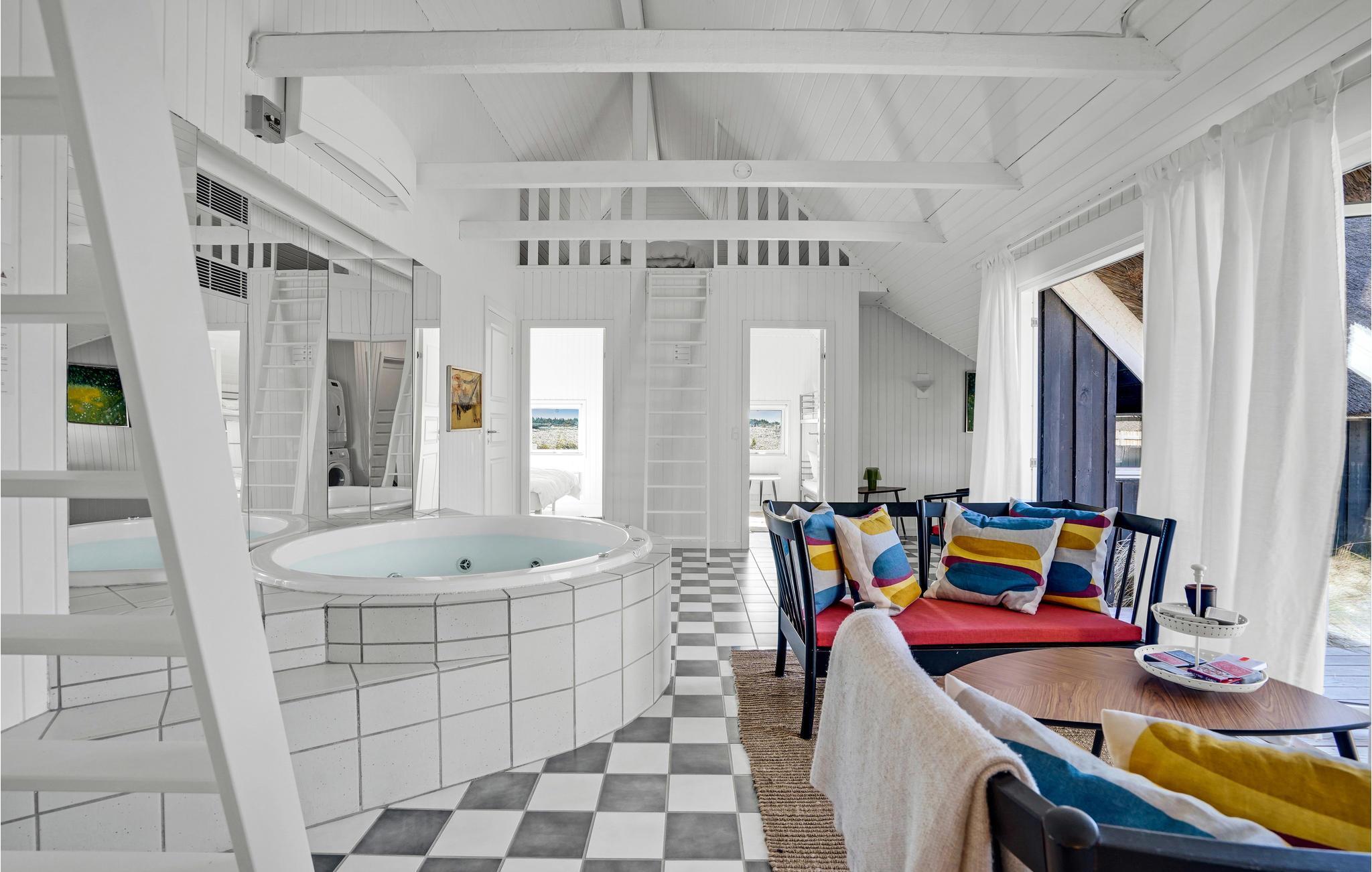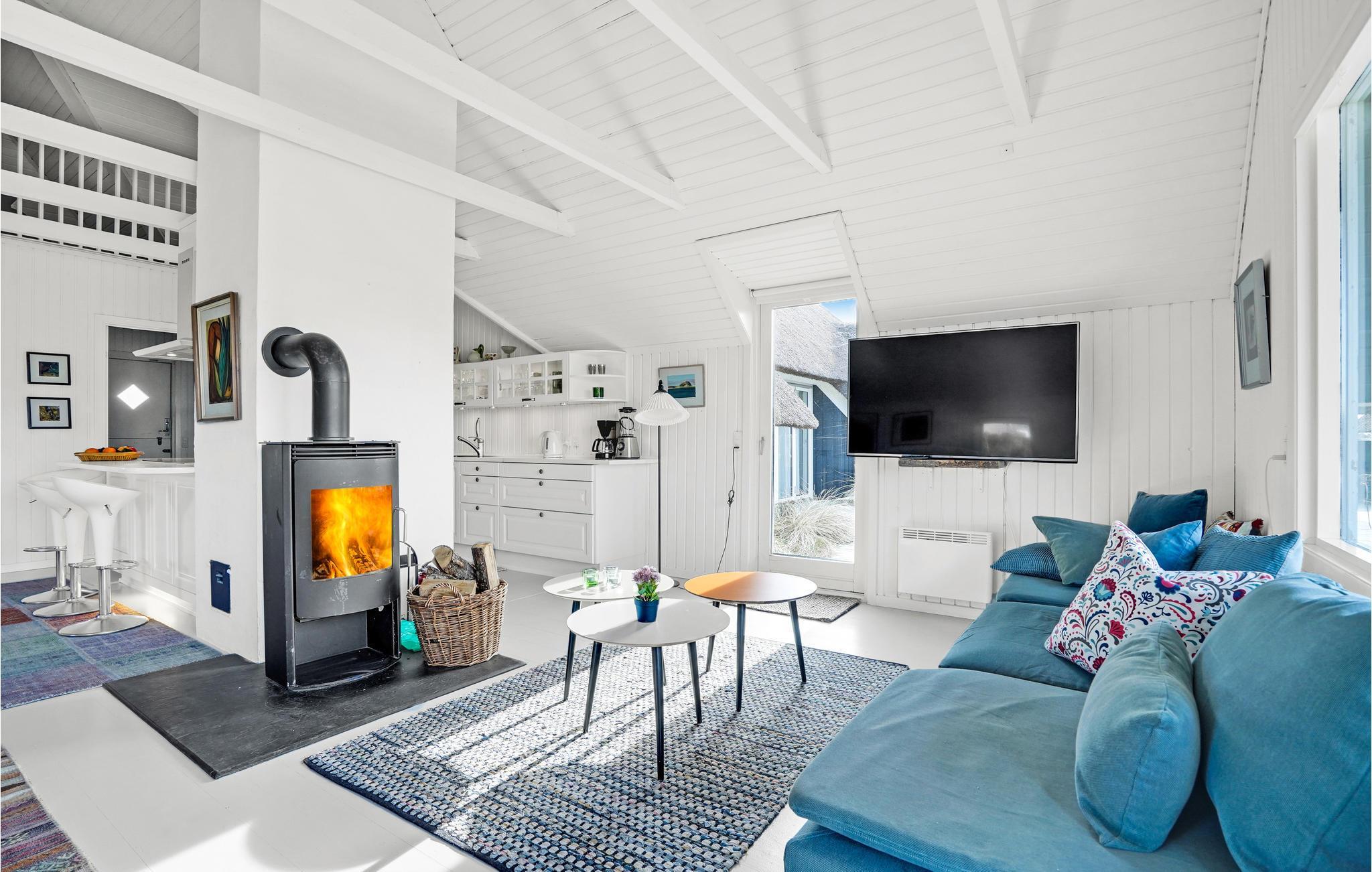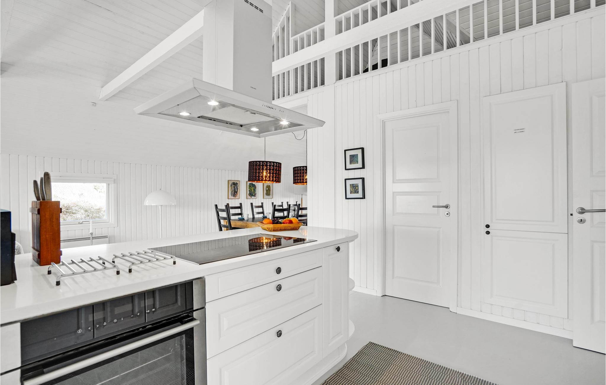 Velkommen til dette utoligt flotte, lyse og smagfuldt indrettede feriehus. Husets hjerte er den rummelige kombinerede spise- og opholdsstue. Her finder I det åbne, veludstyrede køkken, hvor I kan tilberede lækre feriemåltider, en nydelig spiseplads og et yderst elegant og komfortabelt sofaarrangement ved brændeovn og fladskærm, som indbyder til hyggelige filmaftener. Tænd op i brændeovnen, og nyd den varme og hyggelige stemning, den skaber. Huset byder desuden på smukt indrettede badeværelser af høj kvalitet, hyggelige sovepladser under det spidse tag og sidst men ikke mindst både spa og sauna til rendyrket ferieafslapning.
