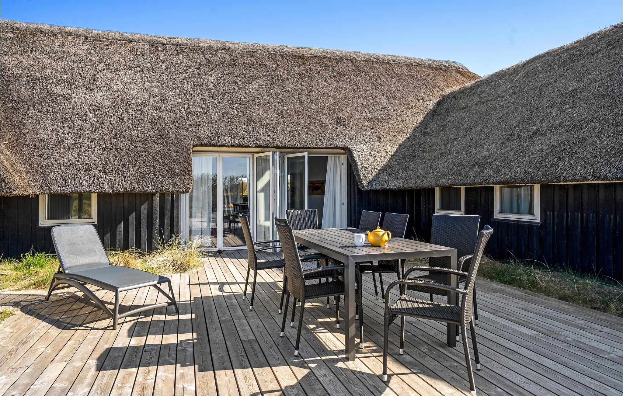 Enestående stråtagshus med spa, sauna og kæmpe terrasse, beliggende dejligt ugenert i et klitlandskab kun 300 m fra sandstranden.